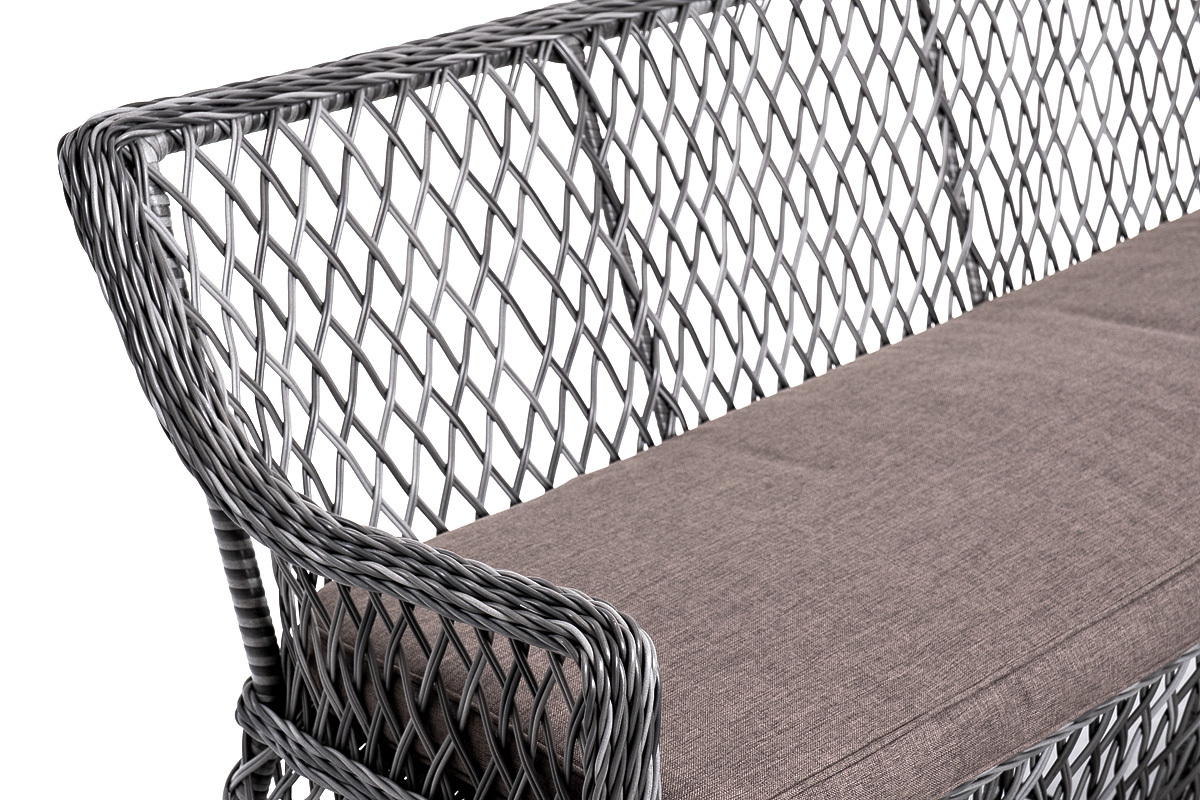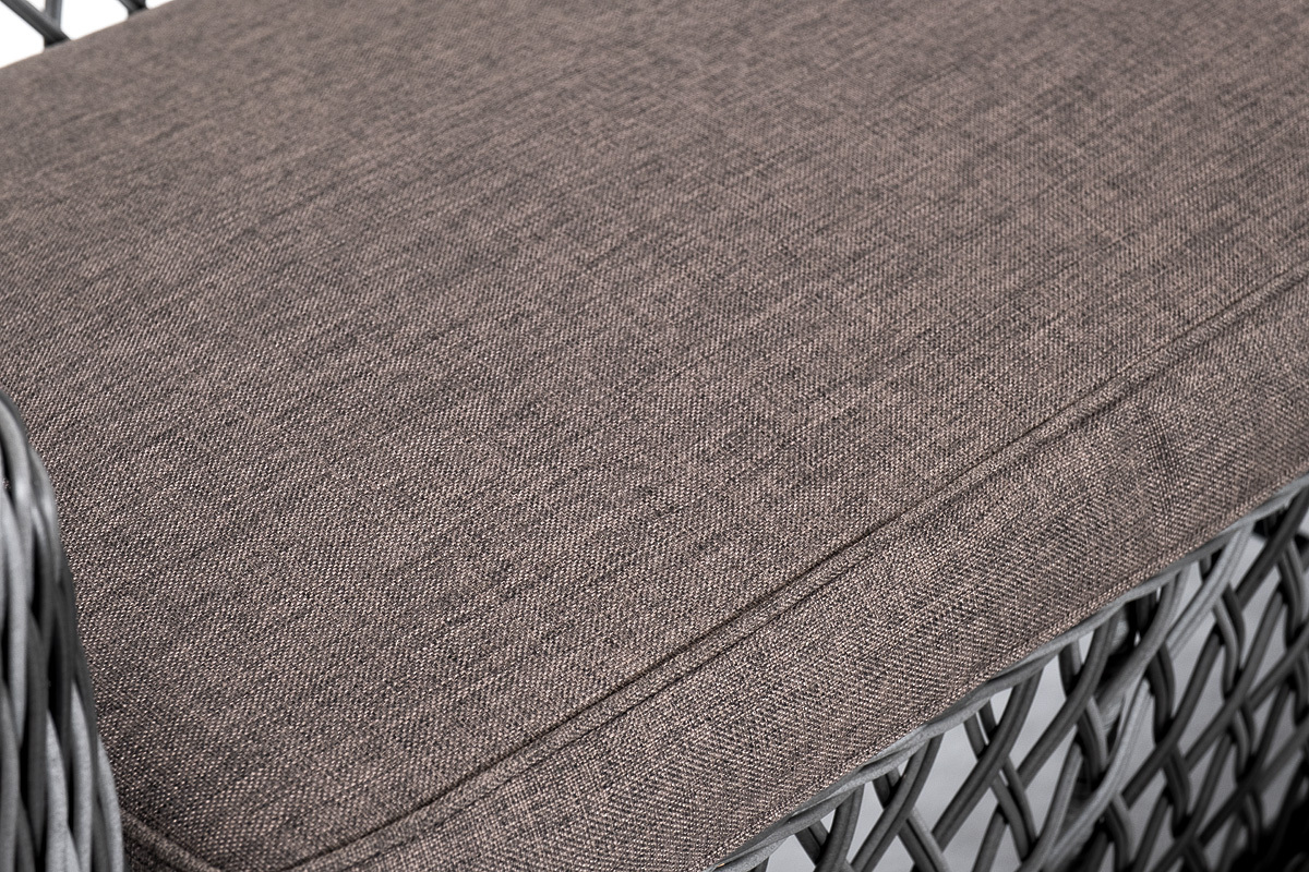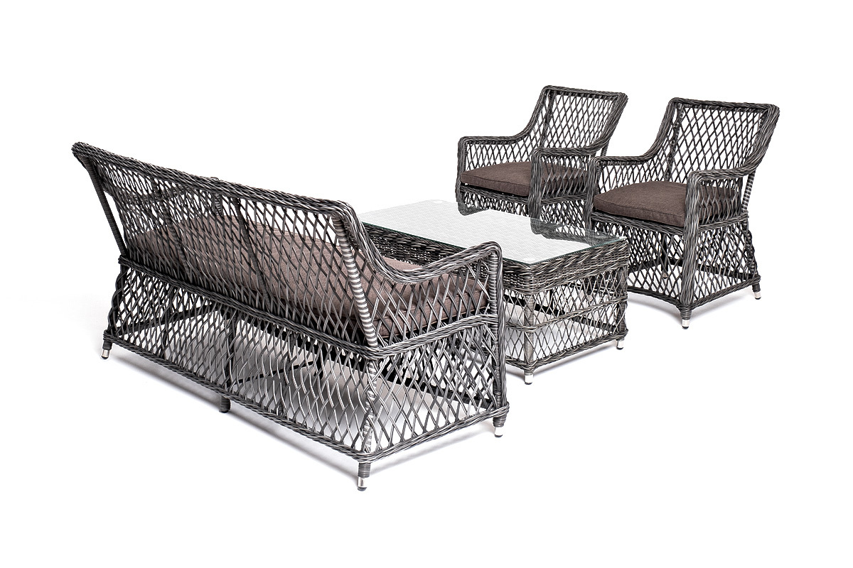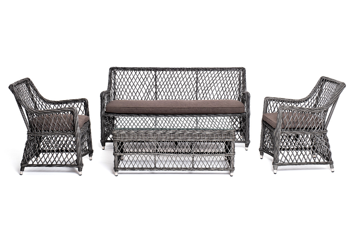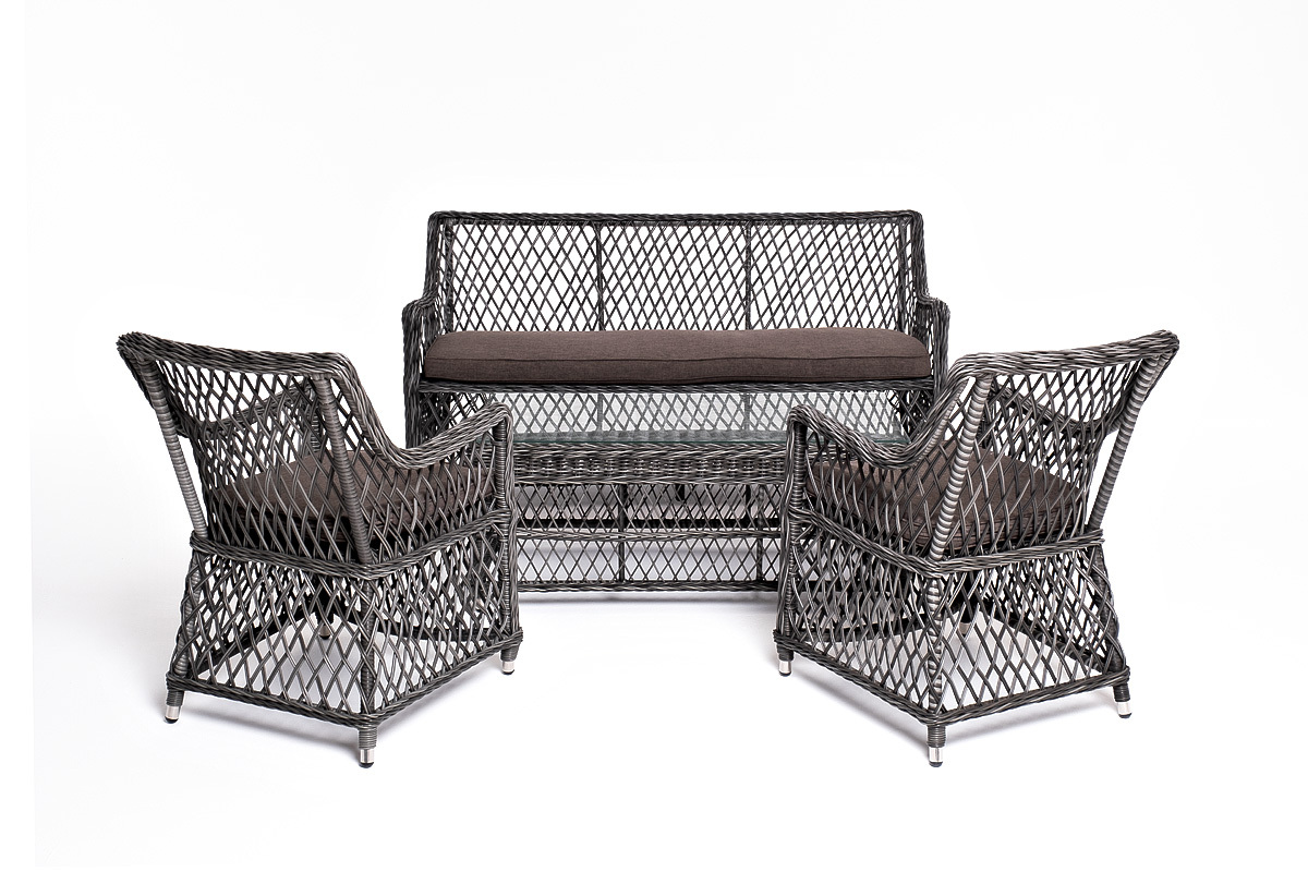 Лаунж-зона «Асти» подходит для размещения четырех персон. За прочность конструкции отвечает каркас из алюминия. В состав входят: – двухместный диван - 1600×660×850 мм. – кресло (2 шт.) - 550×660×850 мм. – журнальный столик - 1120×570×450 мм (толщина стеклянной столешницы в 0,5 см). Оплетка выполнена вручную искусственным ротангом в цвете графит, диван и кресло укомплектованы подушками из 100% полиэстера, которые пропитаны специальным составом, обладающим влагоотталкивающим свойством. “Латте” диван двухместный из искусственного ротанга, цвет графит 1шт. 1 600Х660Х850, “Латте” плетеное кресло из искусственного ротанга, цвет графит 2шт. 550Х660Х850, “Гранд Латте” стол журнальный из искусственного ротанга, цвет графит 1шт. 1 120Х570Х450,