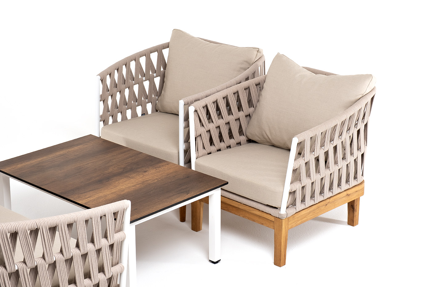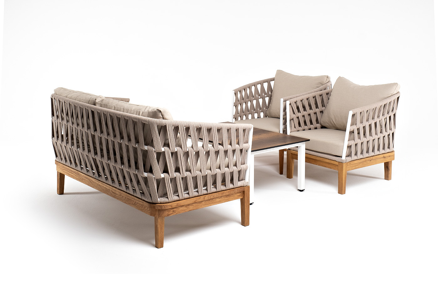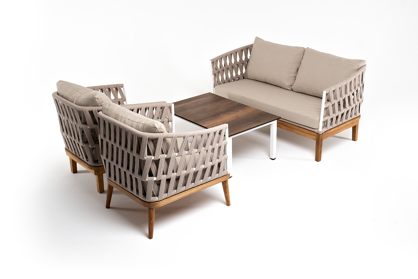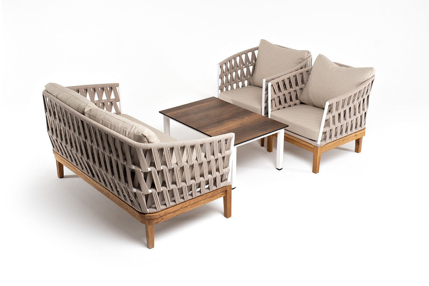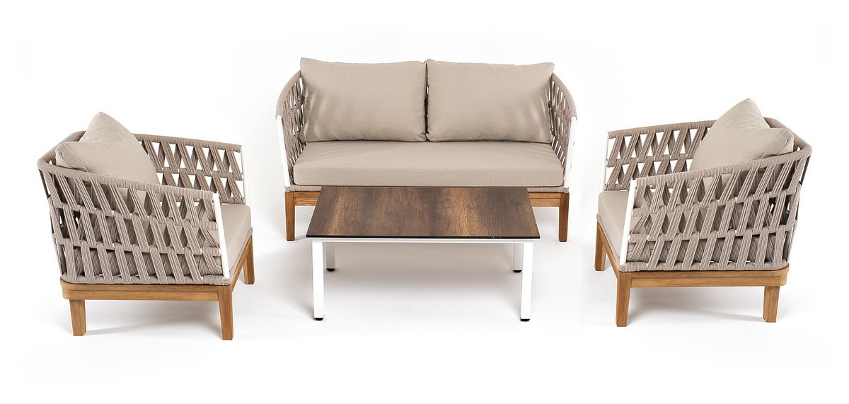 Лаунж-зона «Диего» предназначена для размещения четырех персон. Она включает в себя: - журнальный столик (размер - 950×600×400 мм). - два плетеных кресла (размер - 770×720×800 мм). - двухместный диван (размер - 1580×720×800 мм). Подстолье изготовлено из алюминия, столешница - из высококачественного монолитного компакт-пластик HPL, цвет «дуб». Каркас уличной мебели выполнен из дуба. Его дополняет бежевая оплетка, изготовленная на основе эластичных синтетических лент из полиэфирных волокон высокой прочности. Кресла и диван идут в комплекте с мягкими подушками в чехлах. бежевого цвета. “Диего” диван 2-местный плетеный из роупа, основание дуб, каркас алюминий светло-серый (RAL7035) шагрень, роуп бежевый круглый, ткань бежевая 052 1шт. 1 580Х720Х800, “Диего” кресло плетеное из роупа, основание дуб, каркас алюминий светло-серый (RAL7035) шагрень, роуп бежевый круглый, ткань бежевая 052 2шт. 770Х720Х800, “Канны” журнальный столик из HPL 95х60, H40, каркас белый, цвет столешницы “дуб” 1шт. 950Х600Х400,