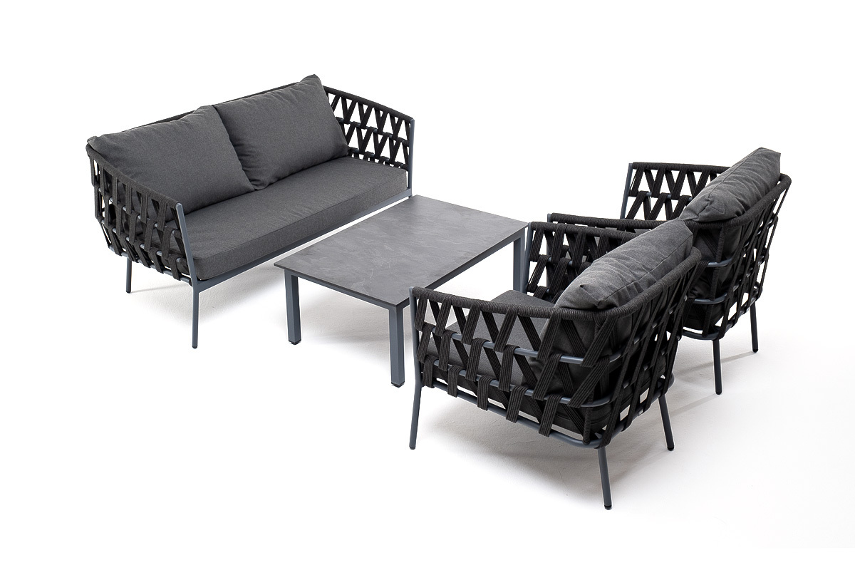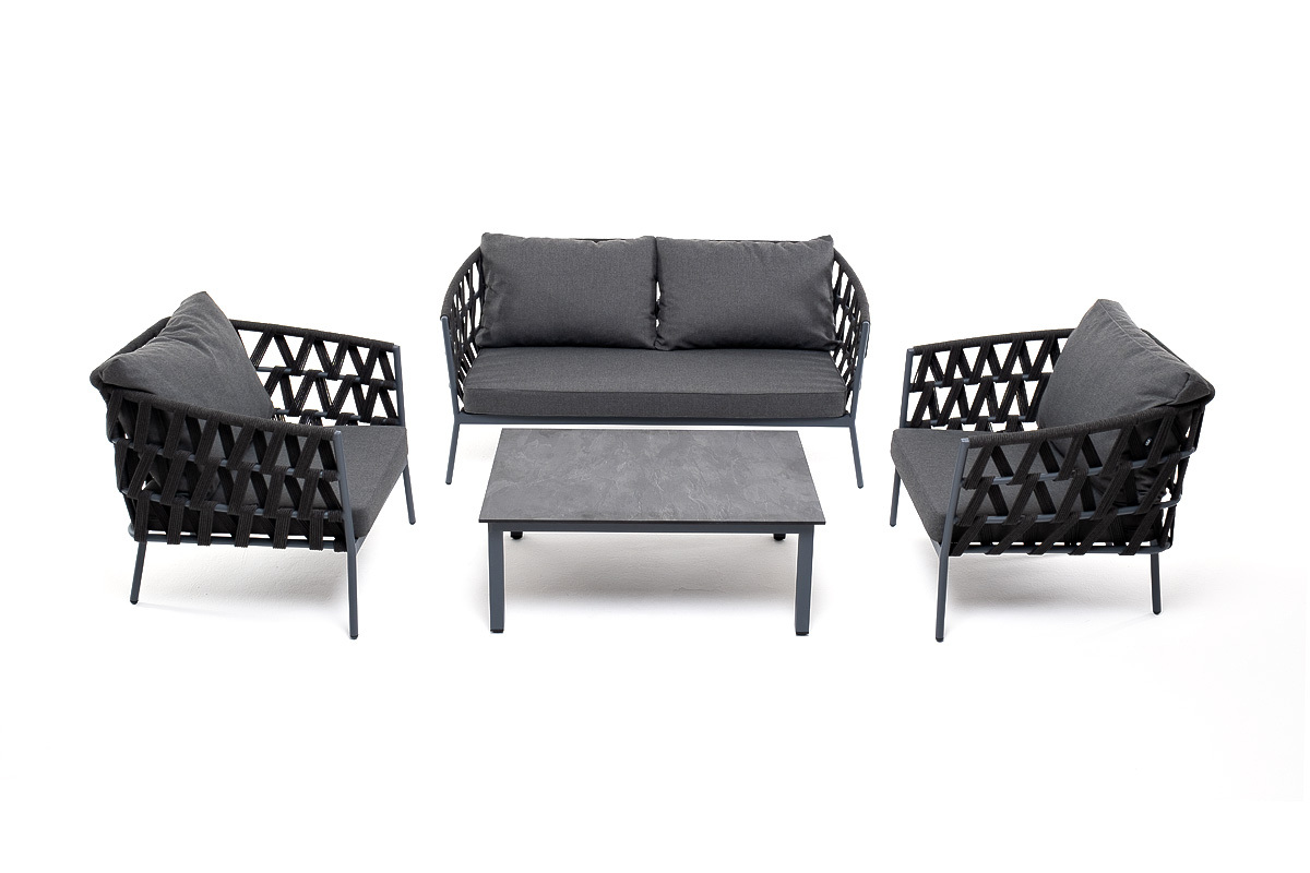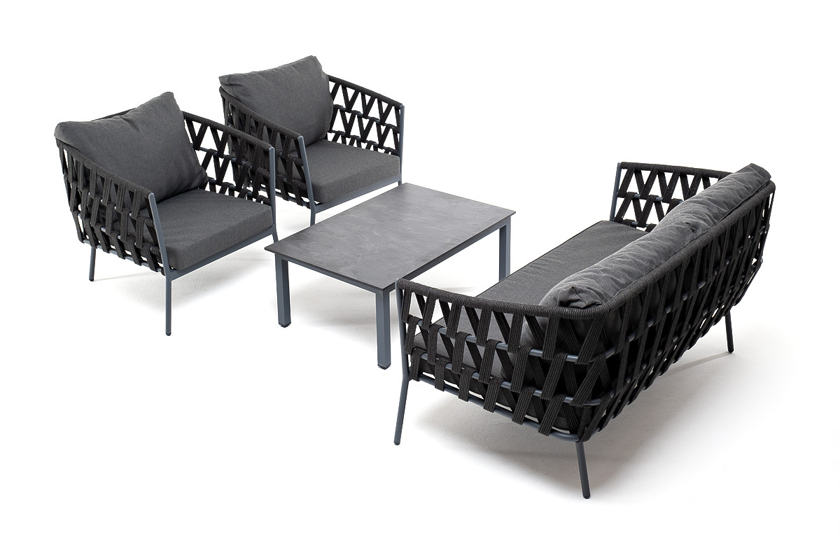 Лаунж-зона «Диего» предназначена для размещения четырех персон. Она включает в себя: - журнальный столик (размер - 950×600×400 мм). - два плетеных кресла (размер - 770×720×770 мм). - двухместный диван (размер - 1580×720×770 мм). Каркас уличной мебели выполнен из износостойкого алюминия. Его дополняет темно-серая ручная оплетка, изготовленная на основе эластичных синтетических лент из полиэфирных волокон высокой прочности (роупа). Кресла и диван идут в комплекте с мягкими подушками в чехлах темно-серого цвета. “Диего” кресло плетеное из роупа, каркас алюминий темно-серый (RAL7024) муар, роуп темно-серый круглый, ткань темно-серая 027 2шт. 770Х720Х770, “Диего” диван 2-местный плетеный из роупа, каркас алюминий темно-серый (RAL7024) муар, роуп темно-серый круглый, ткань темно-серая 027 1шт. 1 580Х720Х770, “Канны” журнальный столик из HPL 95х60, H40, каркас серый (RAL 7024), цвет столешницы “серый гранит” 1шт. 950Х600Х400,