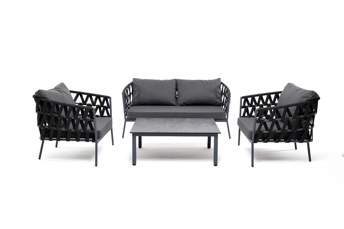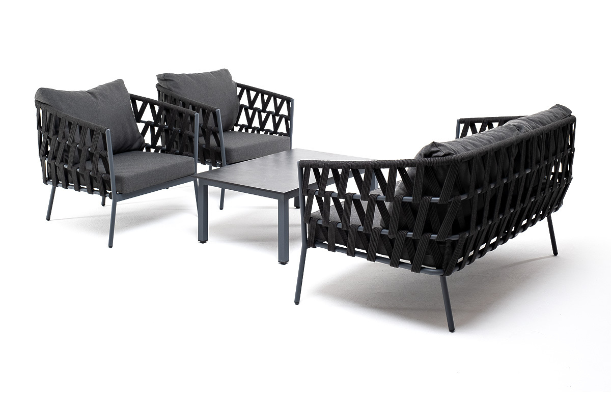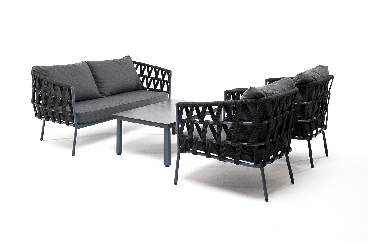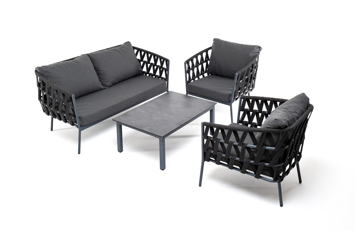 Лаунж-зона «Диего» предназначена для размещения четырех персон. Она включает в себя: - журнальный столик (размер - 950×600×400 мм). - два плетеных кресла (размер - 770×720×770 мм). - двухместный диван (размер - 1580×720×770 мм). Каркас уличной мебели выполнен из износостойкого алюминия. Его дополняет темно-серая ручная оплетка, изготовленная на основе эластичных синтетических лент из полиэфирных волокон высокой прочности (роупа). Кресла и диван идут в комплекте с мягкими подушками в чехлах темно-серого цвета. “Диего” кресло плетеное из роупа, каркас алюминий темно-серый (RAL7024) муар, роуп темно-серый круглый, ткань темно-серая 027 2шт. 770Х720Х770, “Диего” диван 2-местный плетеный из роупа, каркас алюминий темно-серый (RAL7024) муар, роуп темно-серый круглый, ткань темно-серая 027 1шт. 1 580Х720Х770, “Канны” журнальный столик из HPL 95х60, H40, каркас серый (RAL 7024), цвет столешницы “серый гранит” 1шт. 950Х600Х400,