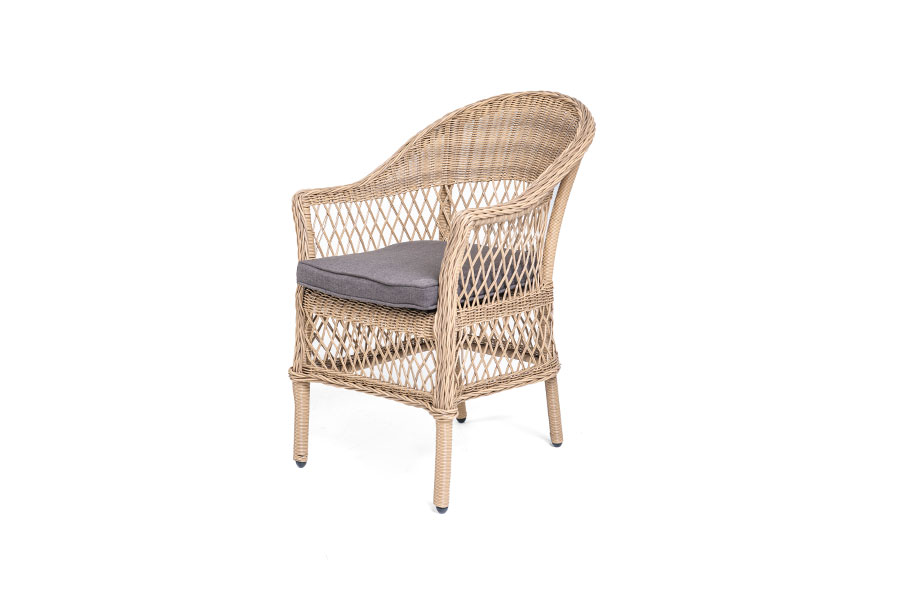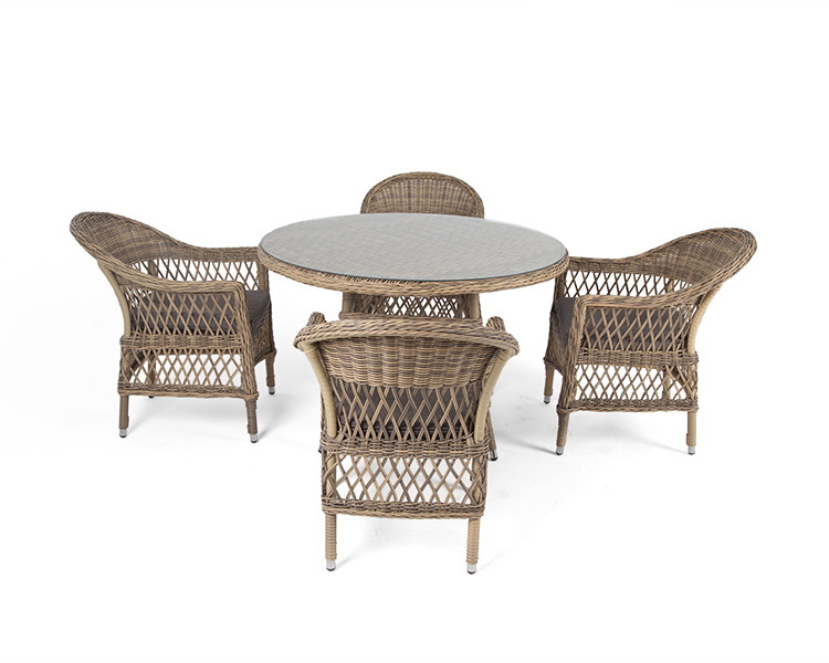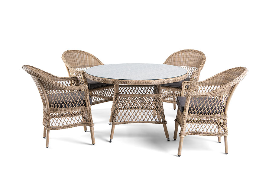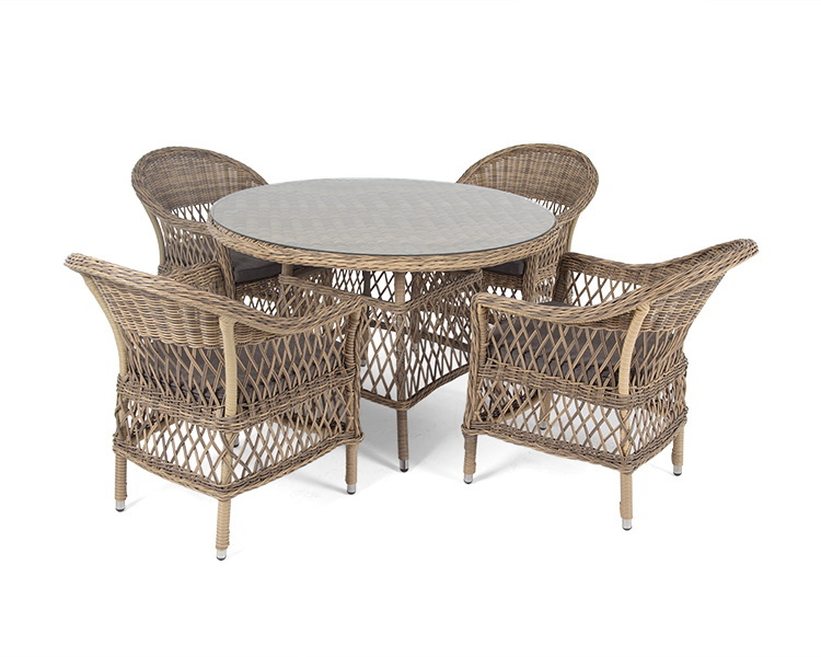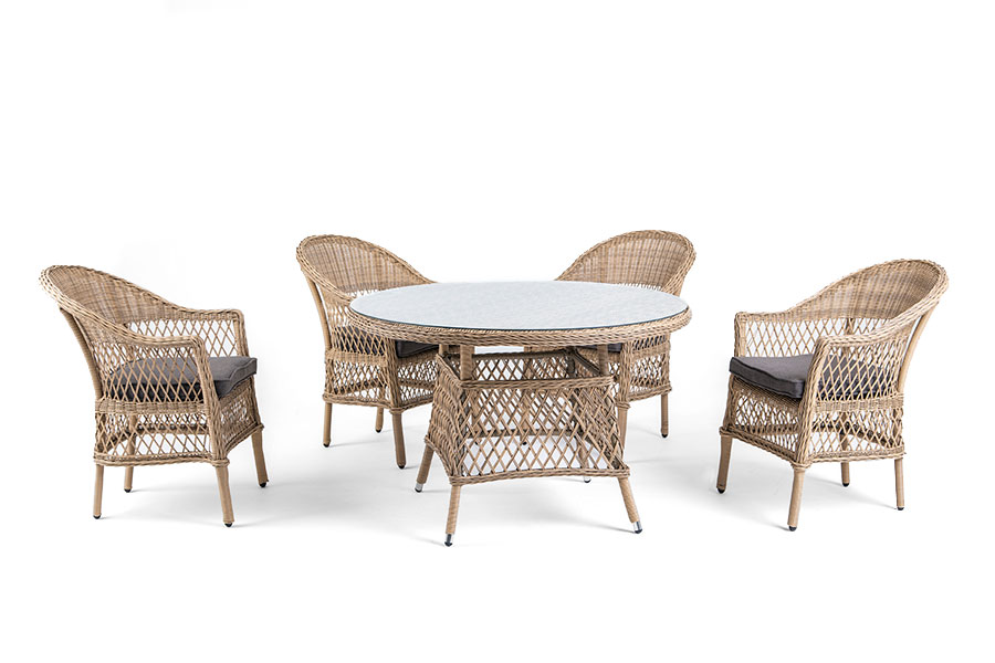 Обеденная группа «Дольче» дает возможность обустроить обеденную зону на открытом дачном участке, веранде или беседке. Она включает в себя: - стол «Эспрессо», размером – 1180×1180×750 мм. - четыре стула «Силиция», размер одного стула – 590×640×820 мм. Из алюминия выполнен устойчивый каркас мебели, который задекорирован искусственным ротангом круглого ручного плетения. Комплект представлен в соломенном цвете. Стулья укомплектованы мягкими подушками. Их защищают съемные чехлы из полиэстера, цвет – серо-коричневый. Материал имеет плотность 230гр/м2 и проходит обработку влагоотталкивающими составами. Обеденный стол дополняет рабочая поверхность, сделанная из прочного стекла. “Сицилия” плетеный стул из искусственного ротанга, цвет соломенный 4шт. 590Х640Х820, “Эспрессо” плетеный круглый стол, диаметр 118 см, цвет соломенный 1шт. 1 180Х1 180Х750,