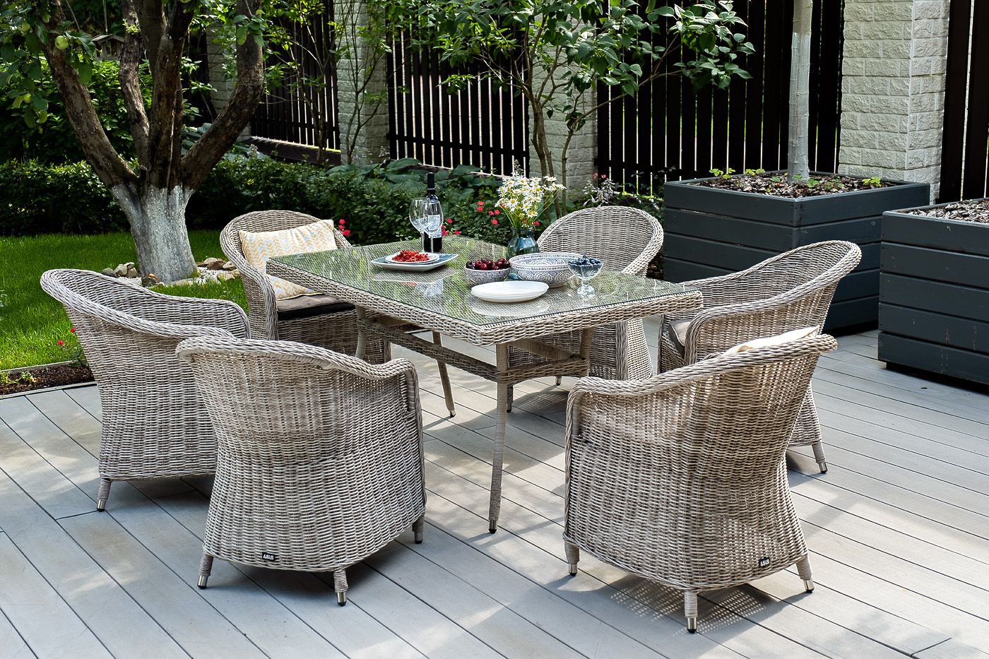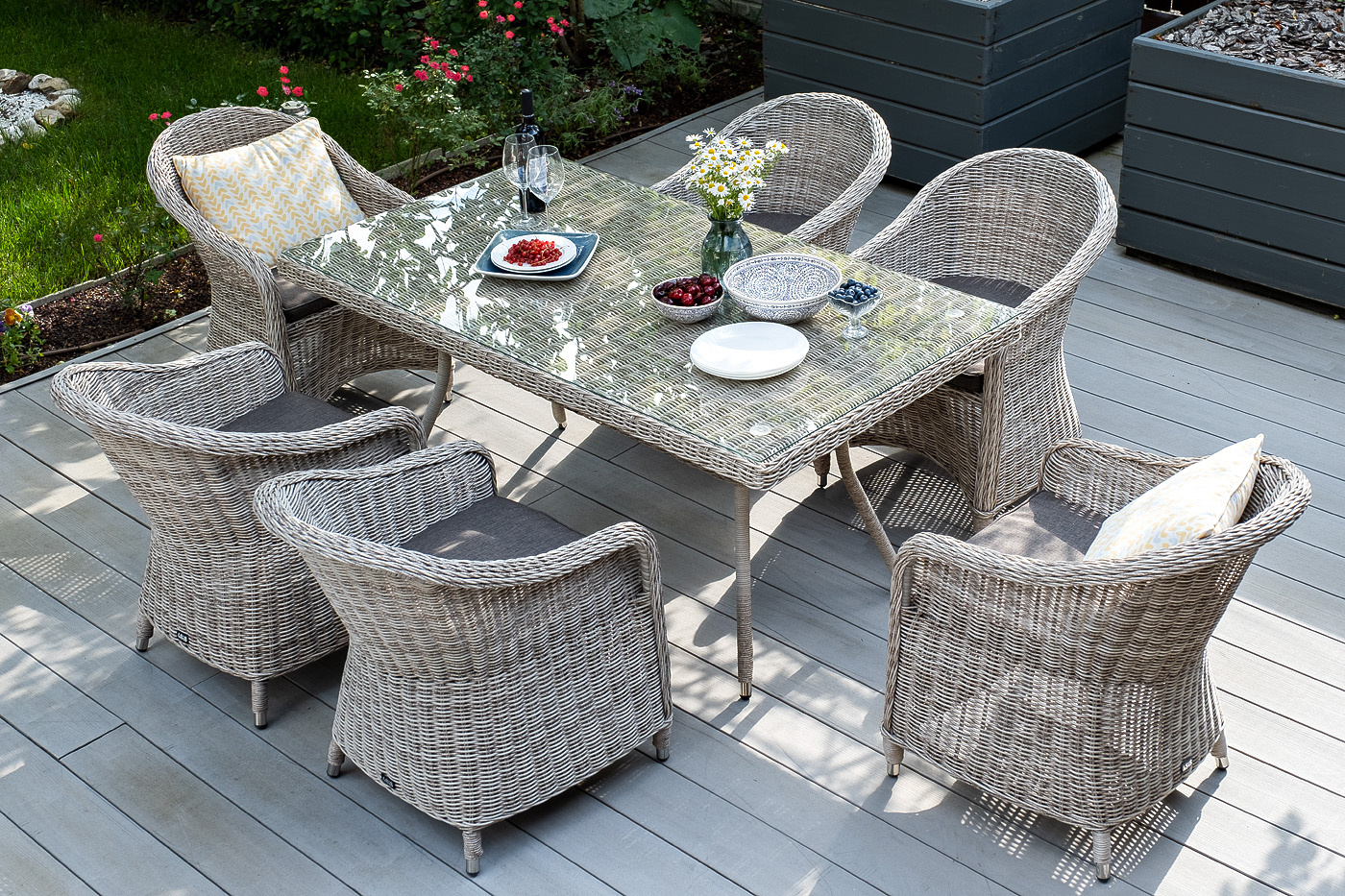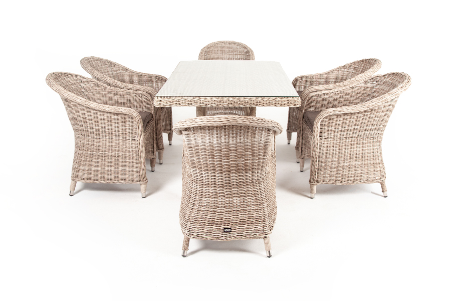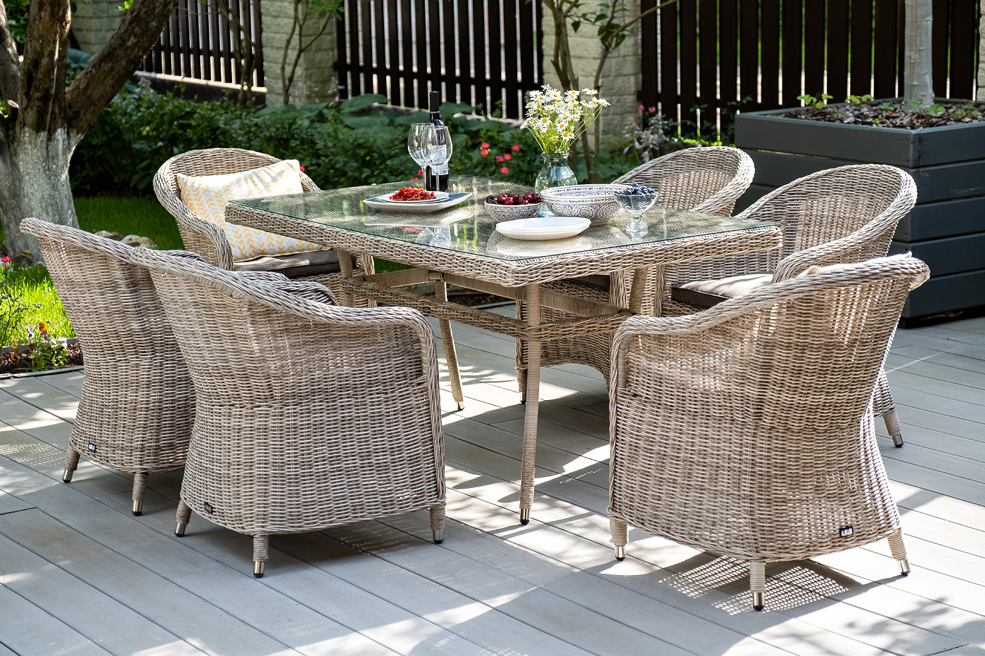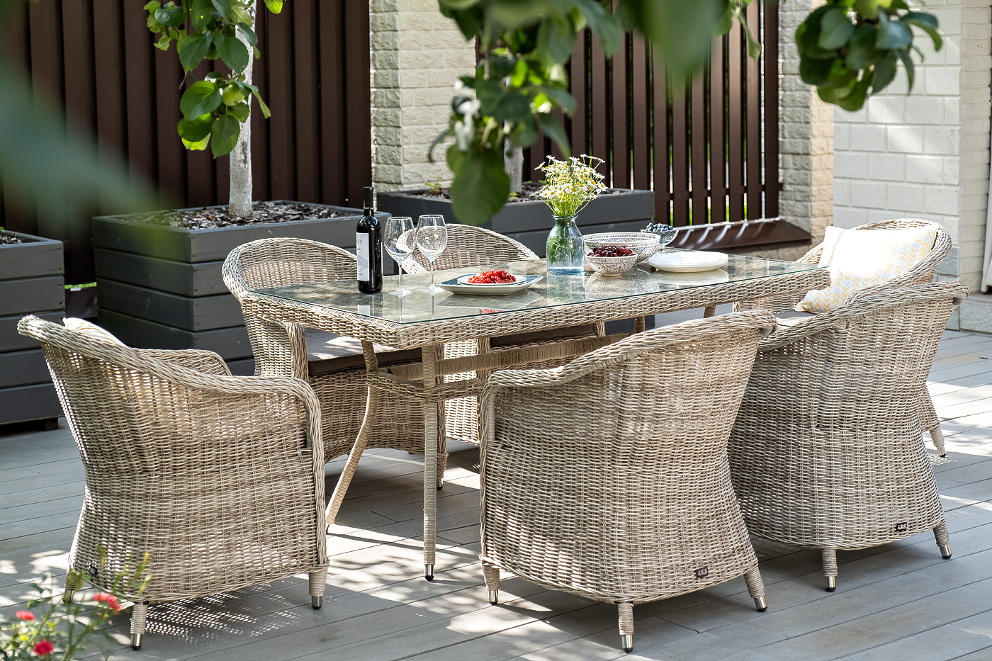 Премиальная обеденная группа «Эспрессо» для большой компании. В набор входит большой прямоугольный стол «Латте», размером - 1600х900х750 мм и 6 кресел «Равенна», размер - 570×680×810 мм, в бежевом оттенке. Каркас всех предметов мебели изготовлен из легкого и прочного алюминия, оплетенного вручную искусственным ротангом. Стол для удобства использования накрыт прочным стеклом, кресла укомплектованы подушками со съемными чехлами серо-коричневого цвета. Вы можете заказать любое количество элементов из данного набора. “Латте” плетеный стол из искусственного ротанга 160х90см, цвет бежевый 1шт. 1 600Х900Х750, “Равенна” плетеное кресло из искусственного ротанга, цвет бежевый 6шт. 570Х680Х810,