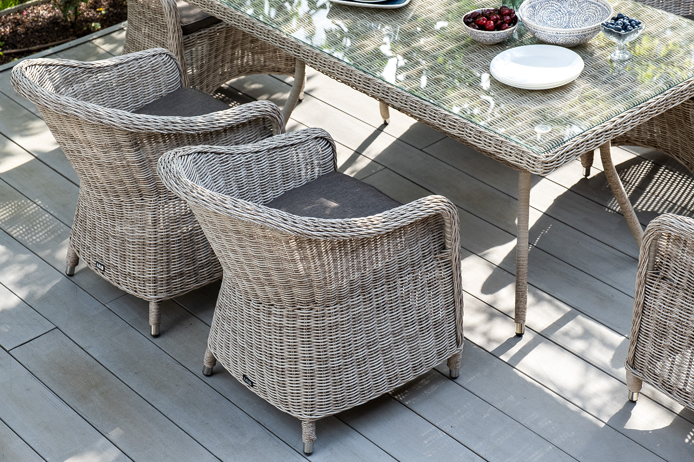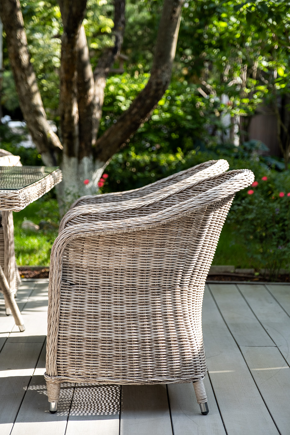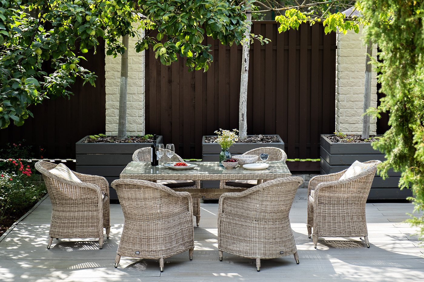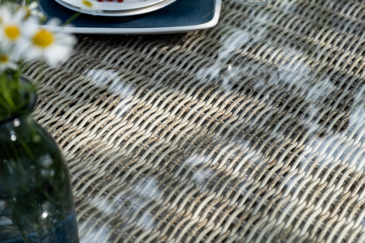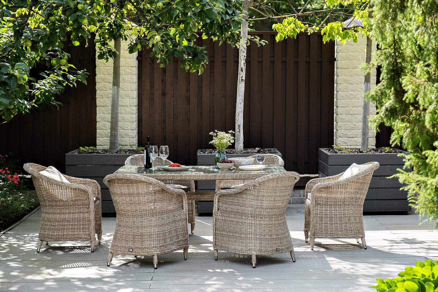 Премиальная обеденная группа «Эспрессо» для большой компании. В набор входит большой прямоугольный стол «Латте», размером - 1600х900х750 мм и 6 кресел «Равенна», размер - 570×680×810 мм, в бежевом оттенке. Каркас всех предметов мебели изготовлен из легкого и прочного алюминия, оплетенного вручную искусственным ротангом. Стол для удобства использования накрыт прочным стеклом, кресла укомплектованы подушками со съемными чехлами серо-коричневого цвета. Вы можете заказать любое количество элементов из данного набора. “Латте” плетеный стол из искусственного ротанга 160х90см, цвет бежевый 1шт. 1 600Х900Х750, “Равенна” плетеное кресло из искусственного ротанга, цвет бежевый 6шт. 570Х680Х810,