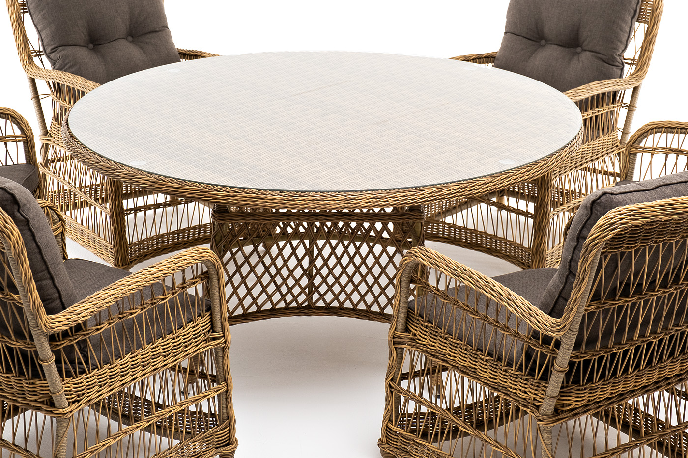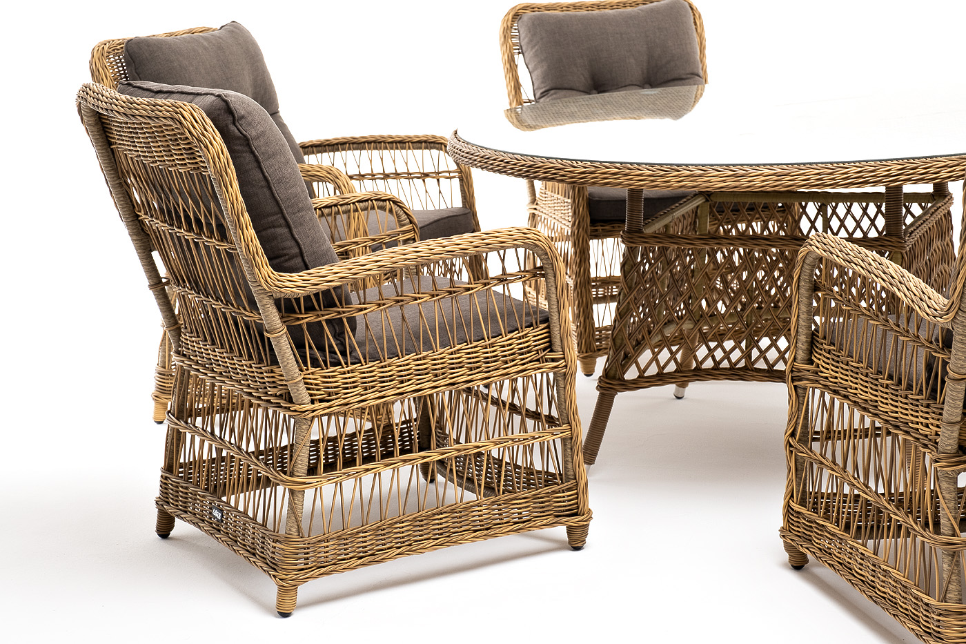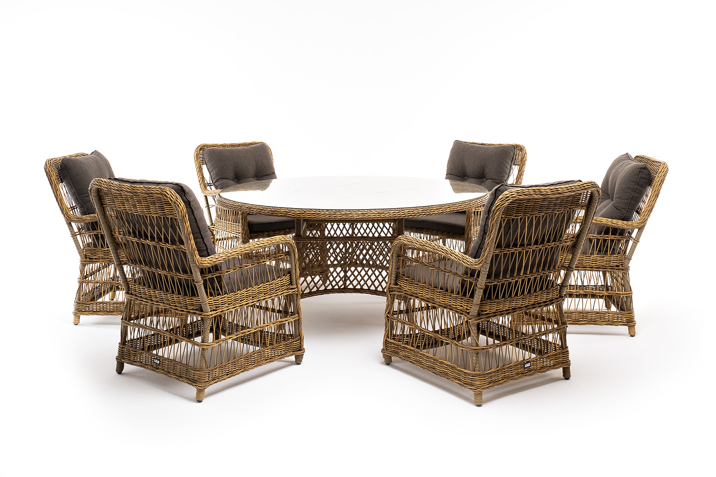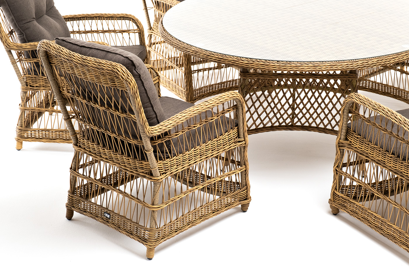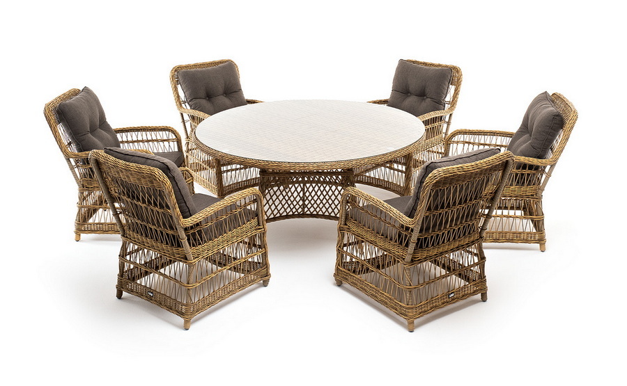 Обеденная группа на 6 персон «Эспрессо» из ротанга. В комплекте: большой круглый обеденный стол (1500×1500×750 мм.) и 6 кресел (600×800×910 мм). Вся мебель изготовлена из долговечного и легкого алюминия, обтянутого синтетическим ротангом. На столе для удобства эксплуатации предусмотрена столешница из ударопрочного закаленного стекла 5 мм. Стулья укомплектованы подушками на сидениях и на спинках. “Эспрессо” плетеный круглый стол, диаметр 150 см, цвет соломенный 1шт. 1 500Х1 500Х750, “Цесена” кресло плетеное из искусственного ротанга, цвет соломенный 6шт. 600Х800Х910,