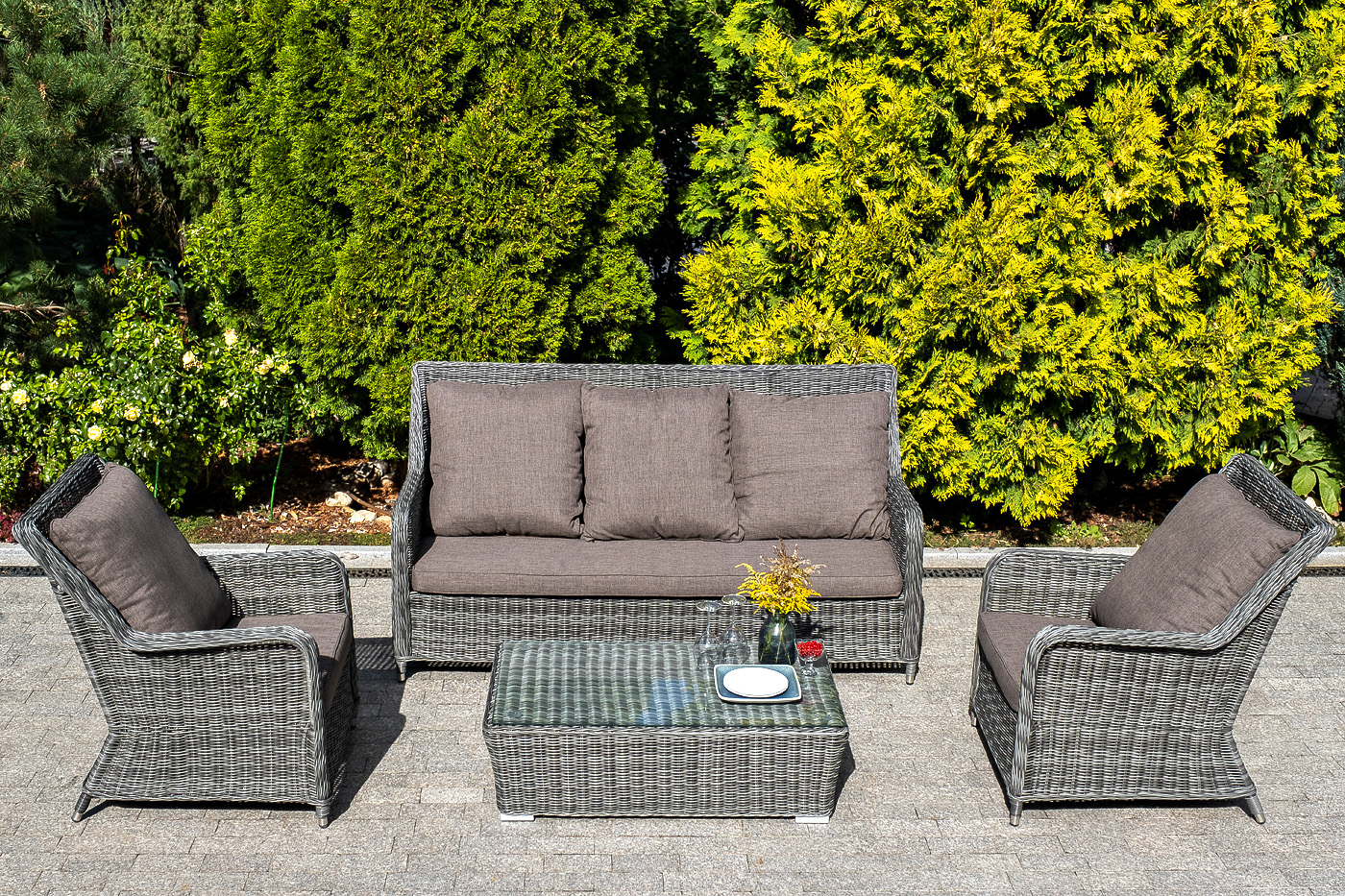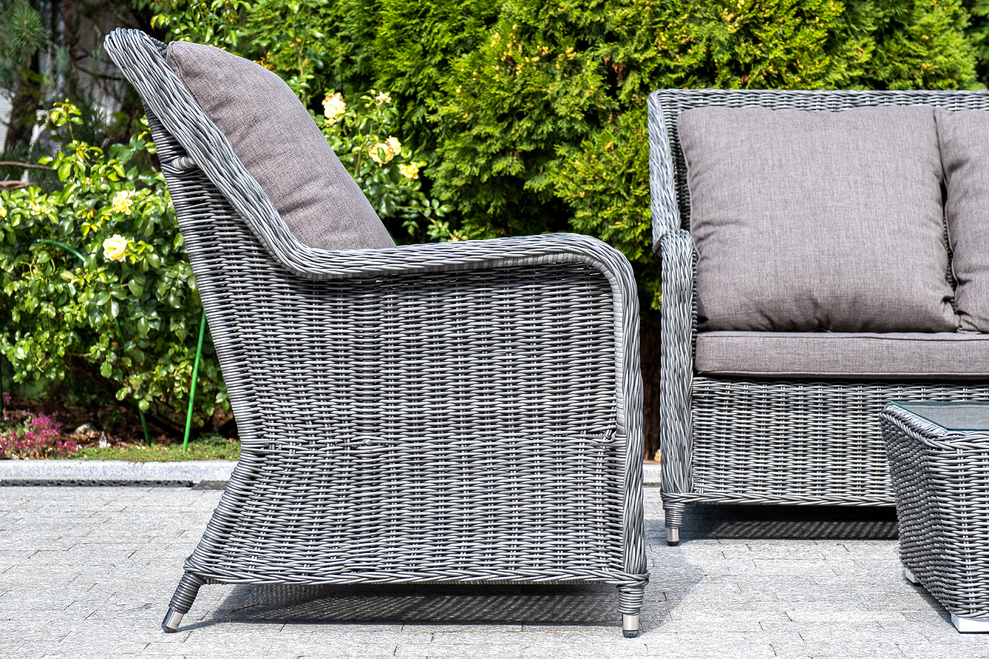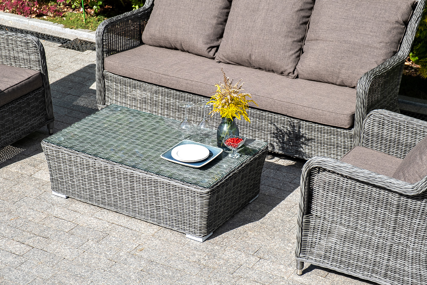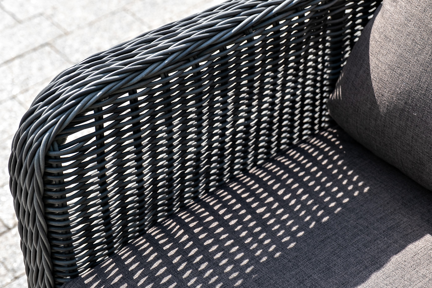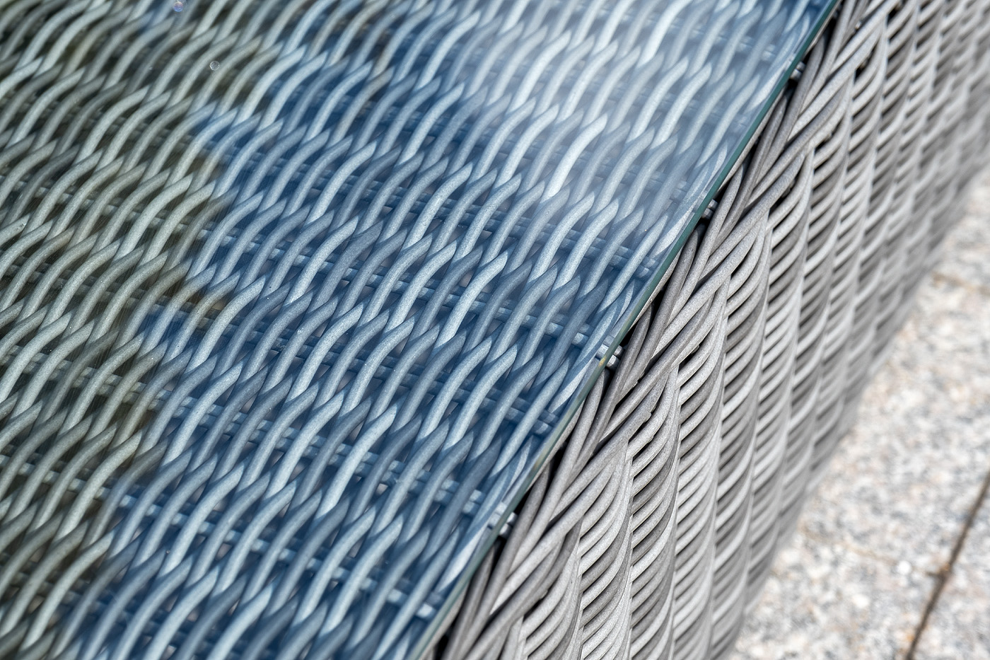 Вместительная лаунж-зона «Гляссе» состоит из: - трехместного дивана – 1900×880×990 мм. - двух кресел – 730×880×990 мм. - журнального столика – 1100×660×340 мм. Модели имеют алюминиевый каркас, который оплетен вручную искусственным ротангом. Плетеная мебель дополнена удобными подушками в серо-коричневых чехлах. При их изготовлении используют полиэстер, плотность – 230гр/м2. Он обрабатывается влагоотталкивающей пропиткой для повышения защитных свойств материала. Журнальный столик оснащен пластиковыми ножками и столешницей из закаленного стекла толщиной 5 мм. “Гляссе” диван трехместный из искусственного ротанга, цвет графит 1шт. 1 900Х880Х990, “Гляссе” кресло плетеное из искусственного ротанга, цвет графит 2шт. 730Х880Х990, “Капучино” журнальный столик из искусственного ротанга, цвет графит 1шт. 1 100Х660Х340,