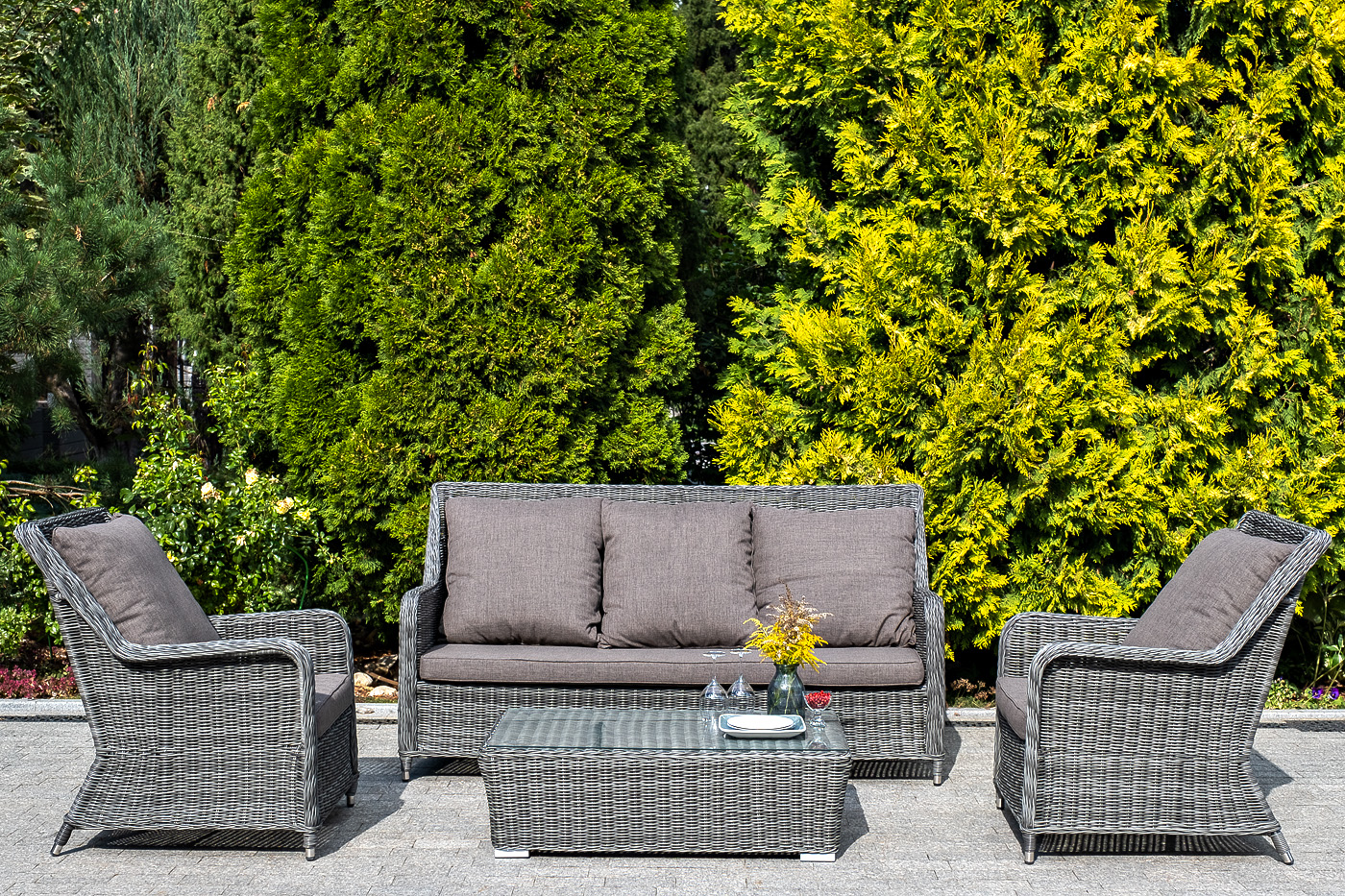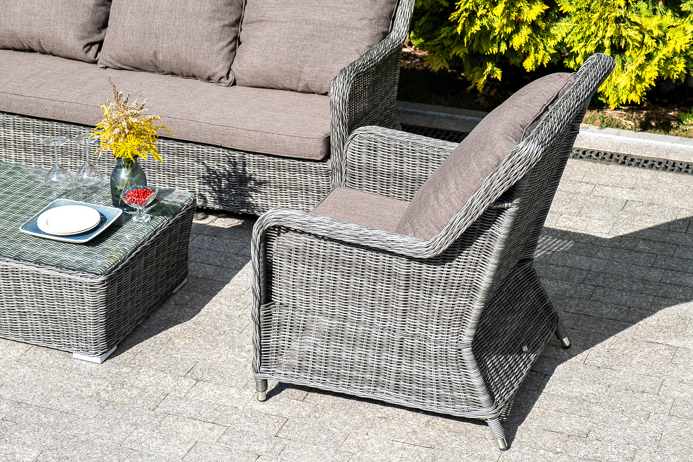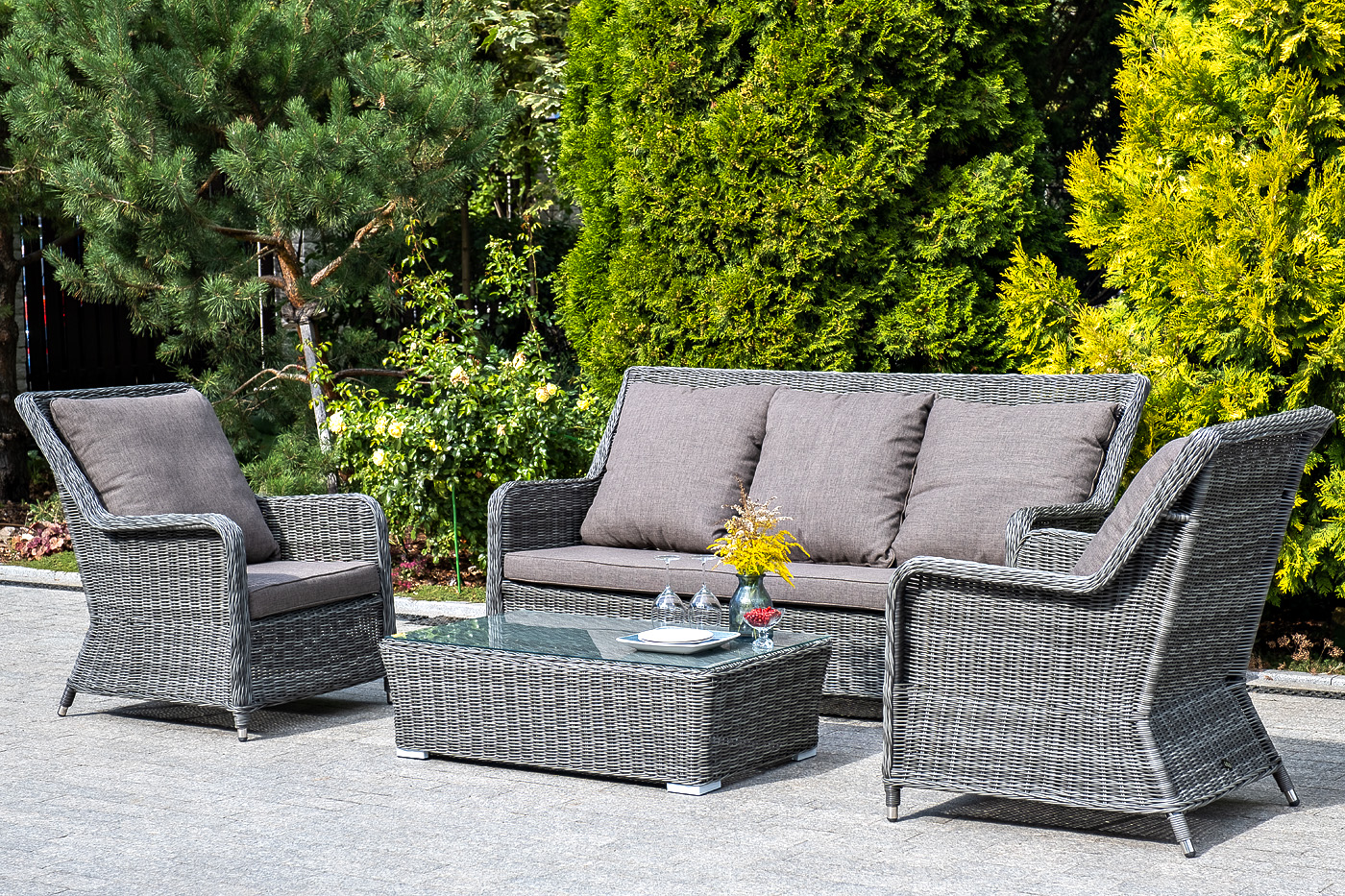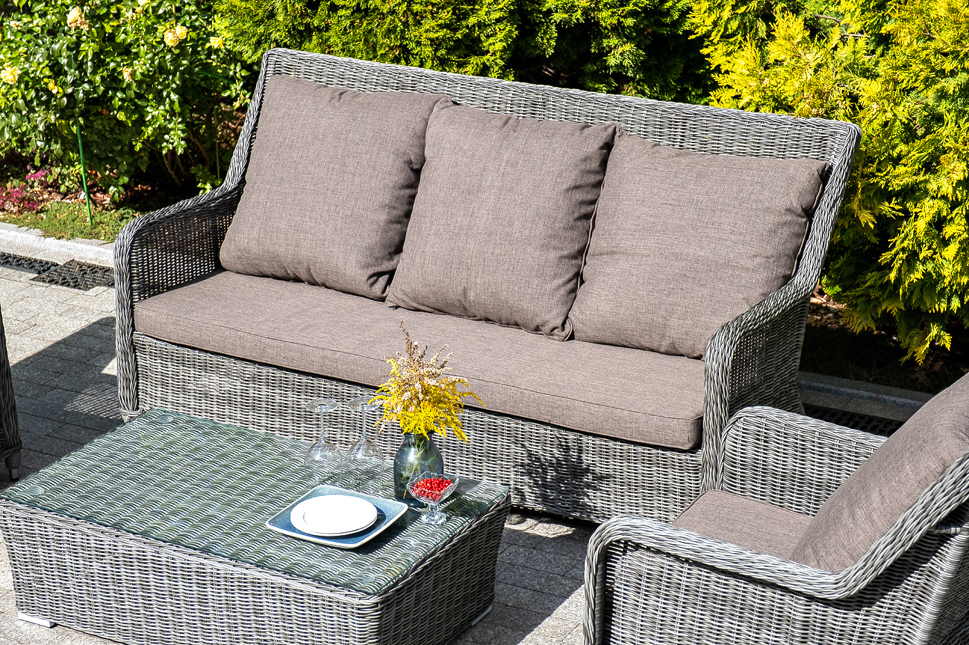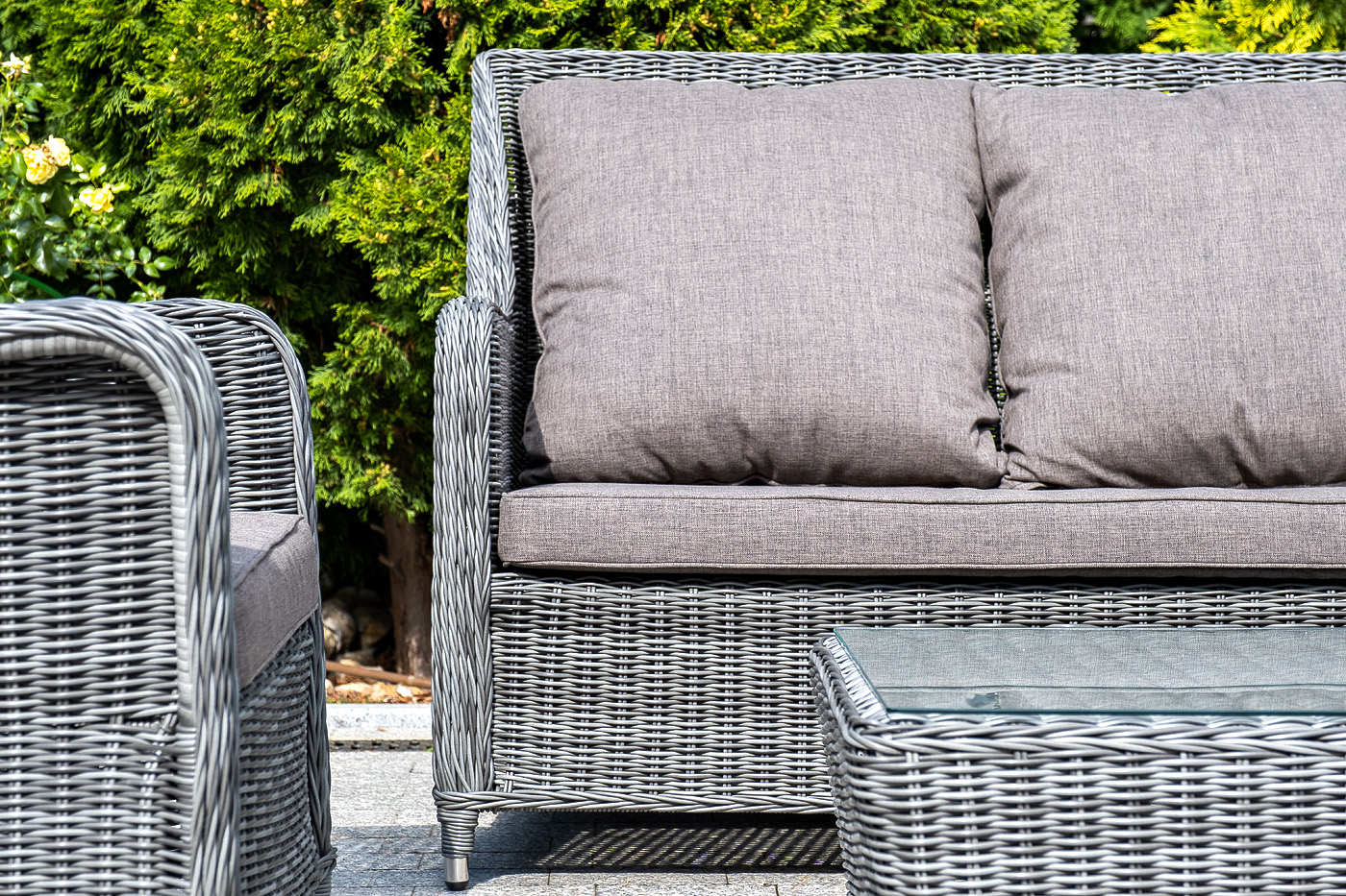 Вместительная лаунж-зона «Гляссе» состоит из: - трехместного дивана – 1900×880×990 мм. - двух кресел – 730×880×990 мм. - журнального столика – 1100×660×340 мм. Модели имеют алюминиевый каркас, который оплетен вручную искусственным ротангом. Плетеная мебель дополнена удобными подушками в серо-коричневых чехлах. При их изготовлении используют полиэстер, плотность – 230гр/м2. Он обрабатывается влагоотталкивающей пропиткой для повышения защитных свойств материала. Журнальный столик оснащен пластиковыми ножками и столешницей из закаленного стекла толщиной 5 мм. “Гляссе” диван трехместный из искусственного ротанга, цвет графит 1шт. 1 900Х880Х990, “Гляссе” кресло плетеное из искусственного ротанга, цвет графит 2шт. 730Х880Х990, “Капучино” журнальный столик из искусственного ротанга, цвет графит 1шт. 1 100Х660Х340,