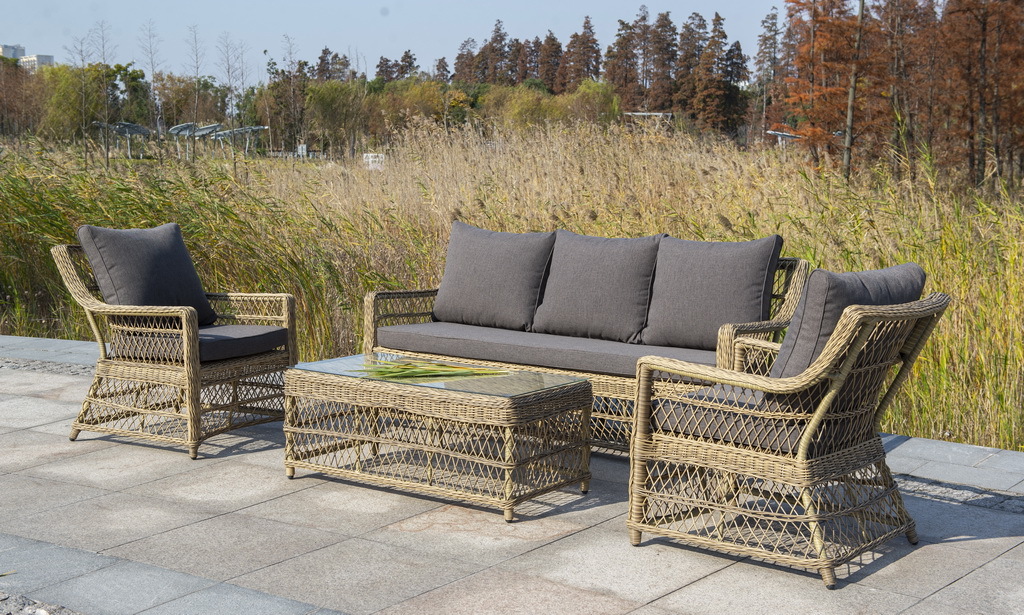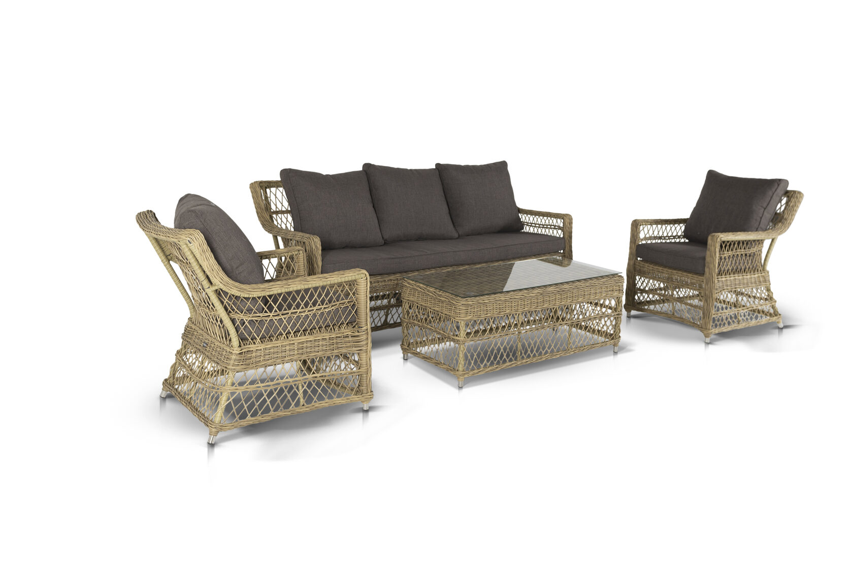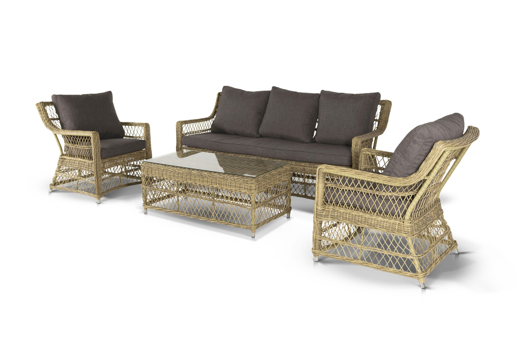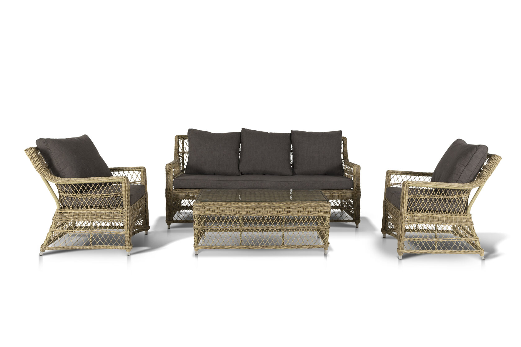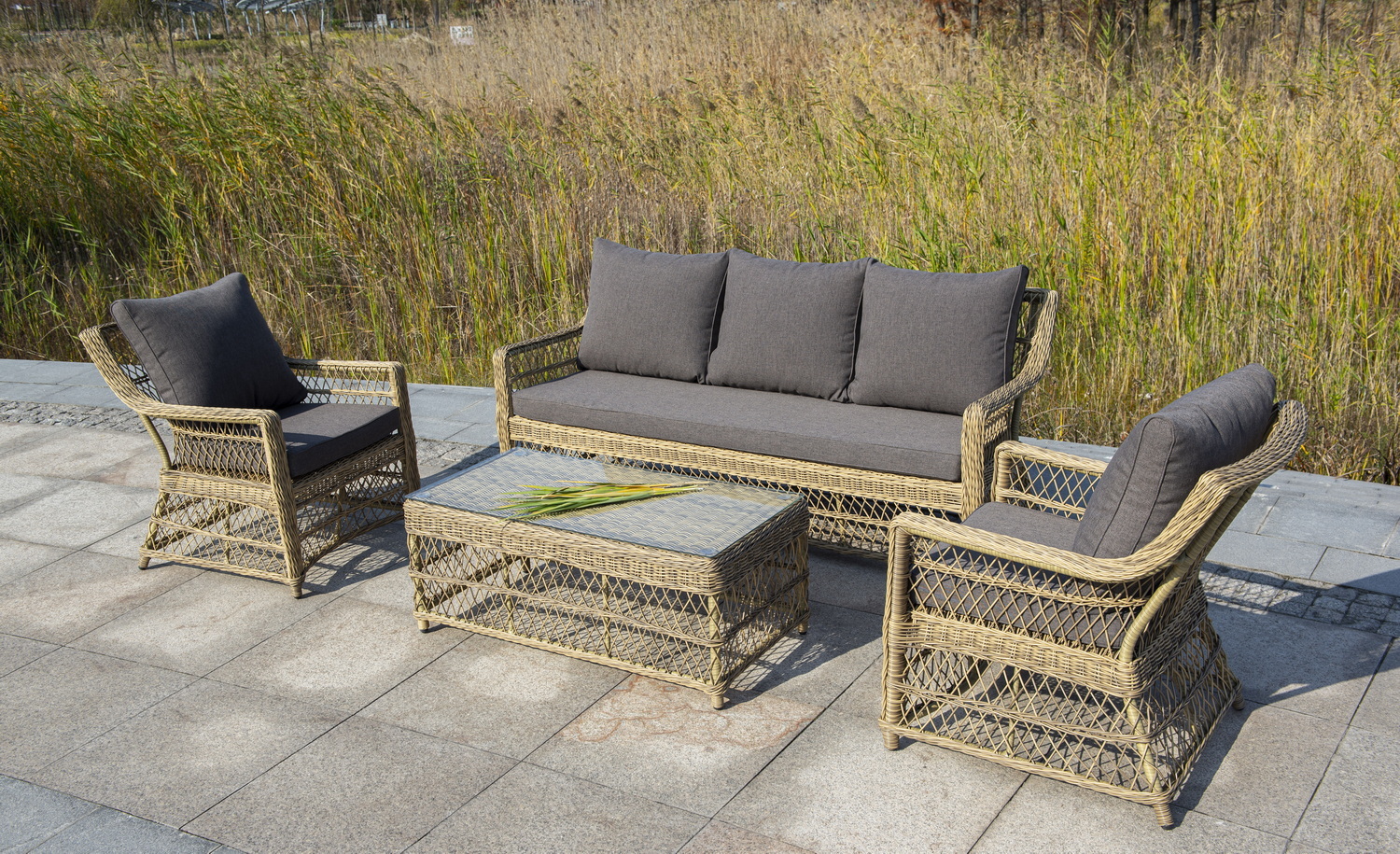 Лаунж-зона «Гранд Латте» включает в себя все необходимое для полноценного отдыха и рассчитана на одновременное размещение пяти персон. Плетеный комплект состоит из: - трехместного дивана, размер – 1875×830×850 мм. - двух кресел, размер – 720×830×850 мм. - журнального столика, размер – 1120×570×450 мм. Уличная мебель имеет алюминиевый каркас. В качестве декоративного элемента предлагается ручное плетение, сделанное из соломенного искусственного ротанга. Предусмотрены мягкие подушки из полиэстера серо-коричневого цвета с плотностью 230гр/м2. Они имеет влагоотталкивающую пропитку. Рабочая поверхность столика изготовлена из закаленного стекла толщиной 5 мм. “Гранд Латте” диван трехместный из искусственного ротанга, цвет соломенный 1шт. 1 875Х830Х850, “Гранд Латте” кресло из искусственного ротанга, цвет соломенный 2шт. 720Х830Х850, “Гранд Латте” стол журнальный из искусственного ротанга, цвет соломенный 1шт. 1 120Х570Х450,