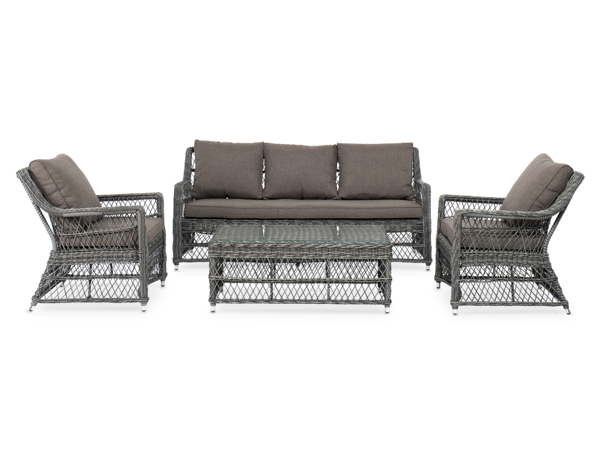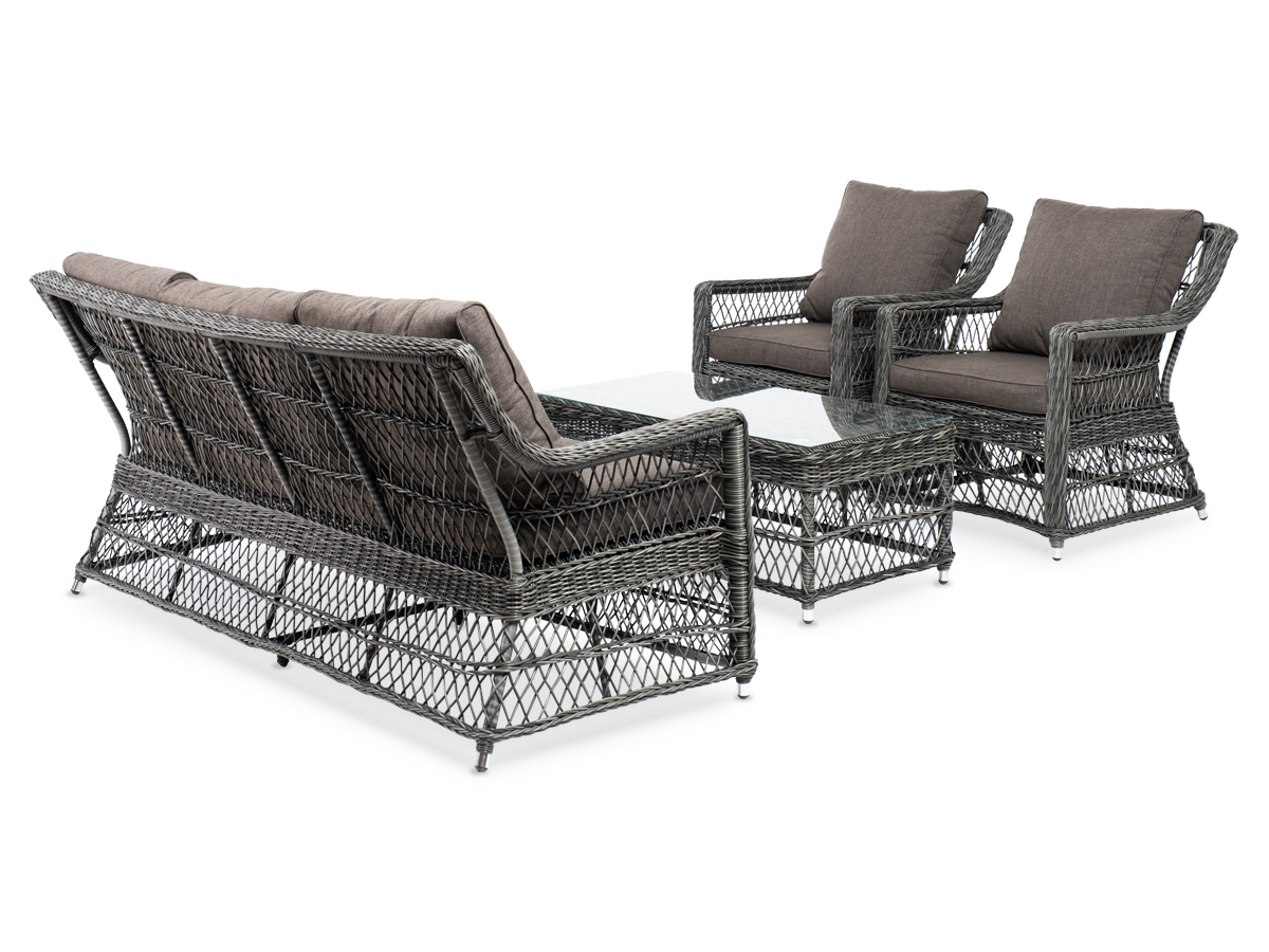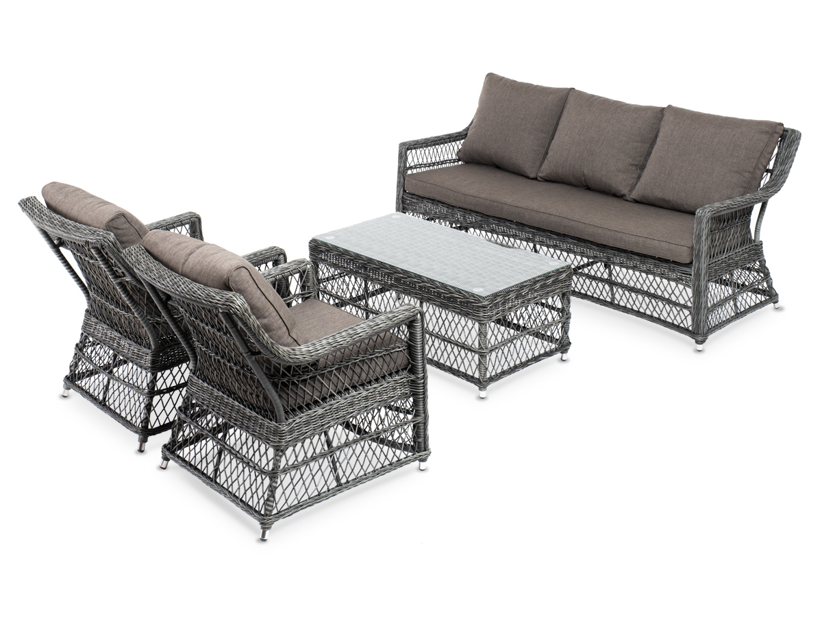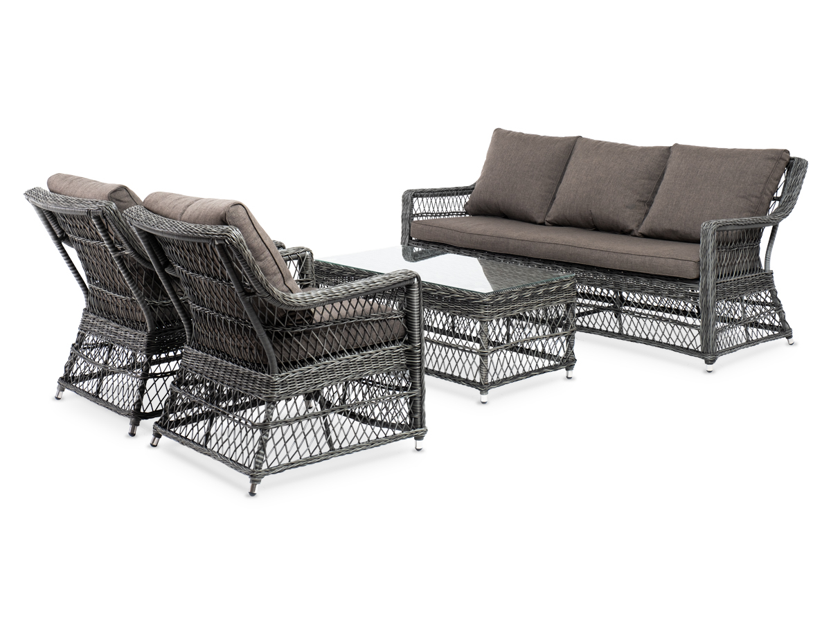 Лаунж-зона «Гранд Латте» включает в себя все необходимое для полноценного отдыха и рассчитана на одновременное размещение пяти персон. Плетеный комплект состоит из: - трехместного дивана, размер – 1875×830×850 мм. - двух кресел, размер – 720×830×850 мм. - журнального столика, размер – 1120×570×450 мм. Уличная мебель имеет алюминиевый каркас с ручным плетением из искусственного ротанга в цвете “графит”. Предусмотрены мягкие подушки из полиэстера серо-коричневого цвета с плотностью 230гр/м2. Они имеет влагоотталкивающую пропитку. Рабочая поверхность столика изготовлена из закаленного стекла толщиной 5 мм. “Гранд Латте” диван трехместный из искусственного ротанга, цвет графит 1шт. 1 875Х830Х850, “Гранд Латте” кресло из искусственного ротанга, цвет графит 2шт. 720Х830Х850, “Гранд Латте” стол журнальный из искусственного ротанга, цвет графит 1шт. 1 120Х570Х450,