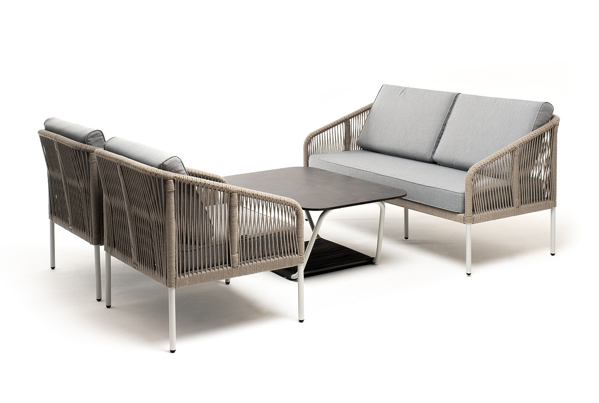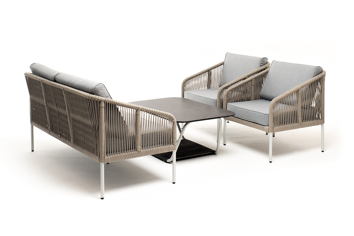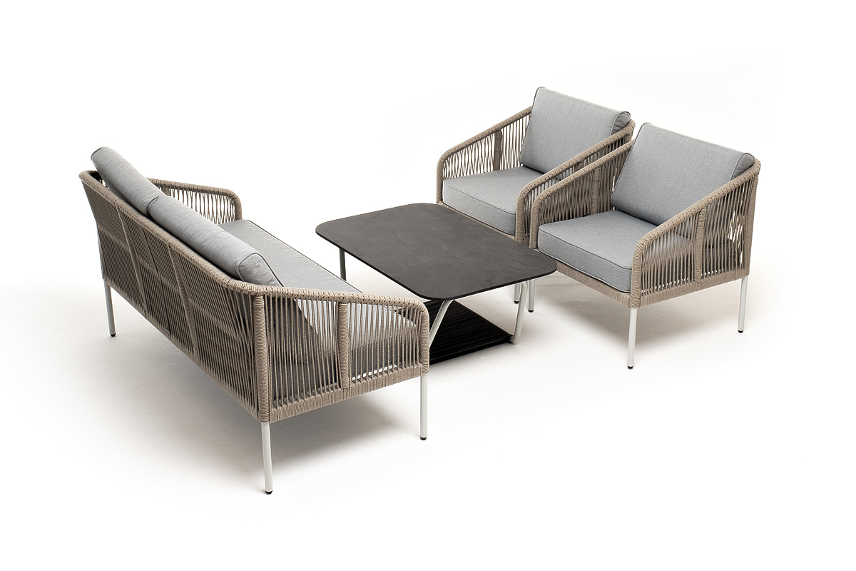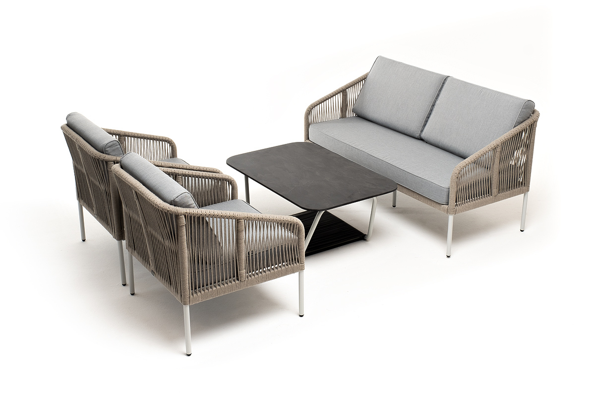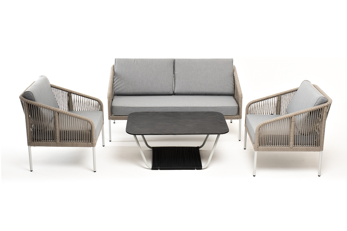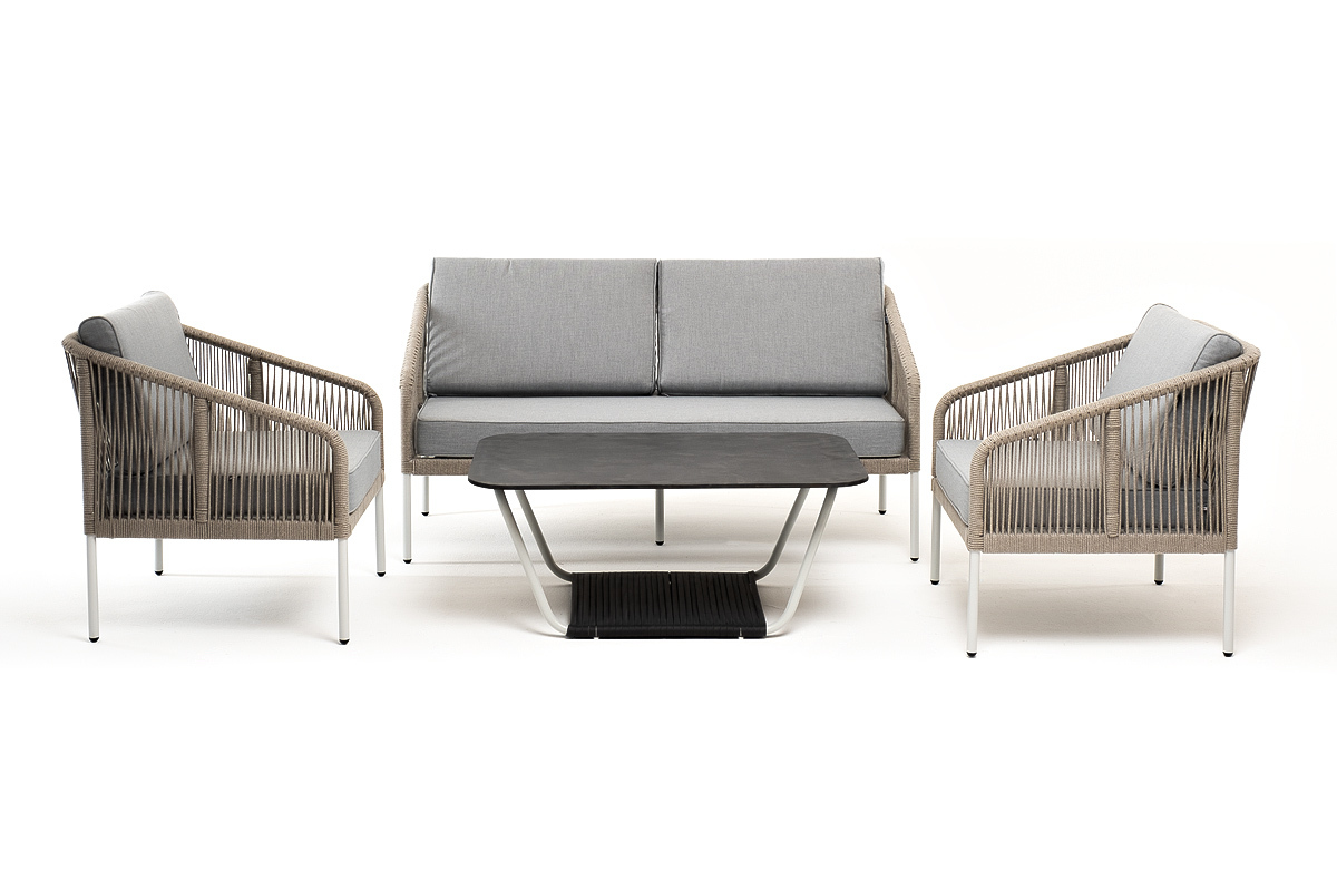 Лаунж-зона «Канны» предназначена для размещения четырех персон. Она включает в себя: - журнальный столик (размер – 1000×650×420 мм). - два плетеных кресла (размер – 700×700×750 мм). - двухместный диван (размер – 1500×700×750 мм). Каркас уличной мебели выполнен из алюминия. Его дополняет оплетка цвета серый меланж, изготовленная на основе эластичных синтетических лент из полиэфирных волокон высокой прочности. Кресла и диван идут в комплекте с мягкими подушками в чехлах светло-серого цвета. “Канны” диван 2-местный плетеный из роупа, каркас алюминий светло-серый (RAL7035) шагрень, роуп серый меланж круглый, ткань светло-серая 1шт. 1 500Х700Х750, “Канны” кресло плетеное из роупа, каркас алюминий светло-серый (RAL7035) шагрень, роуп серый меланж круглый, ткань светло-серая 2шт. 700Х700Х750, НЕ ИСПОЛЬЗОВАТЬ”Глория” журнальный стол 100х65см из HPL, цвет “черный камень” 1шт. 1 000Х650Х420,