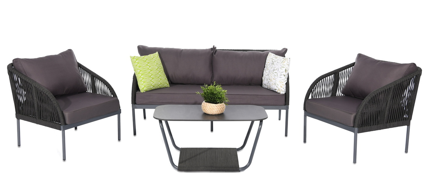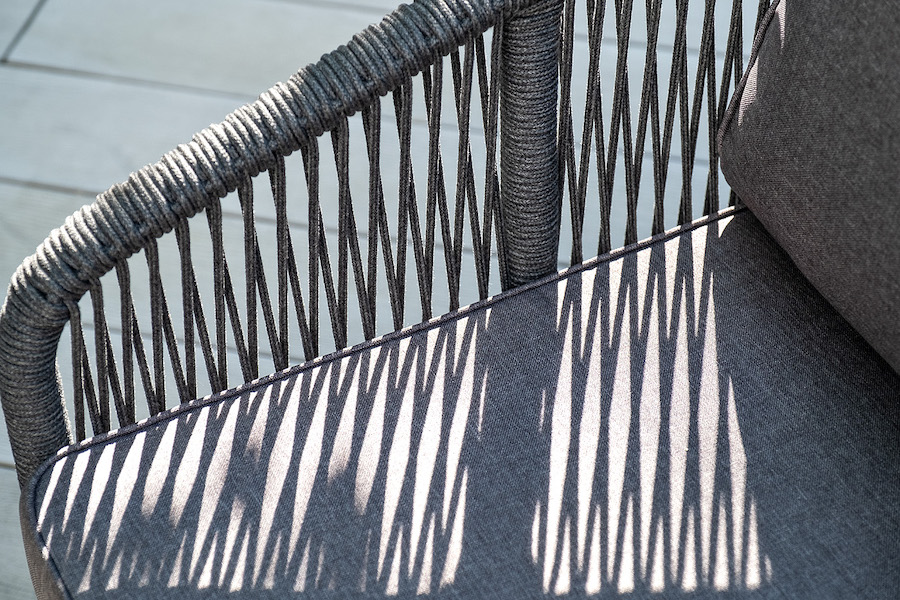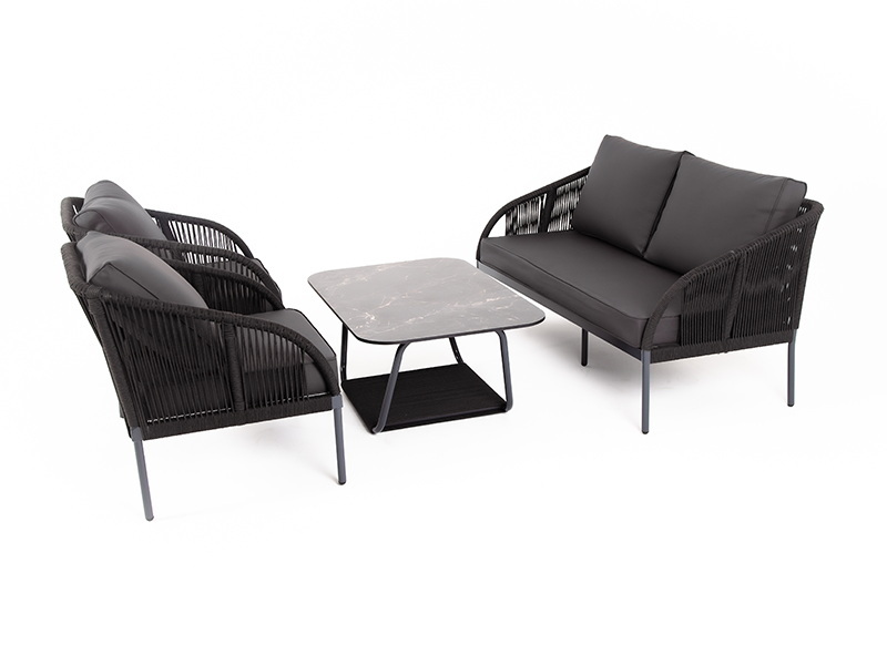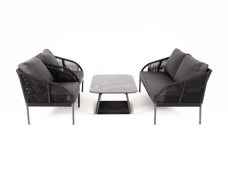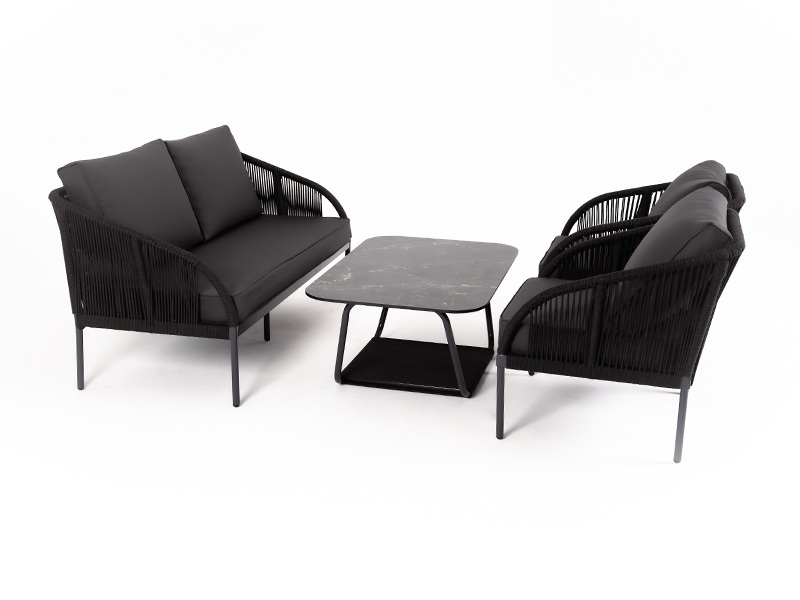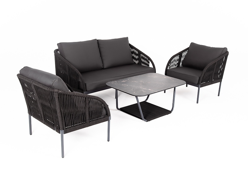 Лаунж-зона «Канны» предназначена для размещения четырех персон. Она включает в себя: - два плетеных кресла (размер – 700×700×750 мм). - двухместный диван (размер – 1500×700×750 мм). - журнальный столик (размер – 1000×650×420 мм). Каркас уличной мебели выполнен из износостойкого алюминия. Его дополняет серая ручная оплетка, изготовленная на основе эластичных синтетических лент из полиэфирных волокон высокой прочности. Кресла и диван идут в комплекте с мягкими подушками в чехлах темно-серого цвета. “Канны” диван 2-местный плетеный из роупа, каркас алюминий темно-серый (RAL7024) муар, роуп темно-серый круглый, ткань темно-серая 027 1шт. 1 500Х700Х750, “Канны” кресло плетеное из роупа, каркас алюминий темно-серый (RAL7024) муар, роуп темно-серый круглый, ткань темно-серая 027 2шт. 700Х700Х750, “Гранада” журнальный стол 100х65см из HPL, цвет “серый гранит” 1шт. 1 000Х650Х420,