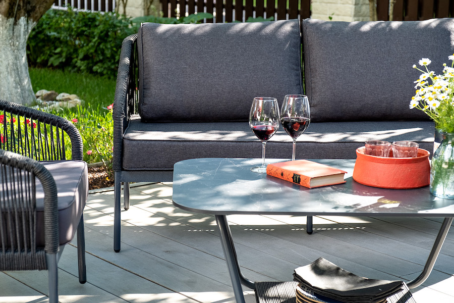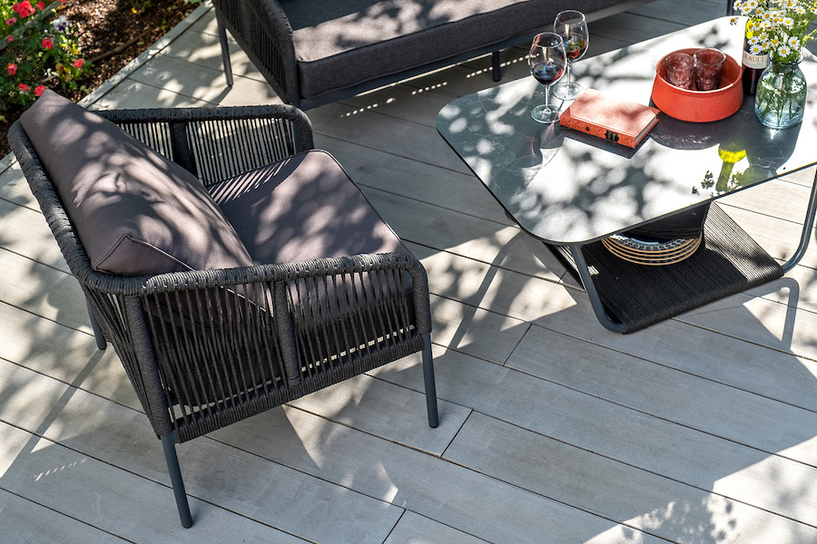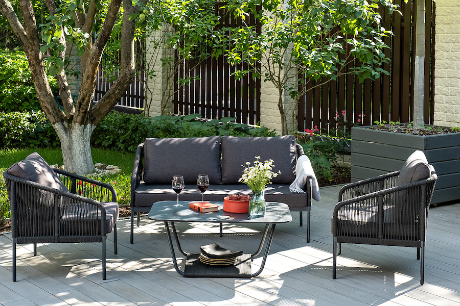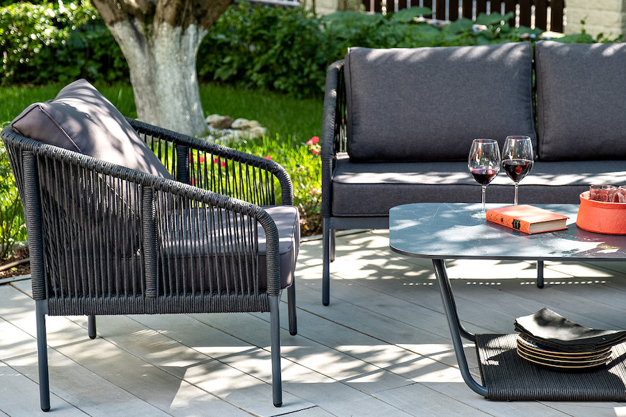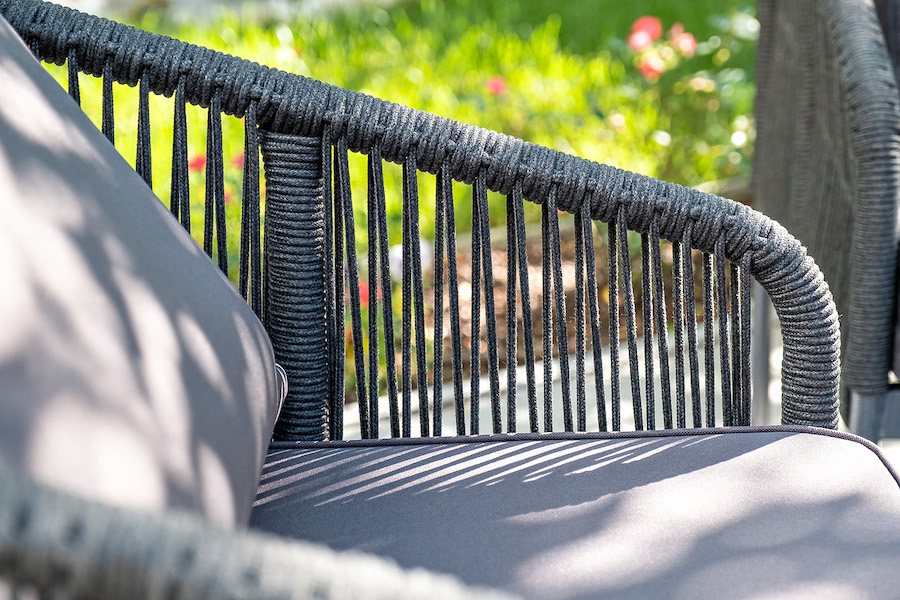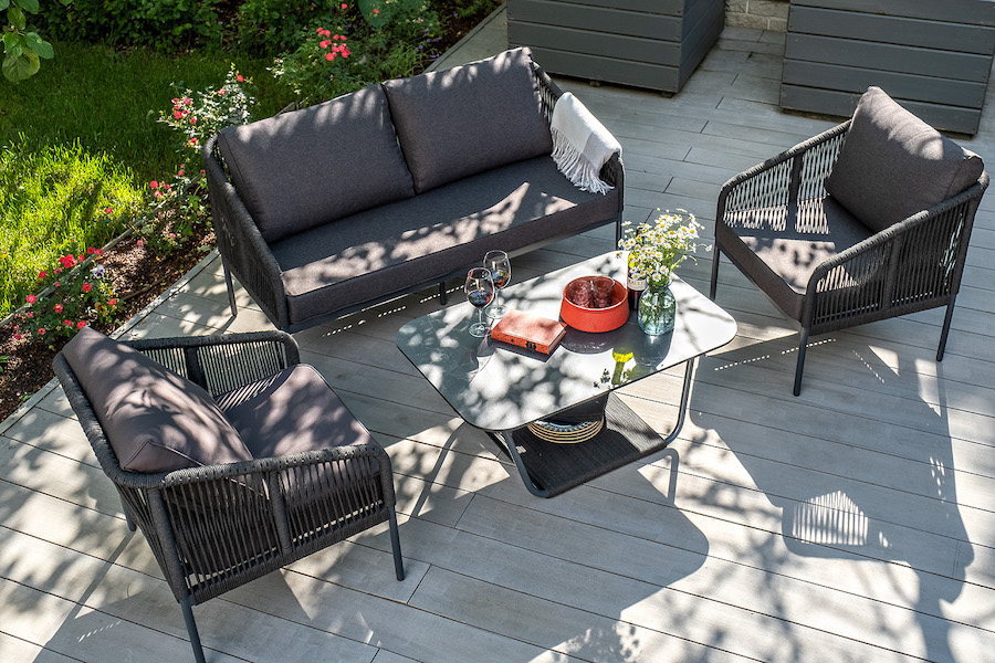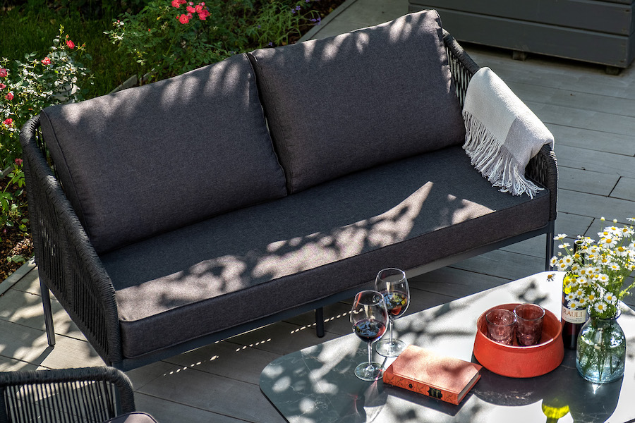 Лаунж-зона «Канны» предназначена для размещения четырех персон. Она включает в себя: - два плетеных кресла (размер – 700×700×750 мм). - двухместный диван (размер – 1500×700×750 мм). - журнальный столик (размер – 1000×650×420 мм). Каркас уличной мебели выполнен из износостойкого алюминия. Его дополняет серая ручная оплетка, изготовленная на основе эластичных синтетических лент из полиэфирных волокон высокой прочности. Кресла и диван идут в комплекте с мягкими подушками в чехлах темно-серого цвета. “Канны” диван 2-местный плетеный из роупа, каркас алюминий темно-серый (RAL7024) муар, роуп темно-серый круглый, ткань темно-серая 027 1шт. 1 500Х700Х750, “Канны” кресло плетеное из роупа, каркас алюминий темно-серый (RAL7024) муар, роуп темно-серый круглый, ткань темно-серая 027 2шт. 700Х700Х750, “Гранада” журнальный стол 100х65см из HPL, цвет “серый гранит” 1шт. 1 000Х650Х420,