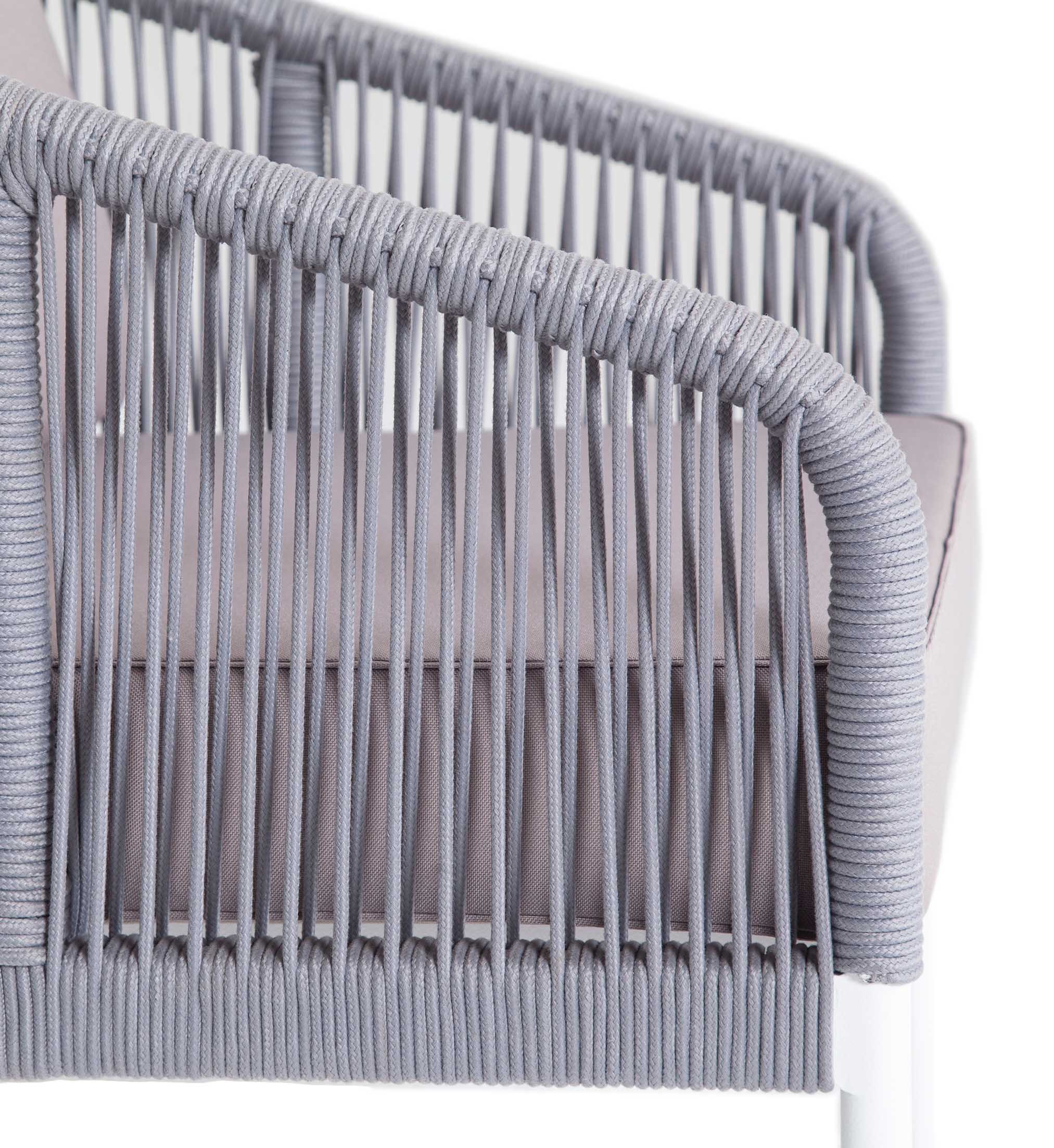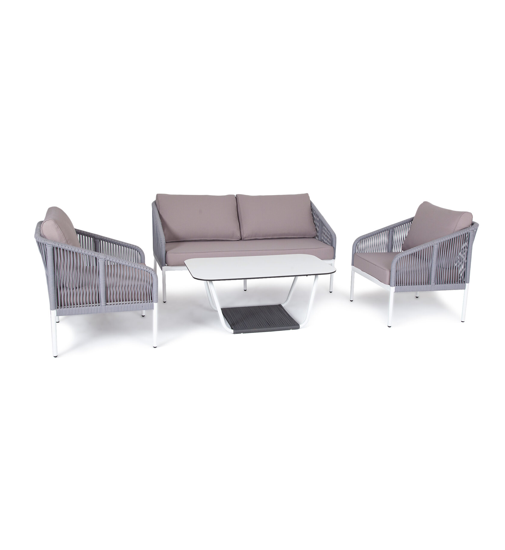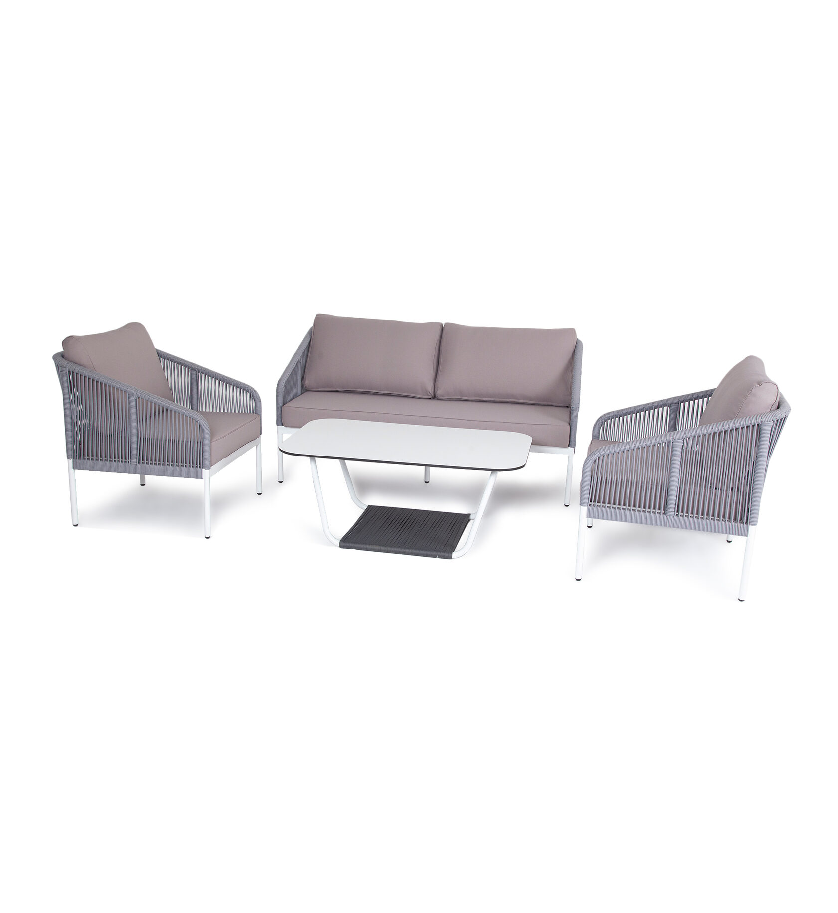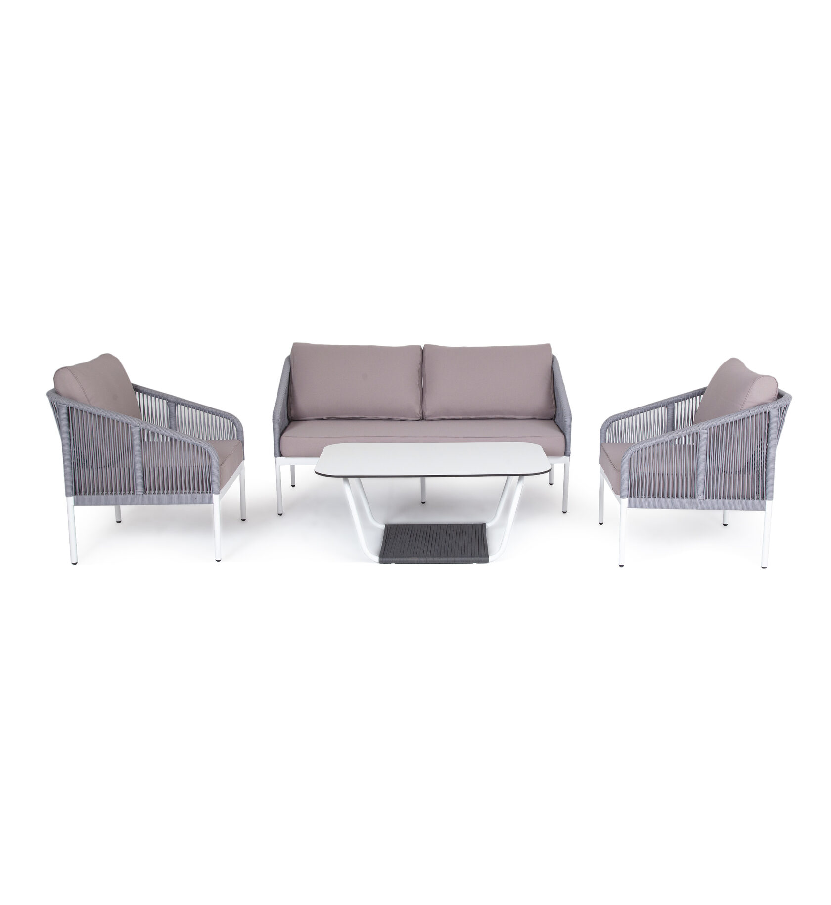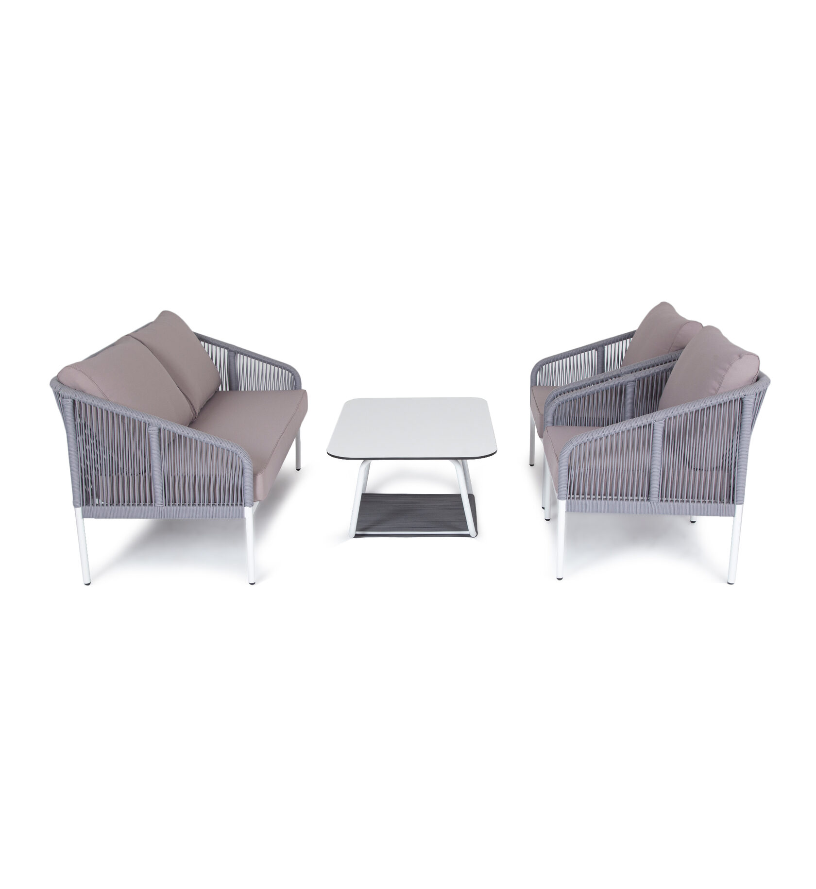 Лаунж-зона «Канны» предназначена для размещения четырех персон. Она включает в себя: - два плетеных кресла (размер – 700×700×750 мм). - двухместный диван (размер – 1500×700×750 мм). - журнальный столик (размер – 1000×650×420 мм). Каркас уличной мебели выполнен из износостойкого алюминия, окрашенного в белый цвет. Его дополняет светло-серая ручная оплетка, изготовленная на основе эластичных синтетических лент из полиэфирных волокон высокой прочности. Кресло идет в комплекте с мягкими подушками в чехлах серого цвета. Диван идет в комплекте с мягкими подушками в чехлах светло-серого цвета. “Канны” кресло плетеное из роупа, каркас алюминий белый шагрень, роуп светло-серый круглый, ткань светло-серая 2шт. 700Х700Х750, “Канны” диван 2-местный плетеный из роупа, каркас алюминий белый, роуп светло-серый круглый, ткань светло-серая 1шт. 1 500Х700Х750, “Глория” журнальный стол 100х65см из HPL, цвет молочный 1шт. 1 000Х650Х420,