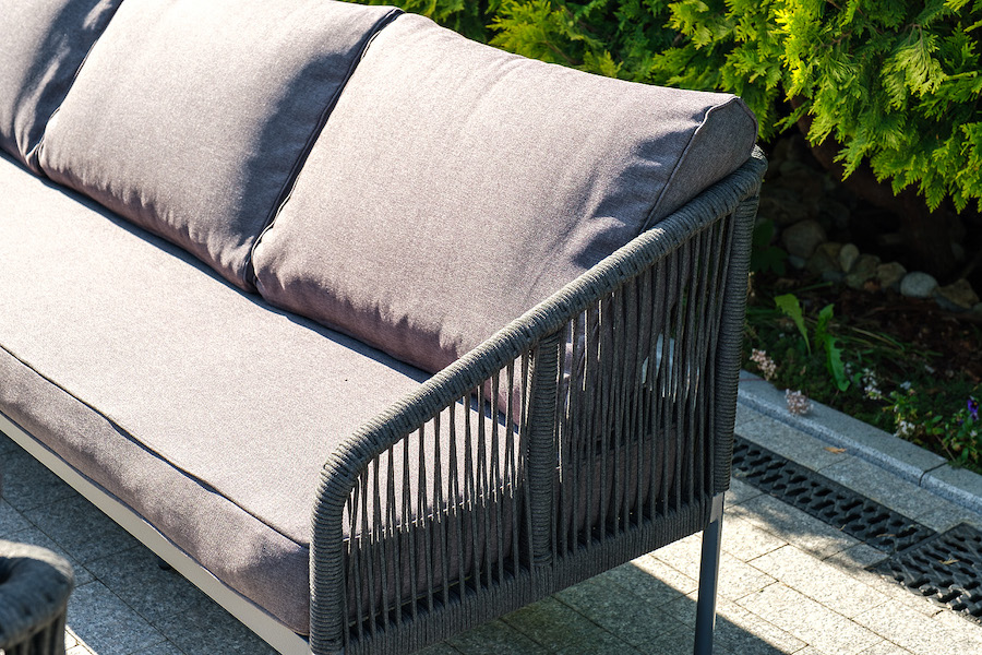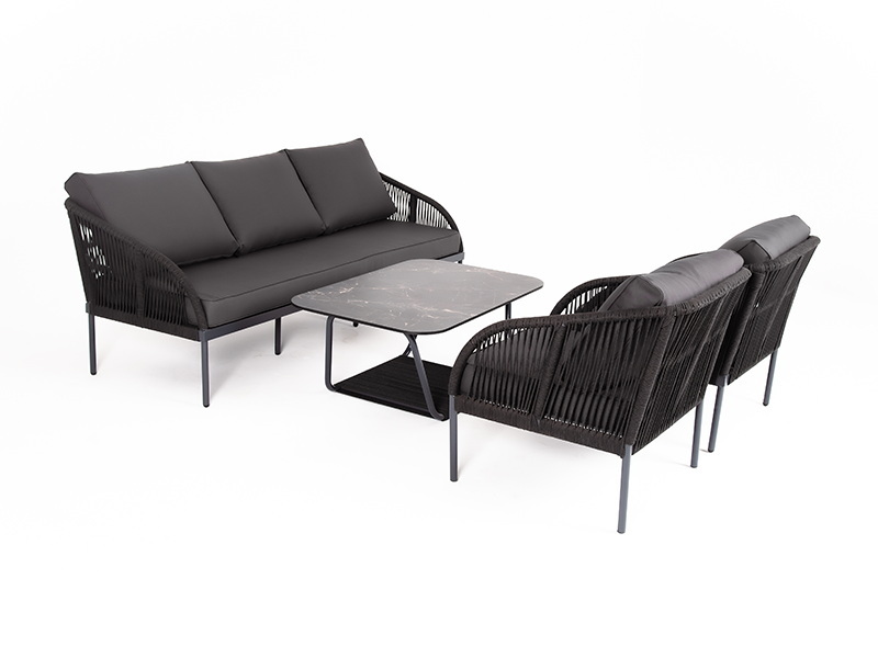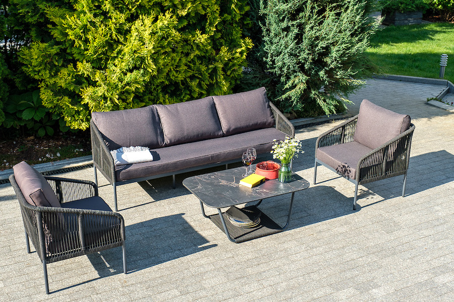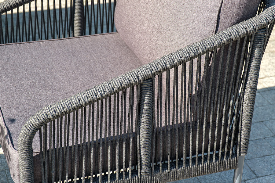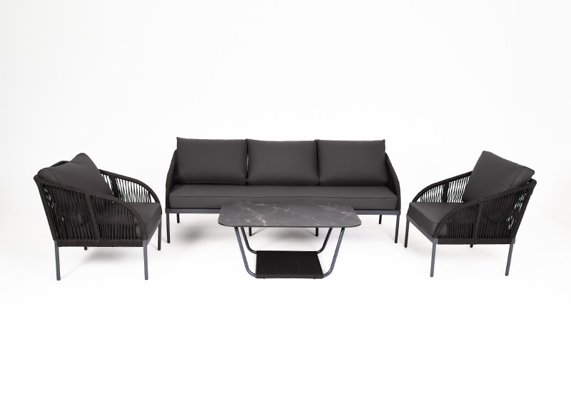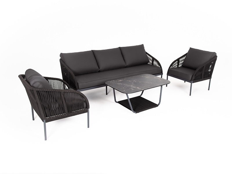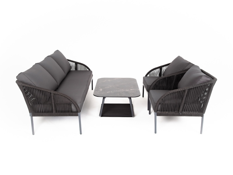 Лаунж-зона «Канны» на пять персон состоит из: - два плетеных кресла (размер – 700×700×750 мм). - трехместный диван (размер – 2030×700×750 мм). - журнальный столик (размер – 1000×650×420 мм). Каркас уличной мебели выполнен из износостойкого алюминия. Его дополняет темно-серая ручная оплетка, изготовленная на основе эластичных синтетических лент из полиэфирных волокон высокой прочности. Кресла и диван идут в комплекте с мягкими подушками в чехлах серого цвета. “Канны” диван 3-местный плетеный из роупа, каркас алюминий темно-серый (RAL7024) муар, роуп темно-серый круглый, ткань темно-серая 027 1шт. 2 030Х700Х750, “Канны” кресло плетеное из роупа, каркас алюминий темно-серый (RAL7024) муар, роуп темно-серый круглый, ткань темно-серая 027 2шт. 700Х700Х750, “Гранада” журнальный стол 100х65см из HPL, цвет “серый гранит” 1шт. 1 000Х650Х420,