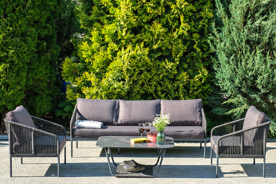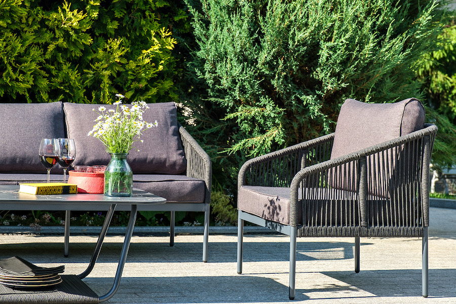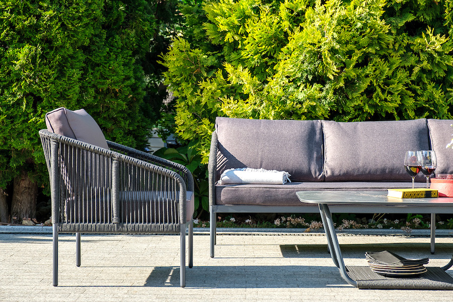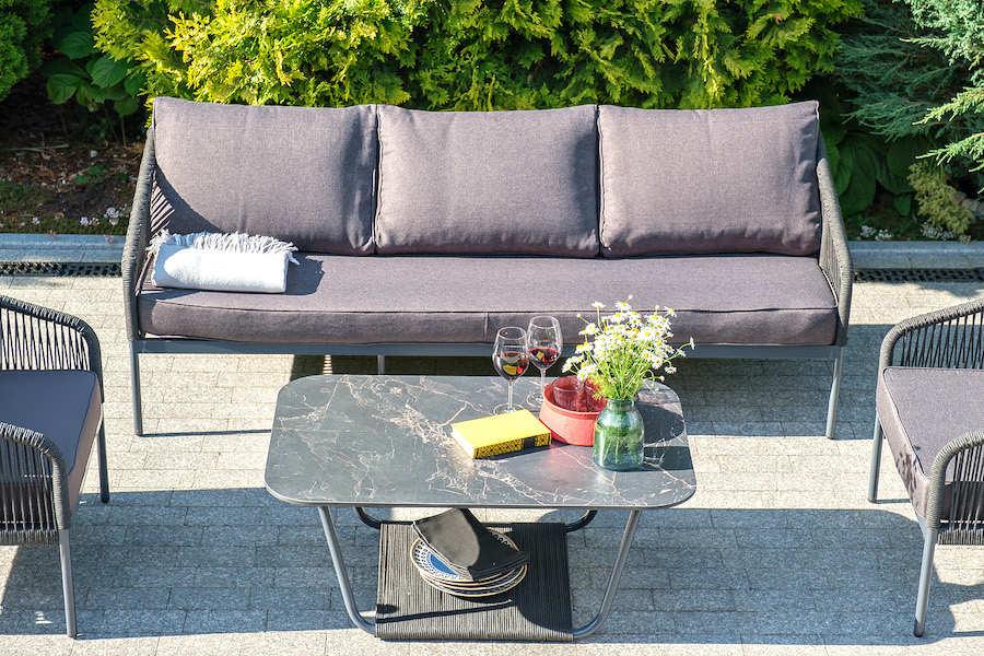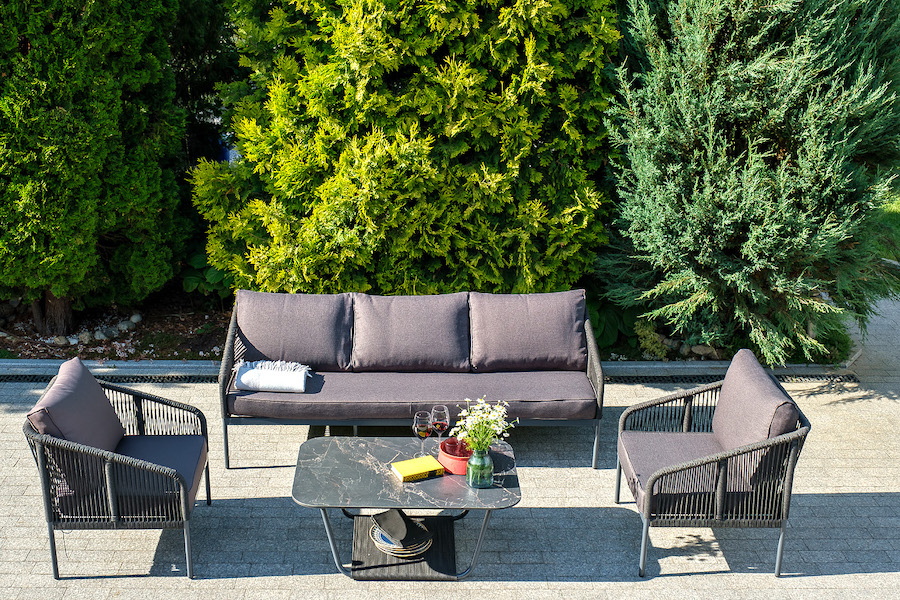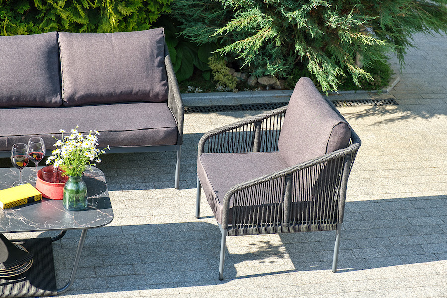 Лаунж-зона «Канны» на пять персон состоит из: - два плетеных кресла (размер – 700×700×750 мм). - трехместный диван (размер – 2030×700×750 мм). - журнальный столик (размер – 1000×650×420 мм). Каркас уличной мебели выполнен из износостойкого алюминия. Его дополняет темно-серая ручная оплетка, изготовленная на основе эластичных синтетических лент из полиэфирных волокон высокой прочности. Кресла и диван идут в комплекте с мягкими подушками в чехлах серого цвета. “Канны” диван 3-местный плетеный из роупа, каркас алюминий темно-серый (RAL7024) муар, роуп темно-серый круглый, ткань темно-серая 027 1шт. 2 030Х700Х750, “Канны” кресло плетеное из роупа, каркас алюминий темно-серый (RAL7024) муар, роуп темно-серый круглый, ткань темно-серая 027 2шт. 700Х700Х750, “Гранада” журнальный стол 100х65см из HPL, цвет “серый гранит” 1шт. 1 000Х650Х420,