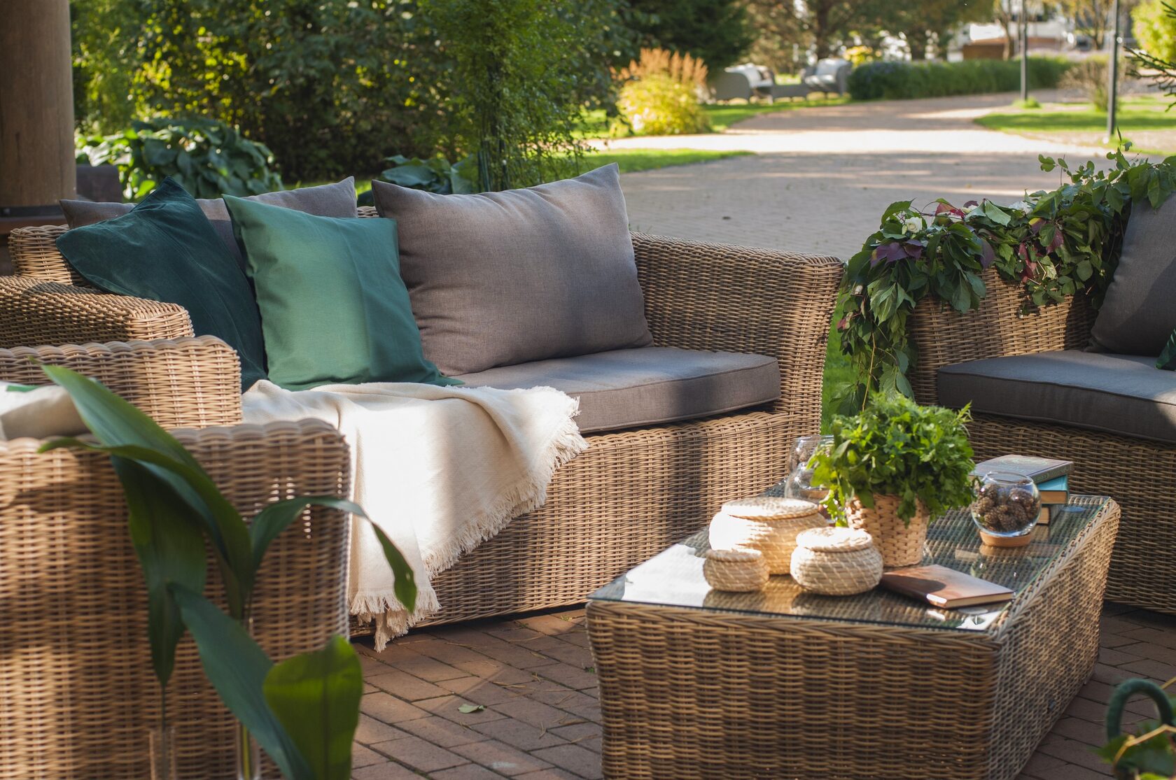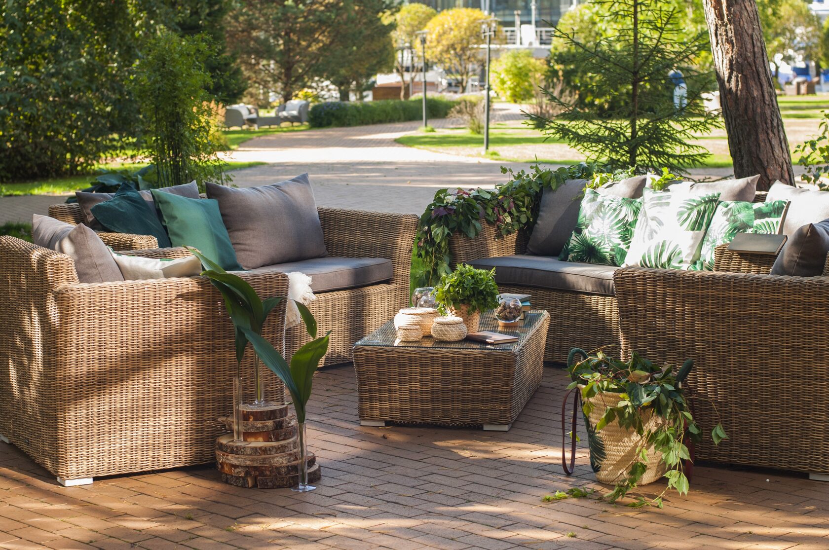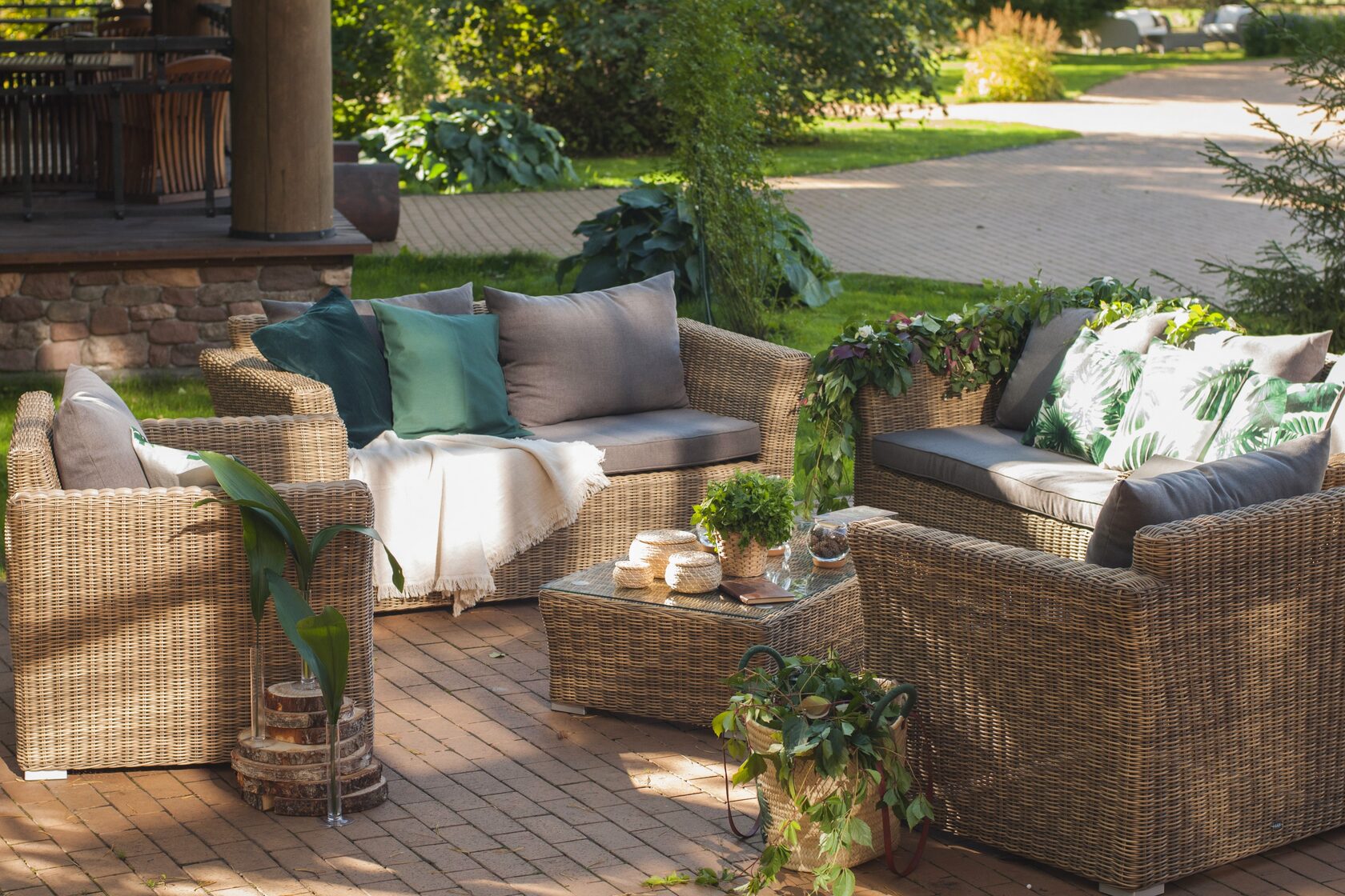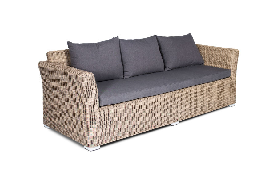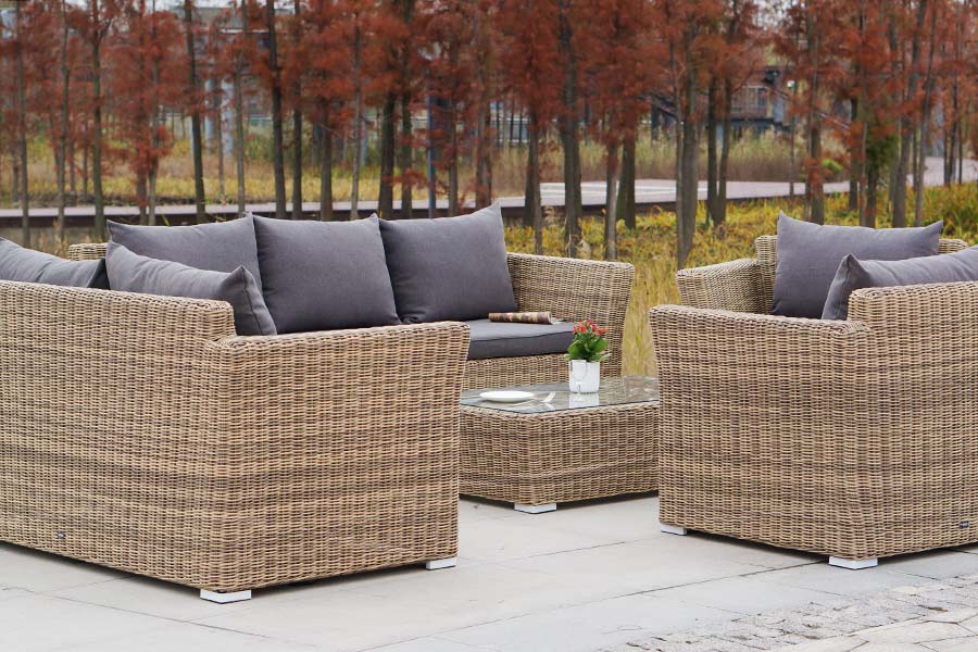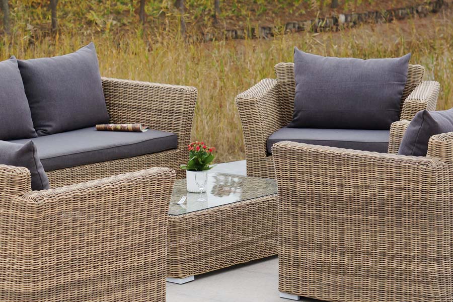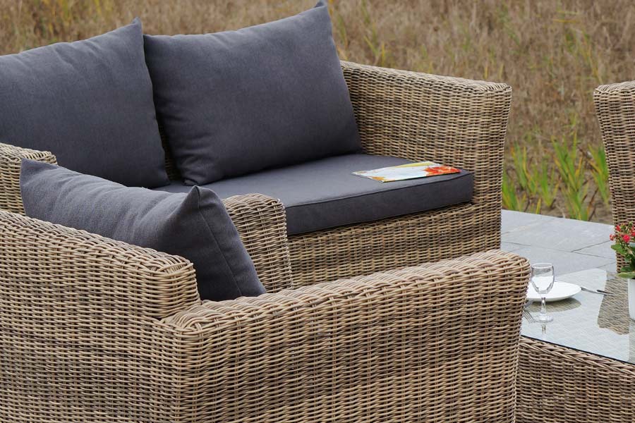 Лаунж-зона «Капучино Дабл» предназначена для размещения 7 персон. В ее комплектации находятся: - трехместный диван – 2200×865×815 мм. - двухместный диван – 1700×865×815 мм. - два кресла – 1040×865×815 мм. - плетеный журнальный столик – 1100×660×340 мм. Прочность каркасу мебели обеспечивает алюминий. Из искусственного ротанга соломенного оттенка создана оригинальная ручная оплетка, которая выступает в качестве основного декора. Садовые диваны и кресла поставляются вместе с подушками. Они упакованы в съемные чехлы, которые при необходимости можно стирать. Для их производства берется полиэстер, плотность 230гр/м2. Материал защищен с помощью влагоотталкивающих составов. Цвет подушек – серо-коричневый. Столешница садового журнального столика создана из закаленного стекла. Его толщина составляет 5 мм. Крепится к плетеной поверхности с помощью вакуумных прозрачных присосок. “Капучино” кресло из искусственного ротанга, цвет соломенный 2шт. 1 040Х865Х815, “Капучино” журнальный столик из искусственного ротанга, цвет соломенный 1шт. 1 100Х660Х340, “Капучино” диван из искусственного ротанга трехместный, цвет соломенный 1шт. 2 220Х865Х815, “Капучино” диван из искусственного ротанга двухместный, цвет соломенный 1шт. 1 700Х865Х815,