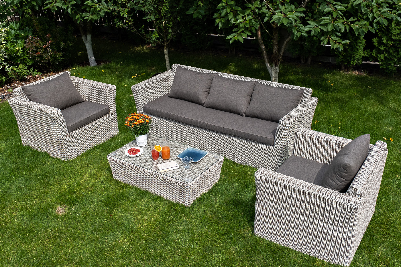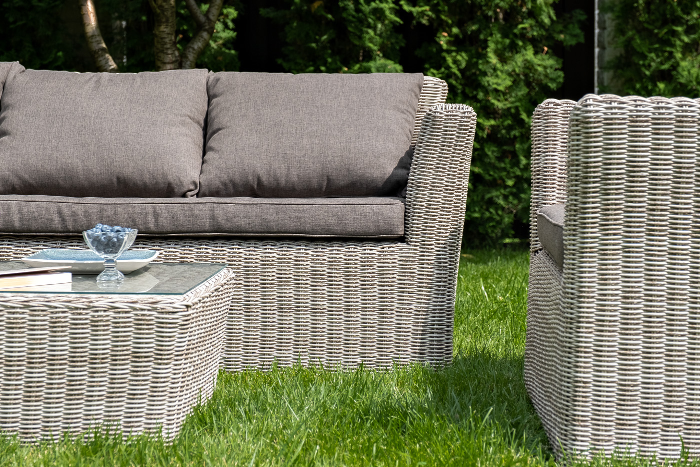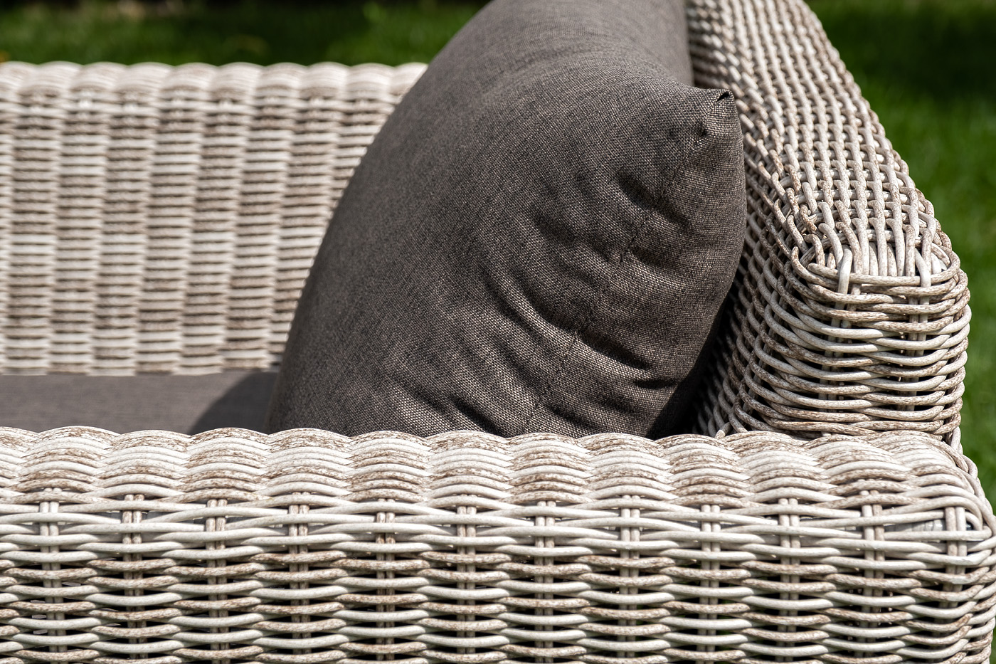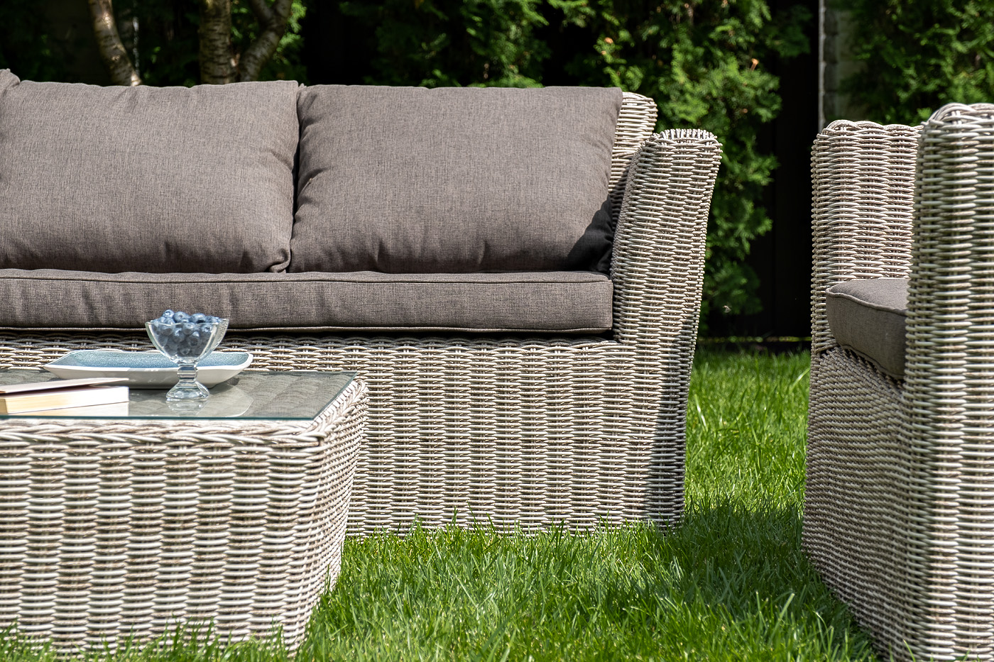 Лаунж-зона «Капучино» отличается хорошей вместительностью, поэтому подходит для комфортного отдыха компании до пяти человек. Комплект состоит из: - двух кресел (размер – 1040×865×815 мм). - журнального столика (размер – 1100×660×340 мм). - трехместного дивана (размер – 2220×865×815 мм). Из алюминия сделан устойчивый каркас мебели. Ее поверхность дополнена искусственным ротангом, из которого сделано ручное плетение, цвет бежевый. Кресла и диван идут в комплекте с подушками с серо-коричневыми чехлами. Они пошиты из качественного полиэстера с плотностью 230гр/м2. Материал предварительно проходит обработку влагоотталкивающей пропиткой. Столик дополнен практичной столешницей из стекла толщиной 5 мм. “Капучино” диван из искусственного ротанга трехместный, цвет бежевый 1шт. 2 220Х865Х815, “Капучино” кресло из искусственного ротанга, цвет бежевый 2шт. 1 040Х865Х815, “Капучино” журнальный столик из искусственного ротанга, цвет бежевый 1шт. 1 100Х660Х340,