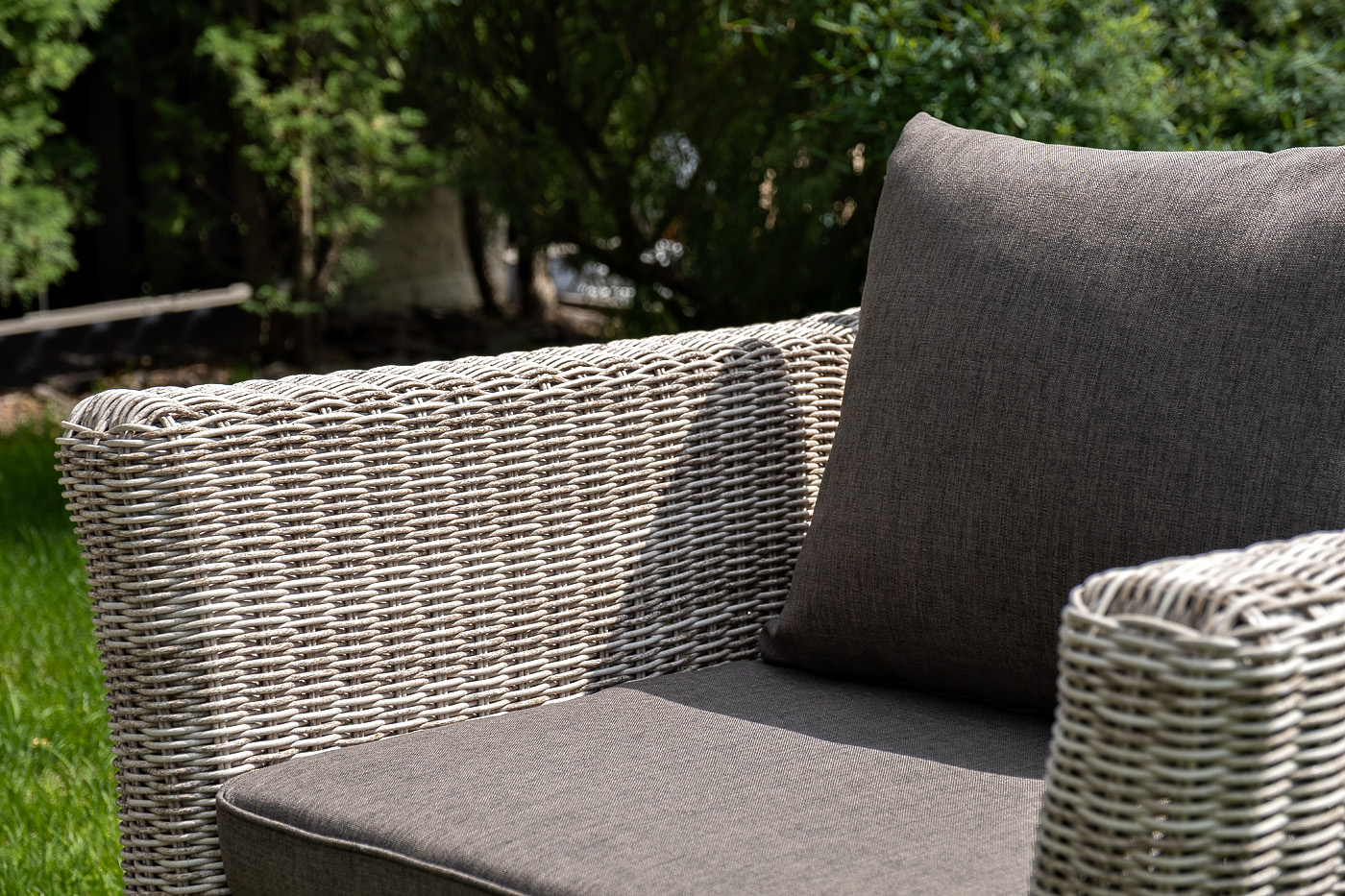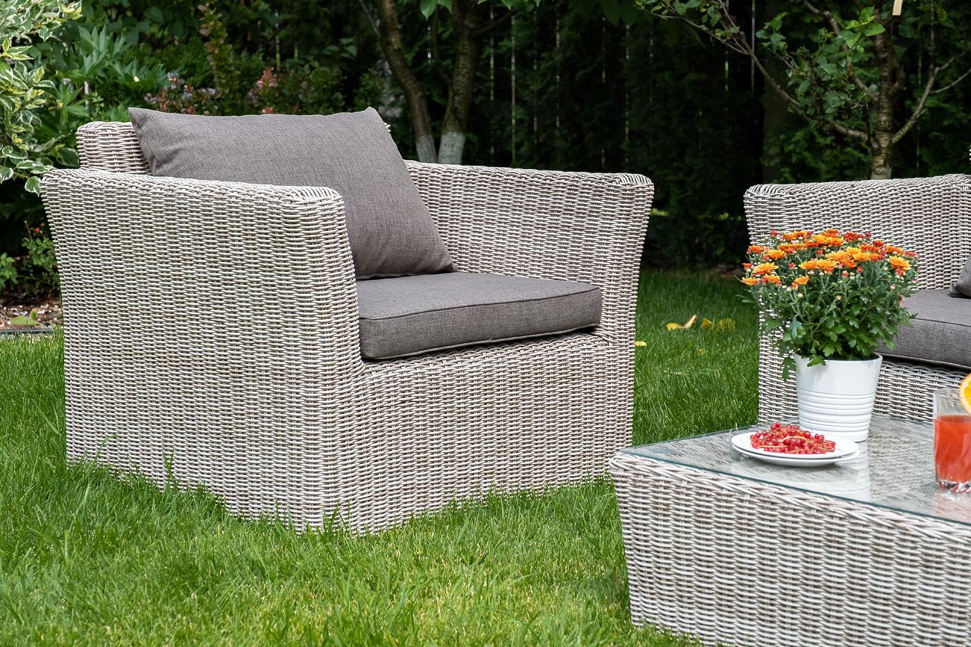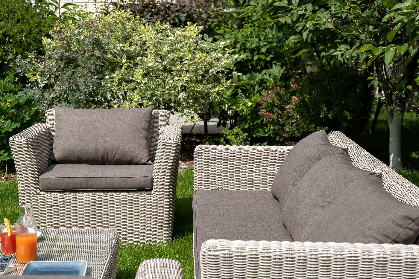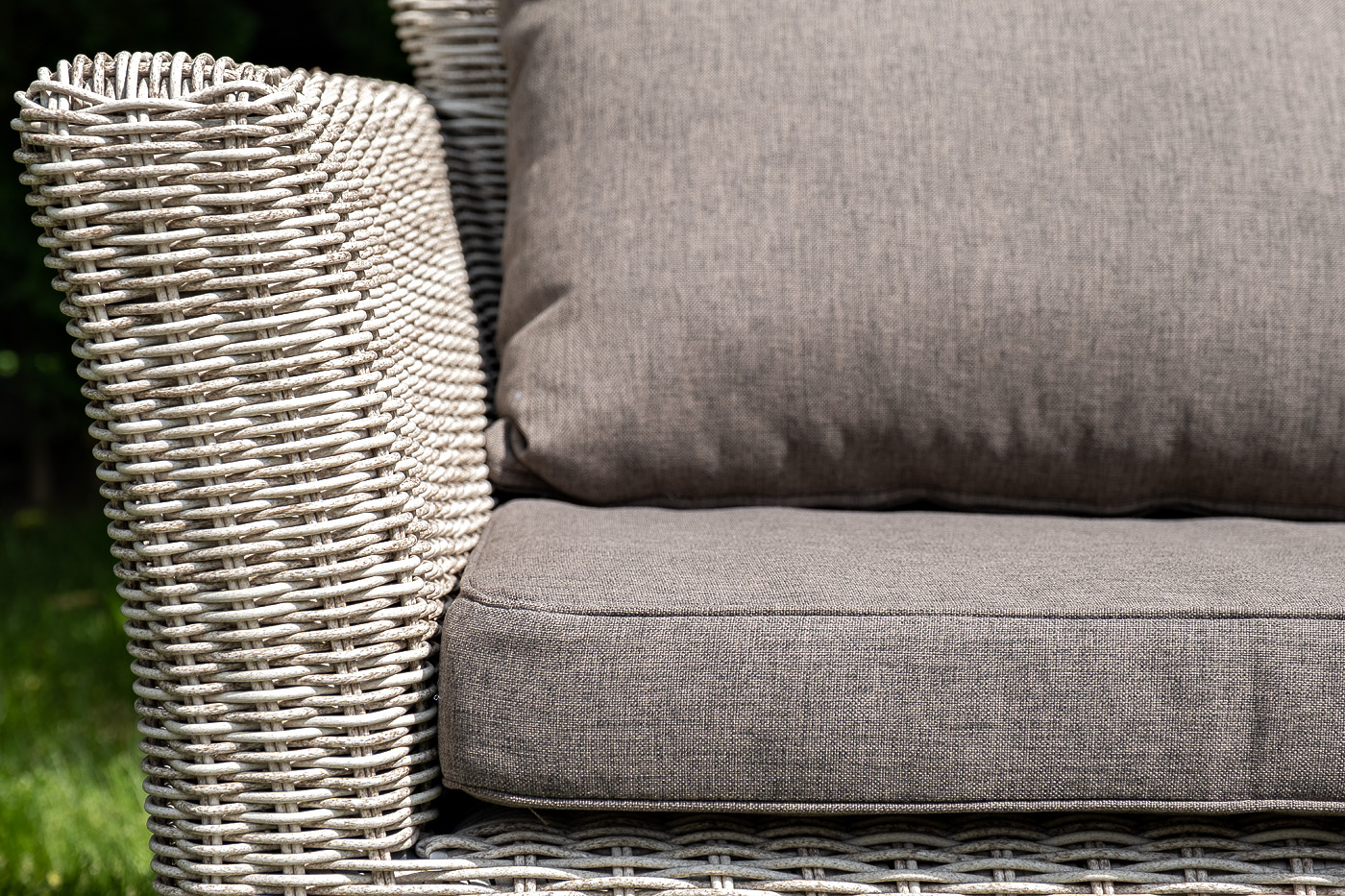 Лаунж-зона «Капучино» отличается хорошей вместительностью, поэтому подходит для комфортного отдыха компании до пяти человек. Комплект состоит из: - двух кресел (размер – 1040×865×815 мм). - журнального столика (размер – 1100×660×340 мм). - трехместного дивана (размер – 2220×865×815 мм). Из алюминия сделан устойчивый каркас мебели. Ее поверхность дополнена искусственным ротангом, из которого сделано ручное плетение, цвет бежевый. Кресла и диван идут в комплекте с подушками с серо-коричневыми чехлами. Они пошиты из качественного полиэстера с плотностью 230гр/м2. Материал предварительно проходит обработку влагоотталкивающей пропиткой. Столик дополнен практичной столешницей из стекла толщиной 5 мм. “Капучино” диван из искусственного ротанга трехместный, цвет бежевый 1шт. 2 220Х865Х815, “Капучино” кресло из искусственного ротанга, цвет бежевый 2шт. 1 040Х865Х815, “Капучино” журнальный столик из искусственного ротанга, цвет бежевый 1шт. 1 100Х660Х340,