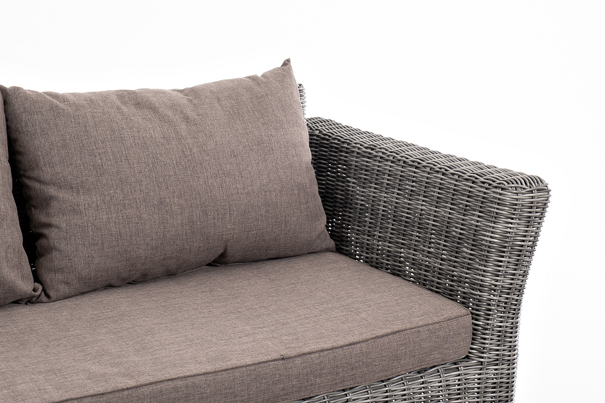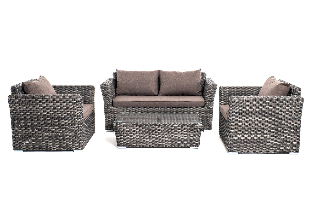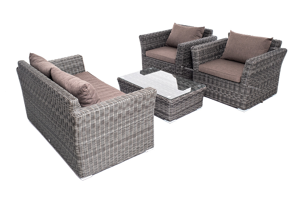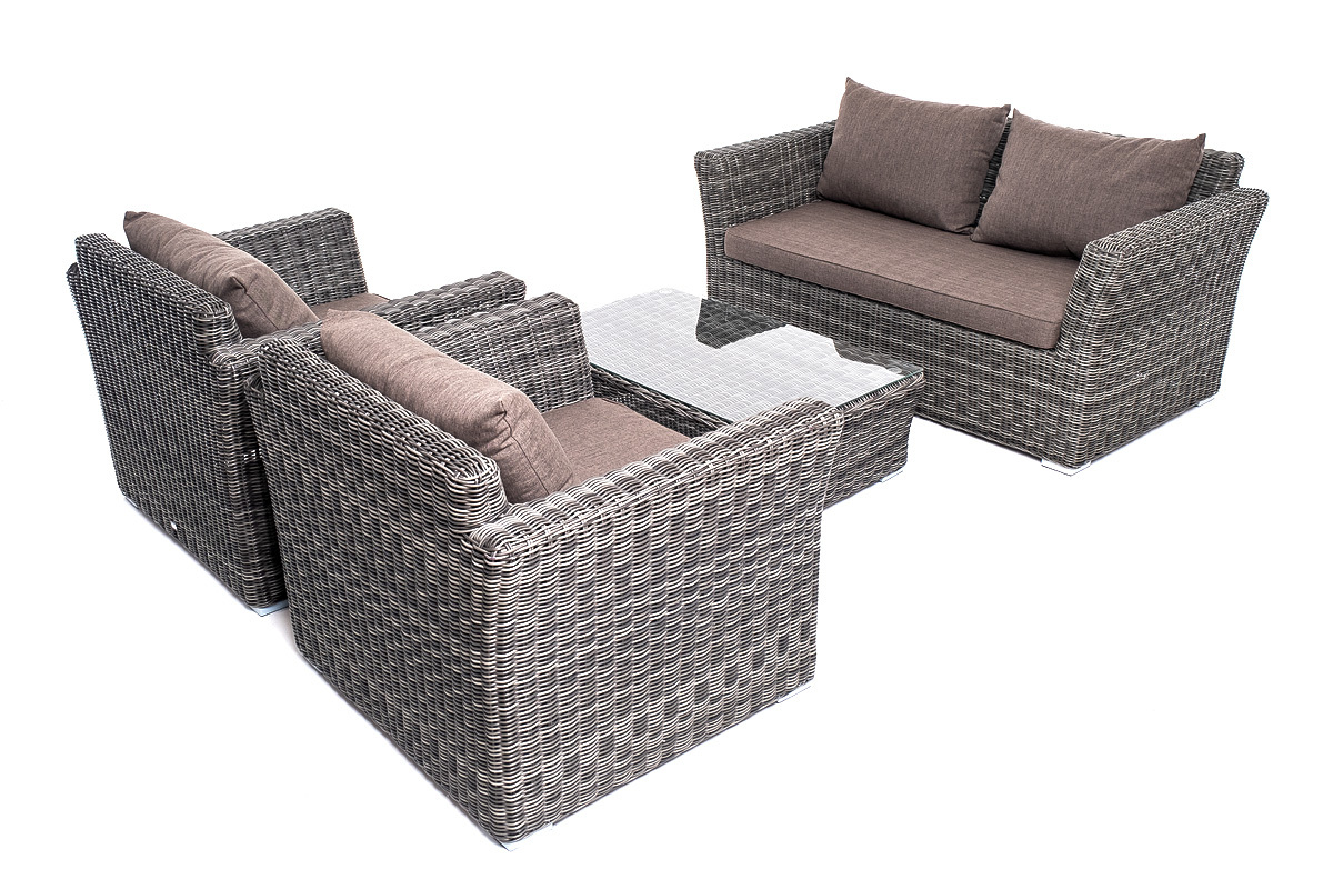 Лаунж-зона «Капучино Сингл» на 4 персоны. Она включает в свой состав: - двухместный диван (размер – 1700×865×815 мм). - два кресла (размер – 1040×865×815 мм). - плетеный журнальный столик (размер – 1100×660×340 мм). Прочный алюминиевый каркас усиливает устойчивость мебели. Его дополняет плетение в цвете “графит”, которое представлено из круглого искусственного ротанга. Более комфортной лаунж-зону делают мягкие подушки с чехлами из серо-коричневого полиэстера плотностью 230гр/м2. Ткань предварительно обрабатывается влагоотталкивающими составами. Столешница журнального столика также входит в комплект и поставляется в собранном виде с самим столиком. Она изготовлена из закаленного стекла – 5 мм. “Капучино” диван из искусственного ротанга двухместный, цвет графит 1шт. 1 700Х865Х815, “Капучино” кресло из искусственного ротанга, цвет графит 2шт. 1 040Х865Х815, “Капучино” журнальный столик из искусственного ротанга, цвет графит 1шт. 1 100Х660Х340,