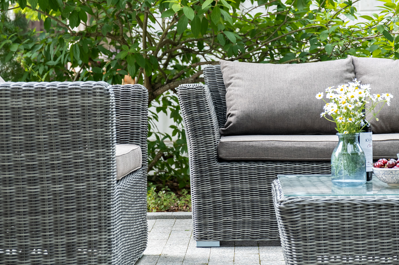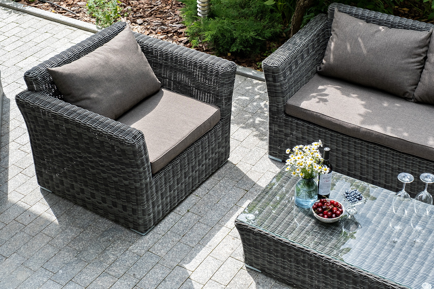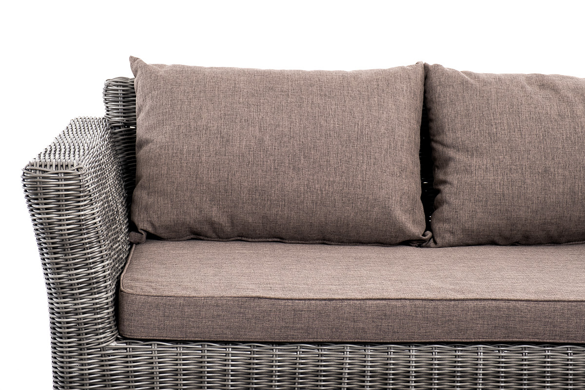 Лаунж-зона «Капучино Сингл» на 4 персоны. Она включает в свой состав: - двухместный диван (размер – 1700×865×815 мм). - два кресла (размер – 1040×865×815 мм). - плетеный журнальный столик (размер – 1100×660×340 мм). Прочный алюминиевый каркас усиливает устойчивость мебели. Его дополняет плетение в цвете “графит”, которое представлено из круглого искусственного ротанга. Более комфортной лаунж-зону делают мягкие подушки с чехлами из серо-коричневого полиэстера плотностью 230гр/м2. Ткань предварительно обрабатывается влагоотталкивающими составами. Столешница журнального столика также входит в комплект и поставляется в собранном виде с самим столиком. Она изготовлена из закаленного стекла – 5 мм. “Капучино” диван из искусственного ротанга двухместный, цвет графит 1шт. 1 700Х865Х815, “Капучино” кресло из искусственного ротанга, цвет графит 2шт. 1 040Х865Х815, “Капучино” журнальный столик из искусственного ротанга, цвет графит 1шт. 1 100Х660Х340,