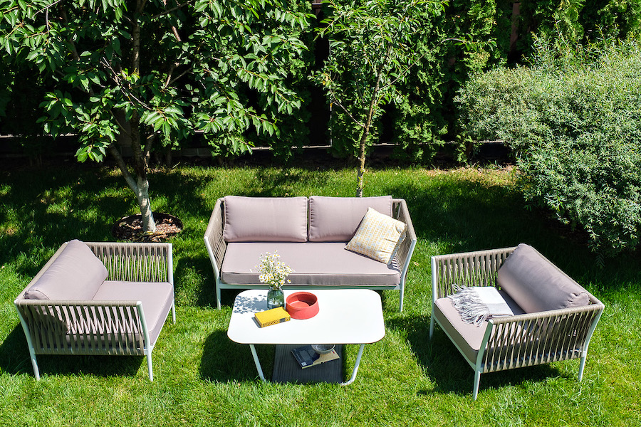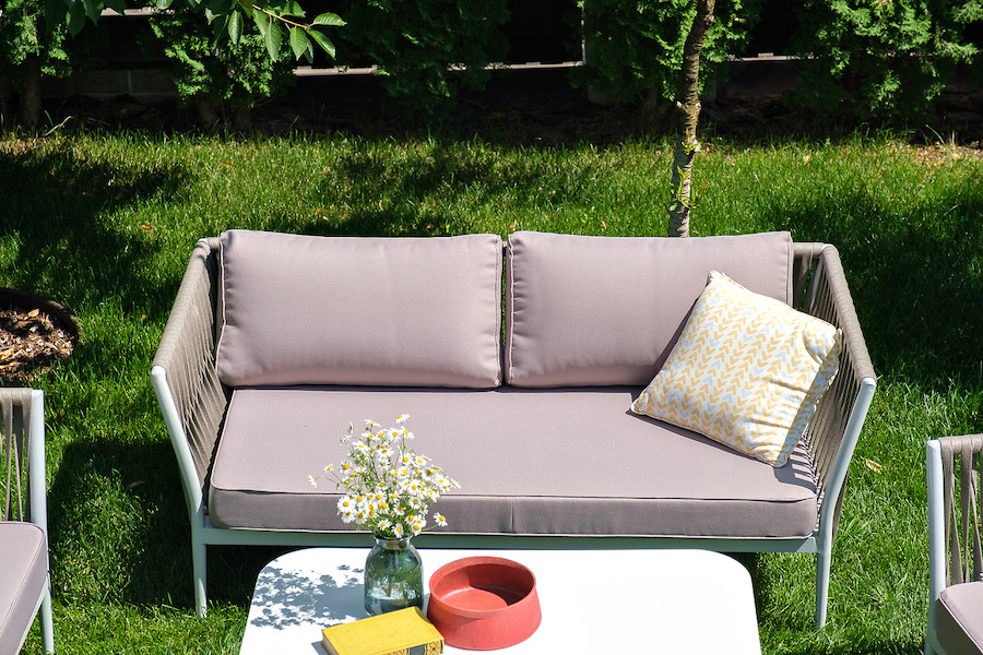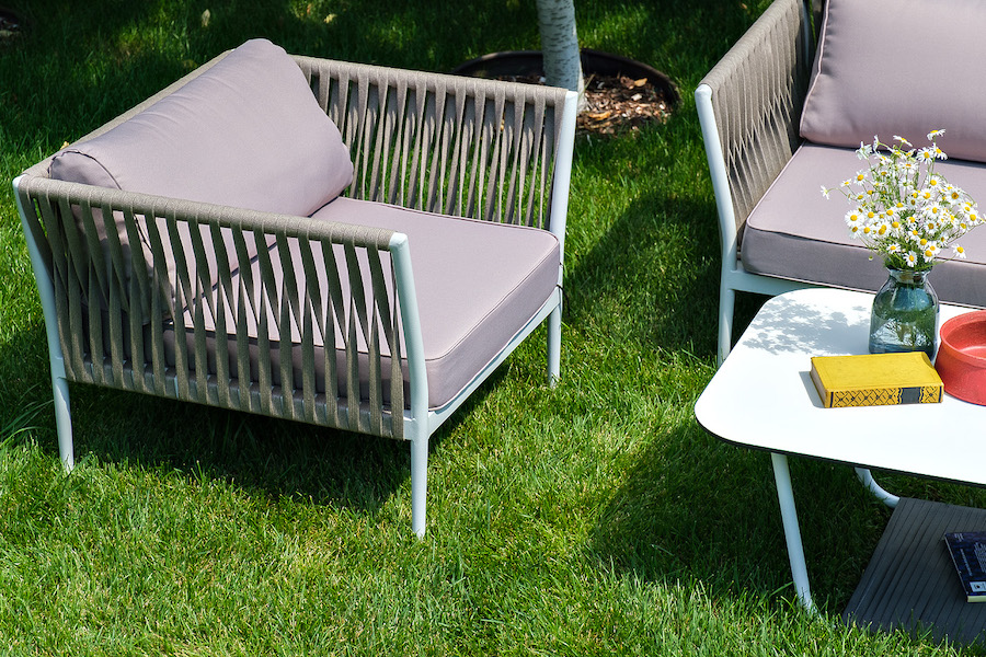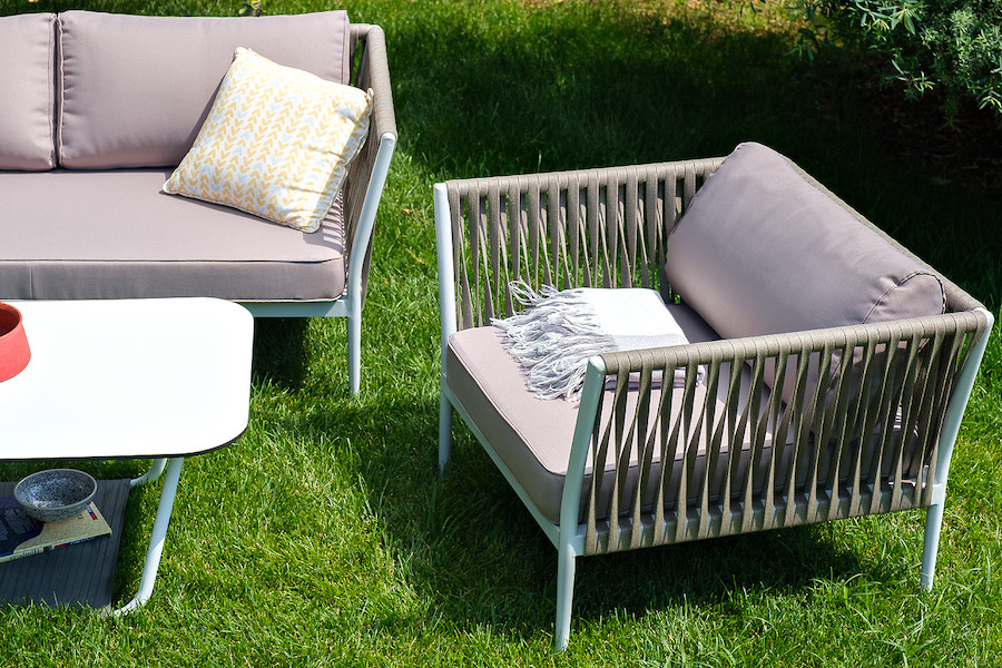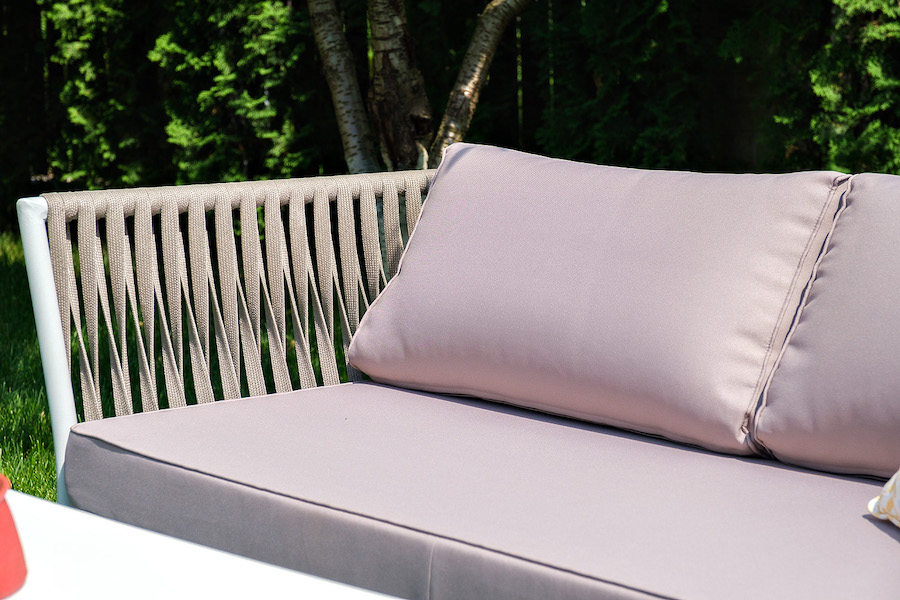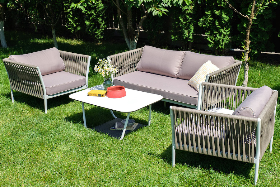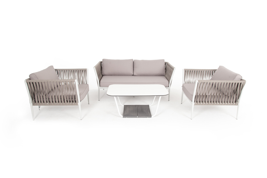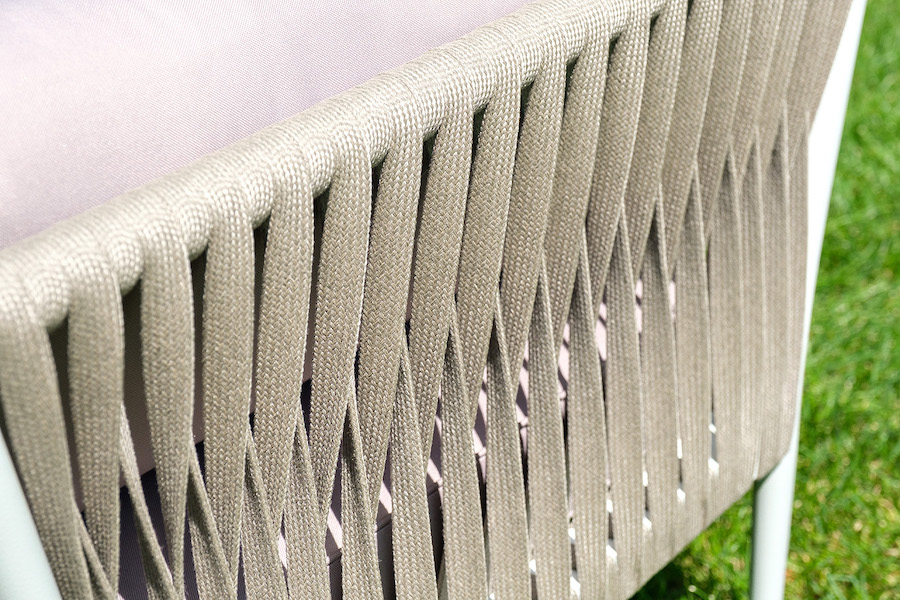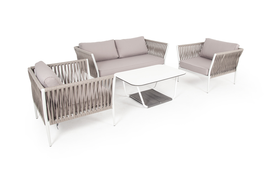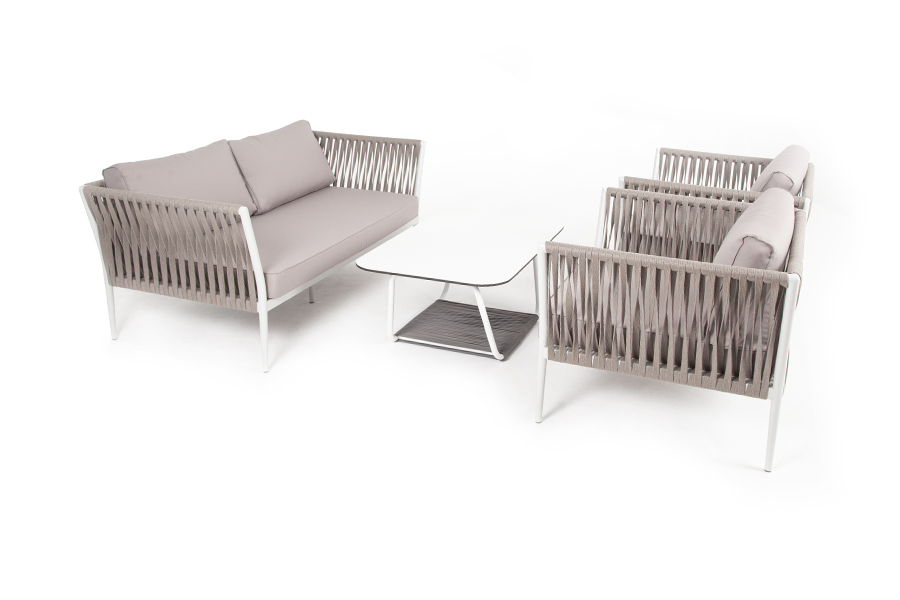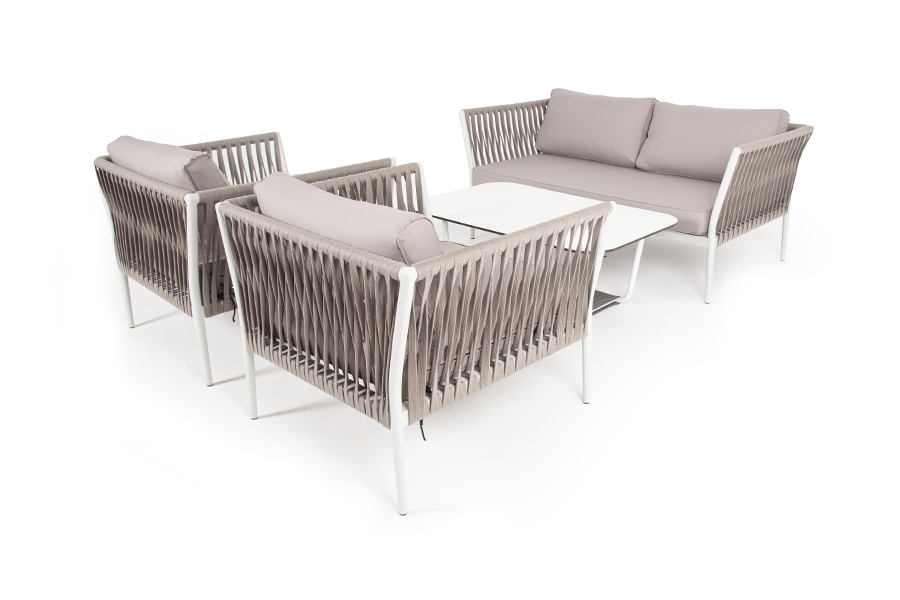 Лаунж-зона «Касабланка» расчитана на размещение 4-х персон. Состоит из: - двухместного дивана - 1600x800х695 мм. - двух кресел - 900×800×695 мм каждое. - журнального столика - 1000х650х420 мм. Диван и кресла изготовлены их алюминиевого прочного каркаса, оплетенного ручным способом роупом серо-коричневого цвета. Это эластичные ленты из полиэфирных волокон высокого качества. Каркас окрашен в светло-серый (RAL7035) цвет износостойкой порошковой краской. Журнальный столик также имеет алюминиевый каркас белого цвета. Столешница выполнена из монолитного компакт-пластика HPL молочного оттенка. Нижняя часть столика задекорирована роупом серого цвета и представляет дополнительную полку для хранения. “Касабланка” кресло плетеное из роупа, каркас алюминий светло-серый (RAL7035) муар, роуп серо-коричневый 23мм, ткань бежевая 052 2шт. 900Х800Х695, “Касабланка” диван 2-местный плетеный из роупа, каркас алюминий светло-серый (RAL7035) муар, роуп серо-коричневый 23мм, ткань бежевая 052 1шт. 1 600Х800Х695, “Глория” журнальный стол 100х65см из HPL, цвет молочный 1шт. 1 000Х650Х420,
