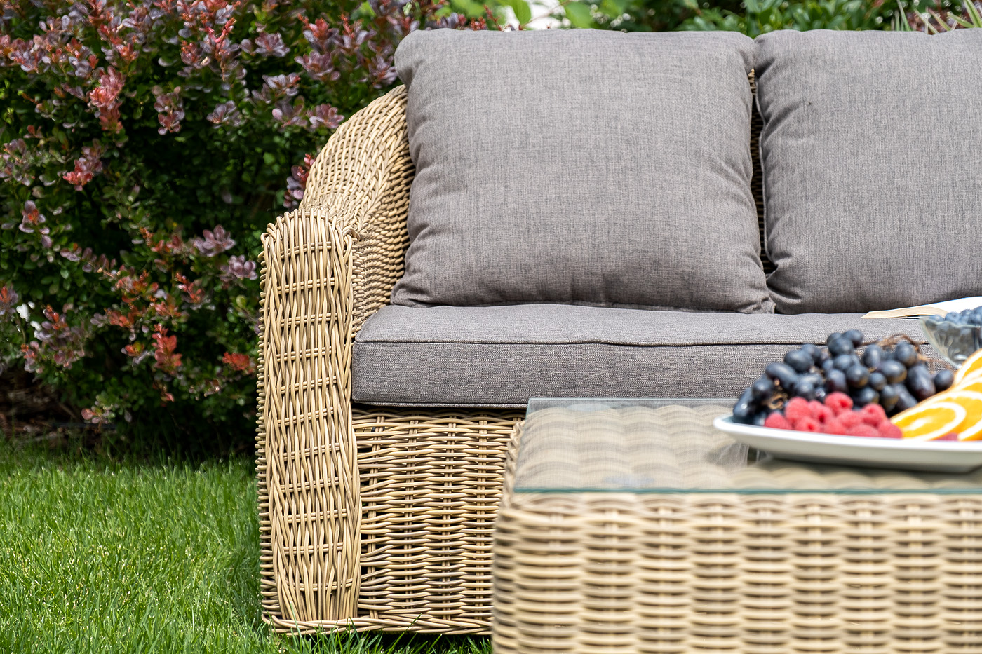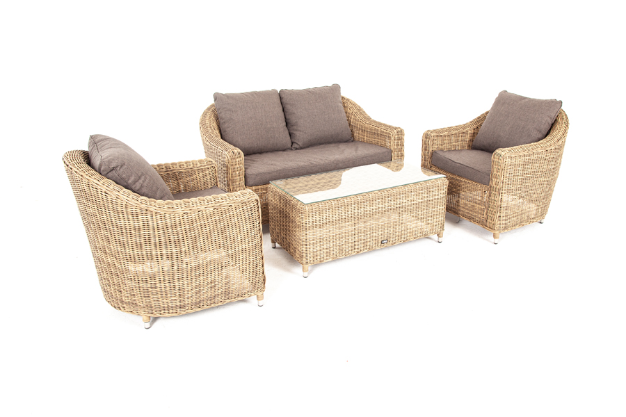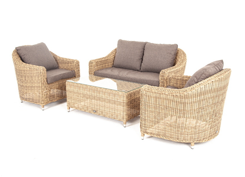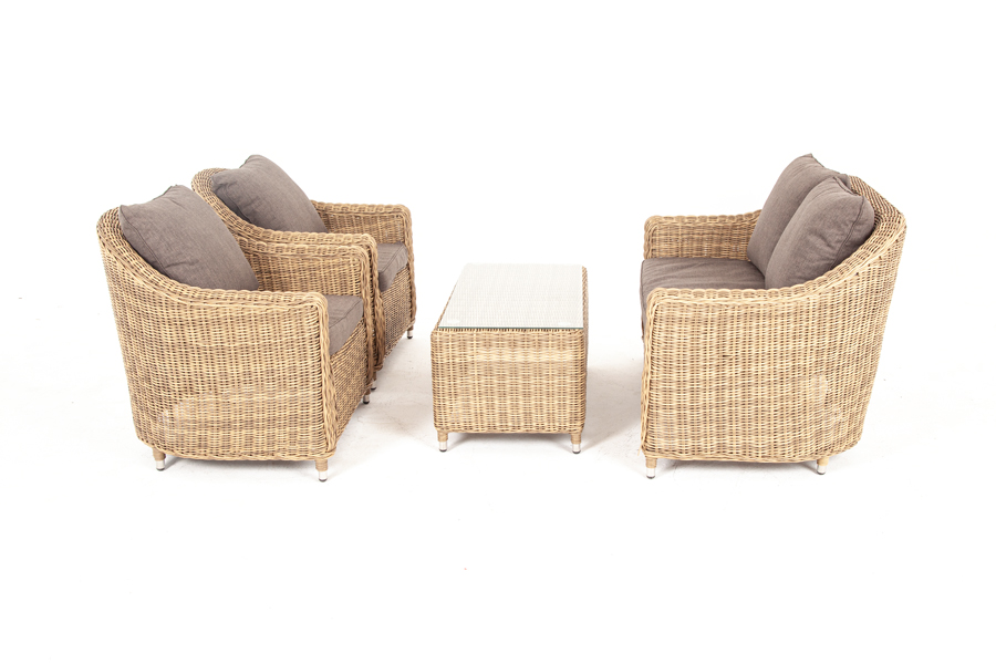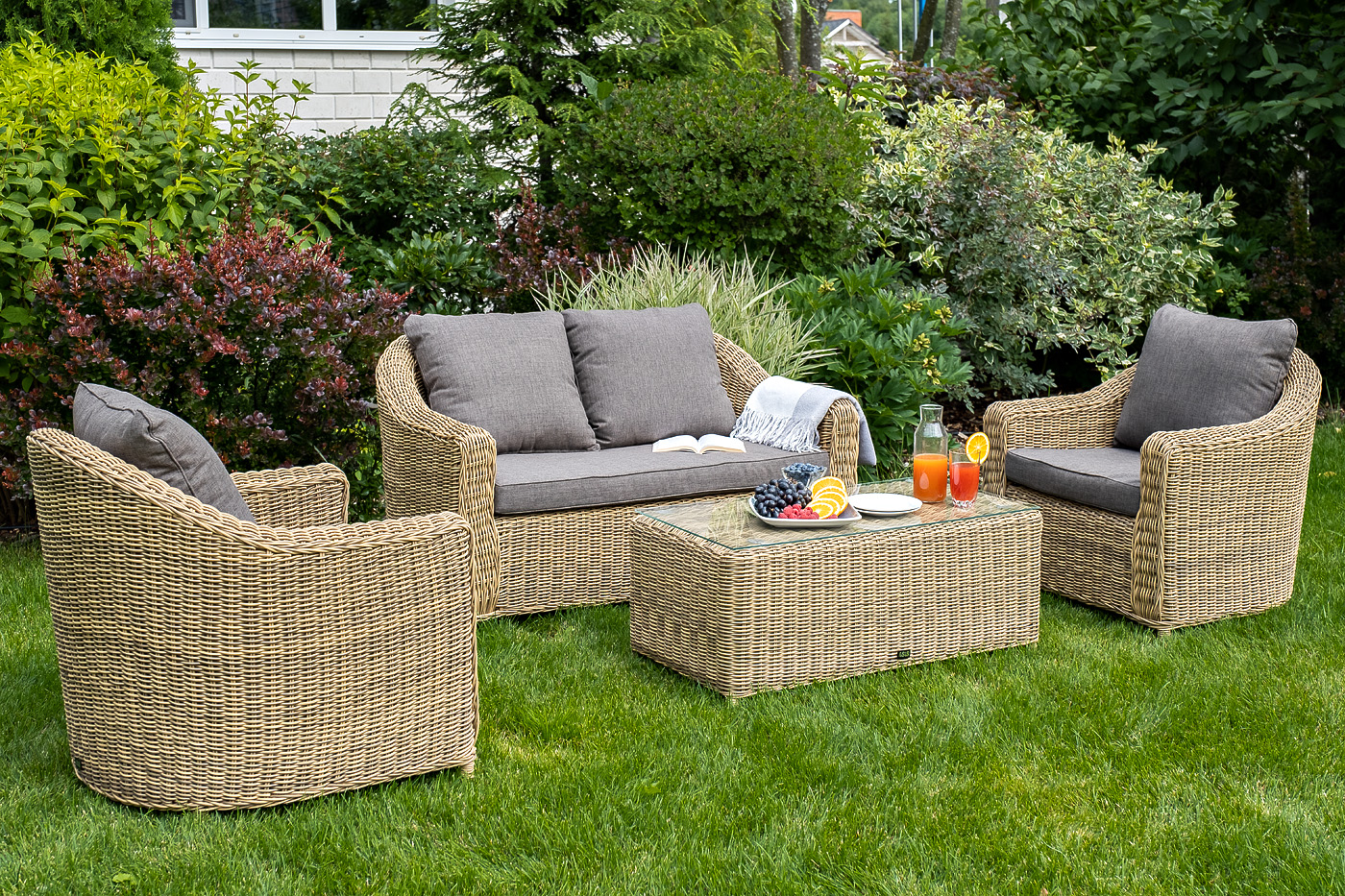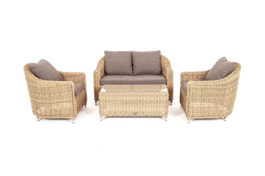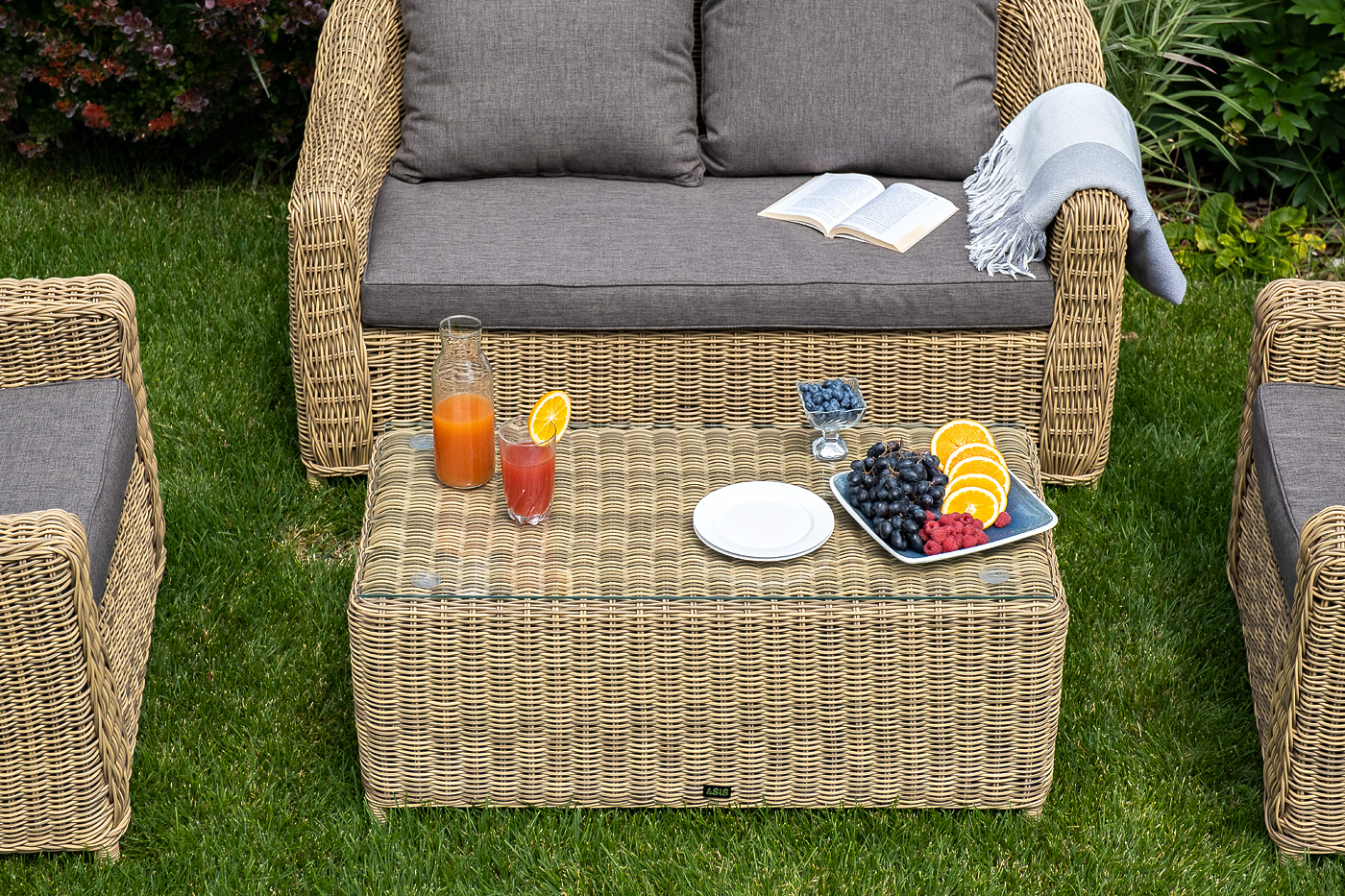 Лаунж-зона «Кон Панна» компактный комплект, рассчитанный на 4 персоны. В ее состав входят: - два плетеных кресла – 800×800×800 мм. - двухместный диван – 1370×800×800 мм. - журнальный столик – 1000×500×420 мм. В основе мебели - алюминиевый каркас и круглый искусственный ротанг. Каркас оплетен с помощью ручного метода и представлен в соломенном цвете. Диван и кресла укомплектованы подушками со съемными чехлами из полиэстера, плотностью 230гр/м2, с влагоотталкивающей пропиткой. Журнальный столик дополняет рабочая поверхность из прочного закаленного стекла, толщина – 5 мм. “Кон Панна” диван из искусственного ротанга двухместный, цвет соломенный 1шт. 1 370Х800Х800, “Кон Панна” кресло из искусственного ротанга, цвет соломенный 2шт. 800Х800Х800, “Кон Панна” столик журнальный из искусственного ротанга, цвет соломенный 1шт. 1 000Х500Х420,