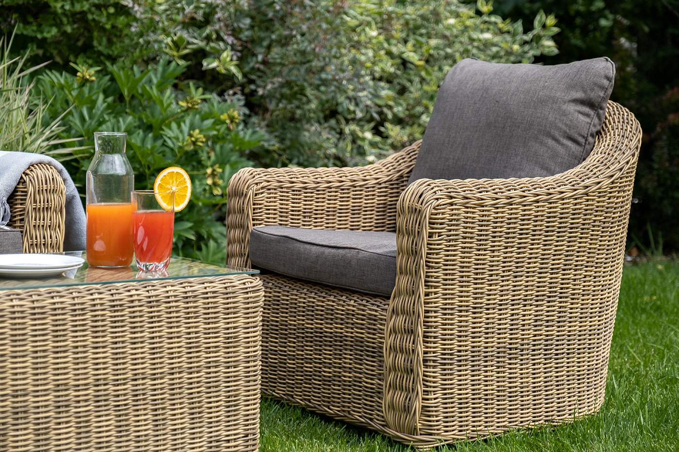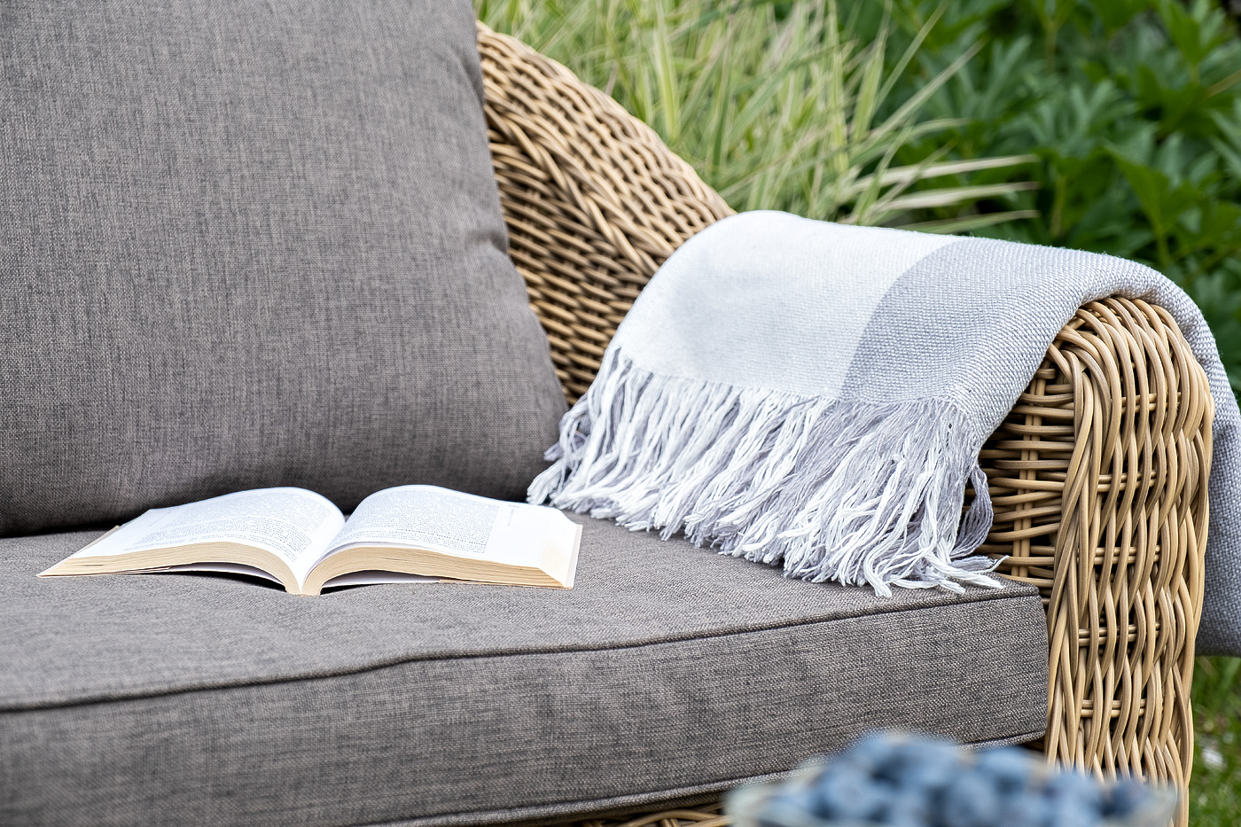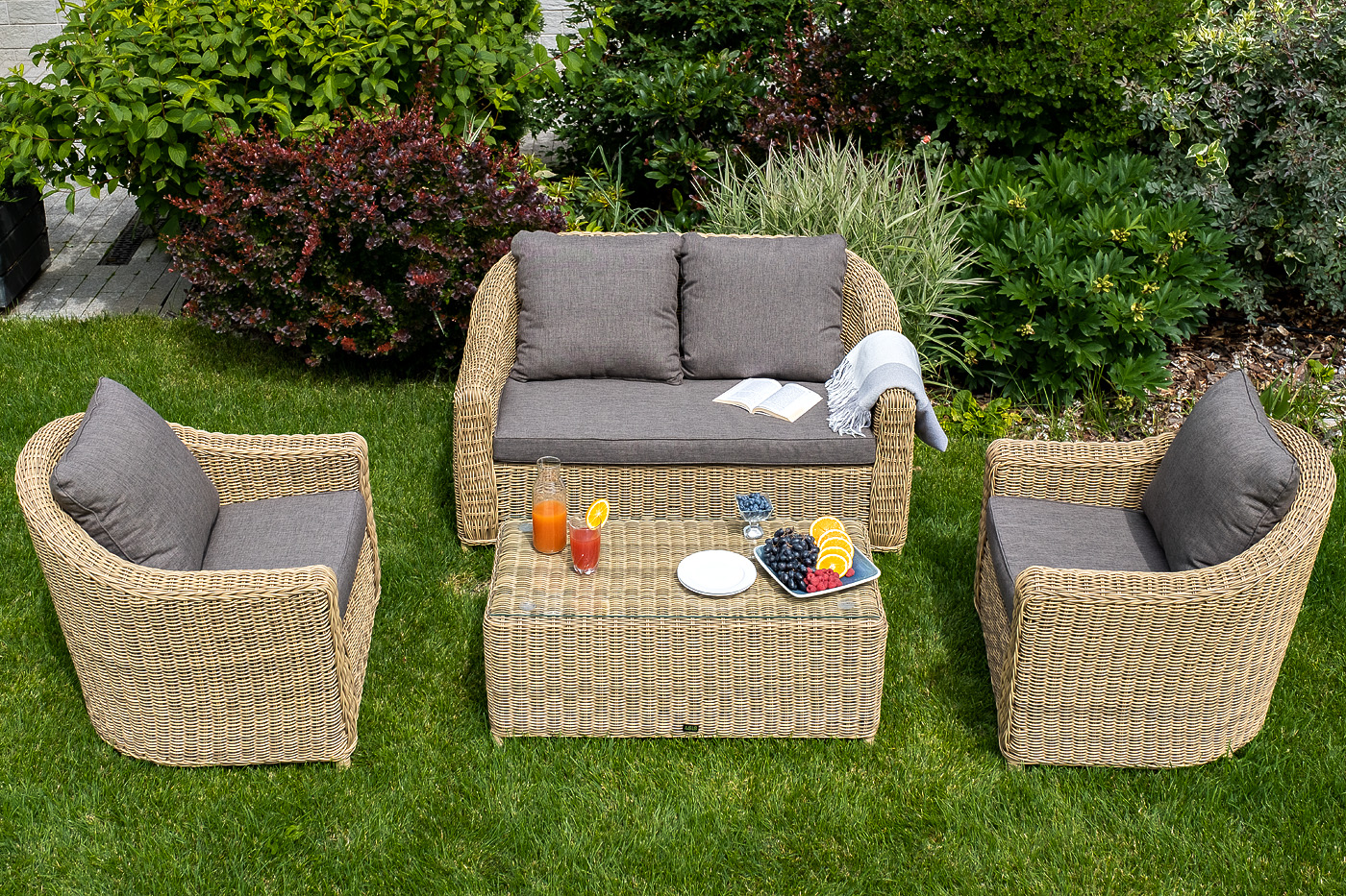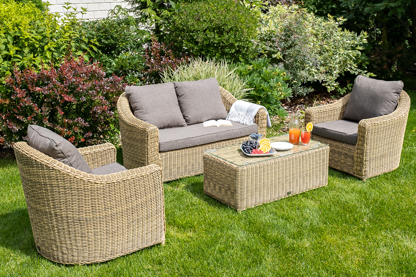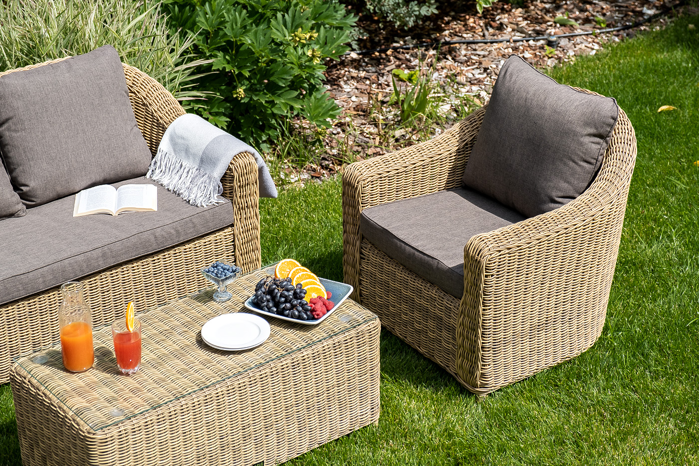 Лаунж-зона «Кон Панна» компактный комплект, рассчитанный на 4 персоны. В ее состав входят: - два плетеных кресла – 800×800×800 мм. - двухместный диван – 1370×800×800 мм. - журнальный столик – 1000×500×420 мм. В основе мебели - алюминиевый каркас и круглый искусственный ротанг. Каркас оплетен с помощью ручного метода и представлен в соломенном цвете. Диван и кресла укомплектованы подушками со съемными чехлами из полиэстера, плотностью 230гр/м2, с влагоотталкивающей пропиткой. Журнальный столик дополняет рабочая поверхность из прочного закаленного стекла, толщина – 5 мм. “Кон Панна” диван из искусственного ротанга двухместный, цвет соломенный 1шт. 1 370Х800Х800, “Кон Панна” кресло из искусственного ротанга, цвет соломенный 2шт. 800Х800Х800, “Кон Панна” столик журнальный из искусственного ротанга, цвет соломенный 1шт. 1 000Х500Х420,