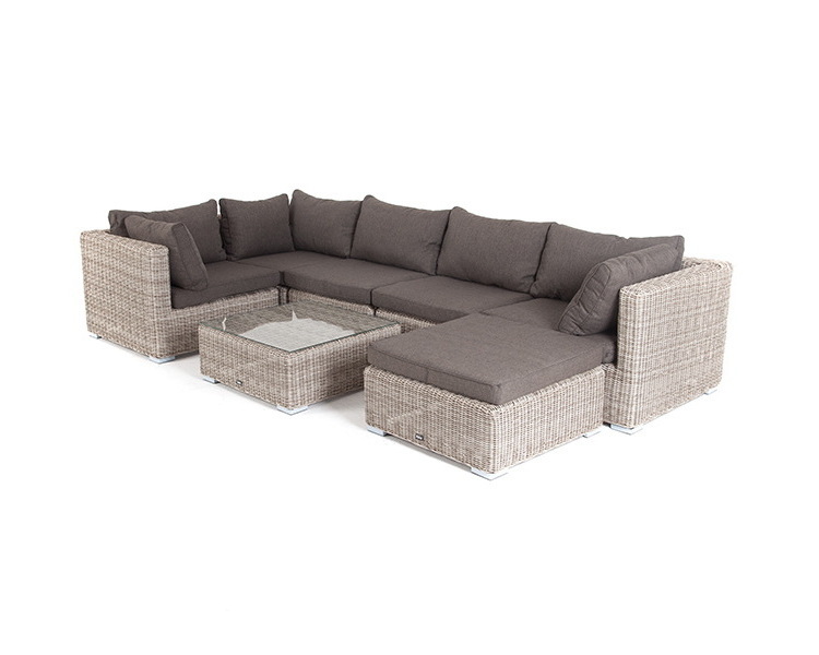 Лаунж-зона из искусственного ротанга бежевого цвета «Лунго» производит невероятное впечатление и окунает в мир уюта, благодаря продуманному и лаконичному дизайну. Модель состоит из семи предметов, каждый из которых изготовлен из прочного алюминиевого каркаса, оплетка выполнена вручную. В группу лаунж-зоны входят следующие элементы: - кофейный столик со столешницей из ударопрочного 5 мм стекла 740×740×300 мм. - три угловых модуля 860×860×650 мм. - два прямых модуля 740×860×650 мм . - оттоманка 740×740×380 мм. Дополнением является комплект мягких подушек со съемными чехлами, произведенными из полиэстера и пропитанными специальным влагоотталкивающим составом. “Лунго” модуль диванный угловой с подушками, цвет бежевый 3шт. 860Х860Х650, “Лунго” модуль диванный прямой с подушками, цвет бежевый 2шт. 740Х860Х650, “Лунго” журнальный столик плетеный, цвет бежевый 1шт. 740Х740Х300, “Лунго” плетеная оттоманка с подушкой, цвет бежевый 1шт. 740Х740Х380,