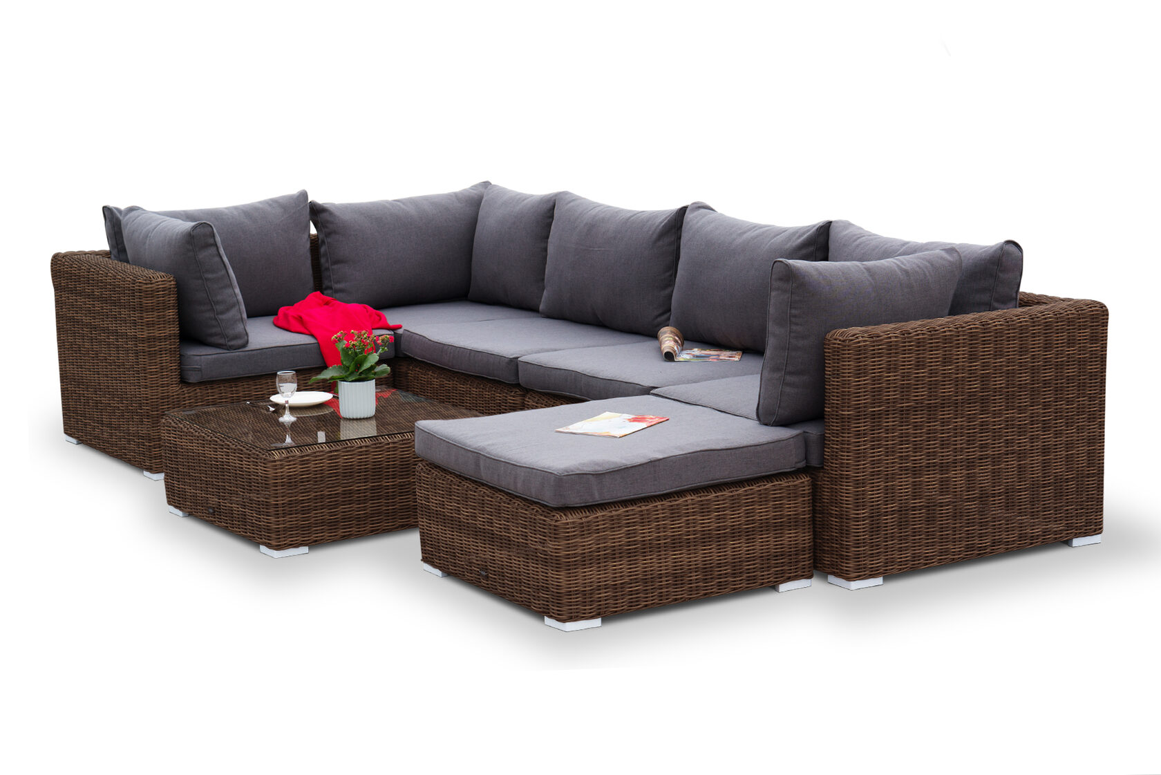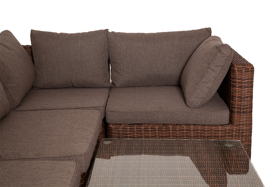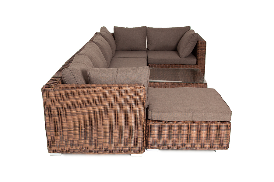 Составная и легко трансформирующаяся лаунж-зона «Лунго» гармонично дополнит зону отдыха на частной территории. Она состоит из целого набора мебели, в который входит: - журнальный столик – 740×740×300 мм. - три угловых модуля – 860×860×650 мм. - два прямых модуля – 740×860×650 мм. - квадратная оттоманка – 740×740×380 мм. При изготовлении каркаса всех составляющих комплекта используется высокопрочный алюминий. Он дополнен круглым плетением из искусственного ротанга. Цвет – коричневый. Модули дивана и оттоманка укомплектованы подушками со съемными чехлами серо-коричневого цвета. Они состоят из полиэстера с плотностью 230гр/м2. Защитные качества материала усилены путем его обработки влагоотталкивающими составами. Плетеный столик имеет стеклянную столешницу, изготовленную из прочного закаленного стекла, толщина - 5 мм. “Лунго” модуль диванный прямой с подушками, цвет коричневый 2шт. 740Х860Х650, “Лунго” модуль диванный угловой с подушками, цвет коричневый 3шт. 860Х860Х650, “Лунго” плетеная оттоманка с подушкой, цвет коричневый 1шт. 740Х740Х380, “Лунго” журнальный столик плетеный, цвет коричневый 1шт. 740Х740Х300,