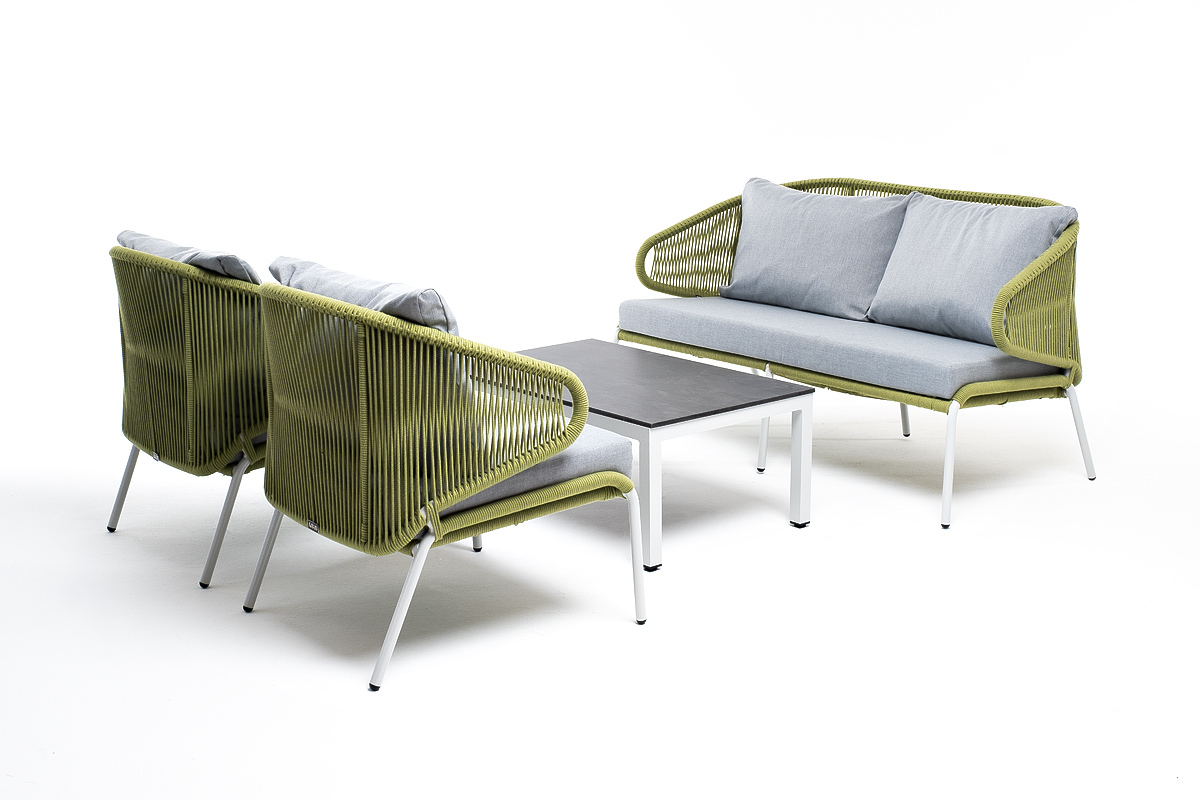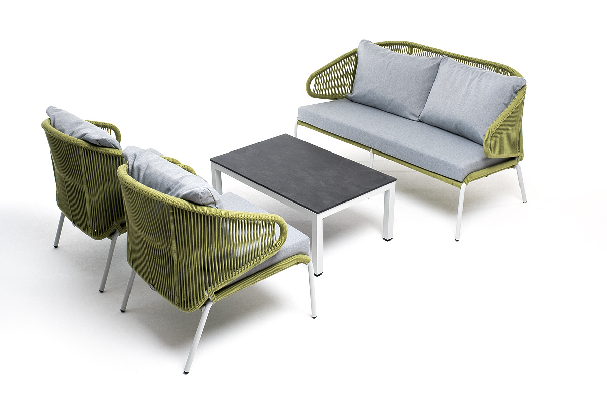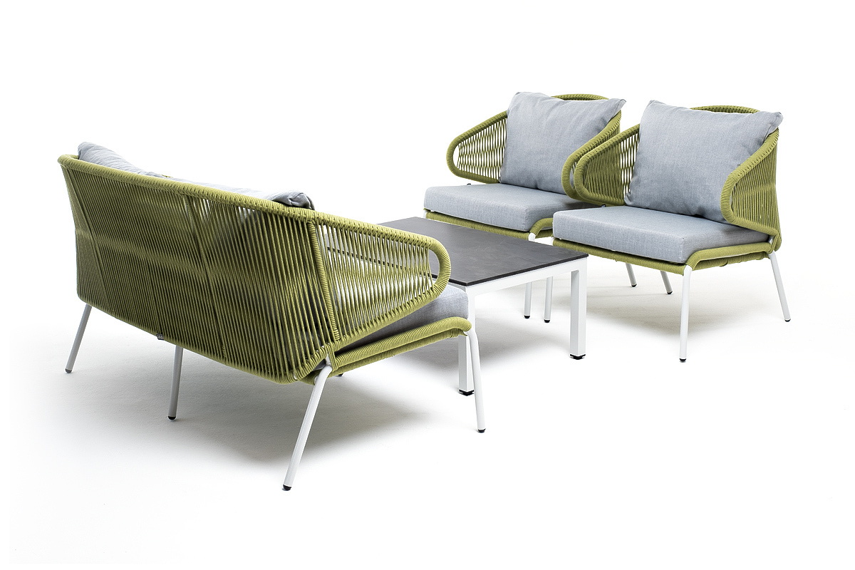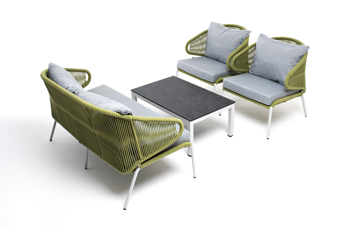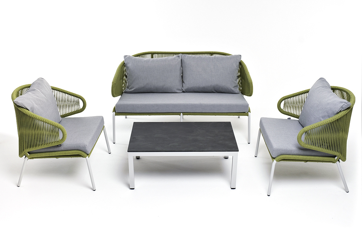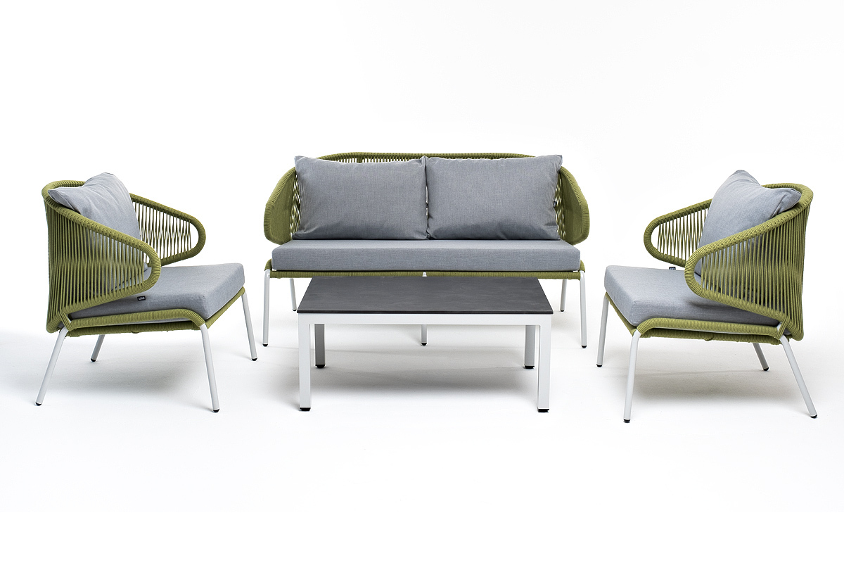 Лаунж-зона «Милан» предназначена для размещения четырех персон. Она включает в себя: - журнальный столик (размер - 950×600×400 мм). - два плетеных кресла (размер - 700×650×830 мм). - двухместный диван (размер - 1450×650×830 мм). Каркас уличной мебели выполнен из износостойкого алюминия. Его дополняет ручная оплетка - салатовый меланж, изготовленная на основе эластичных синтетических лент из полиэфирных волокон высокой прочности (роупа). Кресла и диван идут в комплекте с мягкими подушками в чехлах светло-серого цвета. “Милан” диван 2-местный плетеный из роупа, каркас алюминий светло-серый (RAL7035) шагрень, роуп салатовый меланж круглый, ткань светло-серая 1шт. 1 450Х650Х830, “Милан” кресло плетеное из роупа, каркас алюминий светло-серый (RAL7035) шагрень, роуп салатовый меланж круглый, ткань светло-серая 2шт. 700Х650Х830, “Канны” журнальный столик из HPL 95х60, H40, каркас белый, цвет столешницы “серый гранит” 1шт. 950Х600Х400,