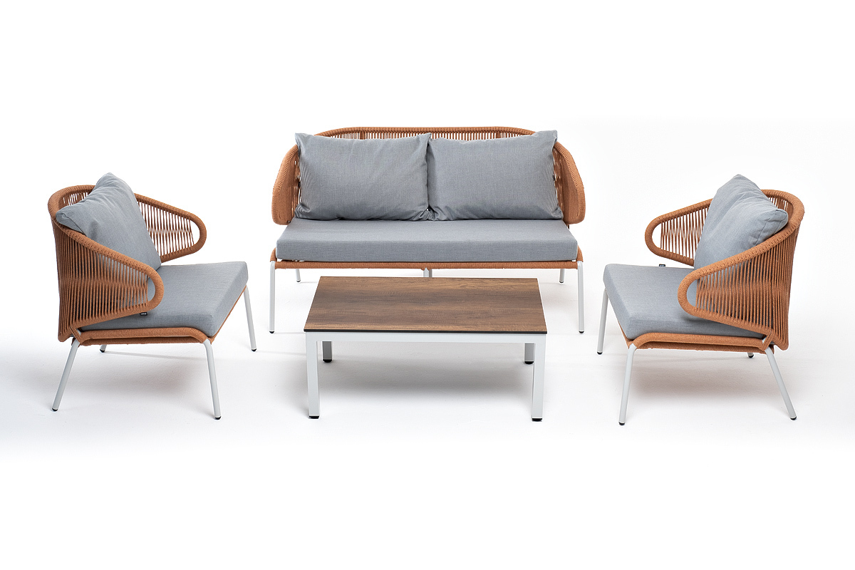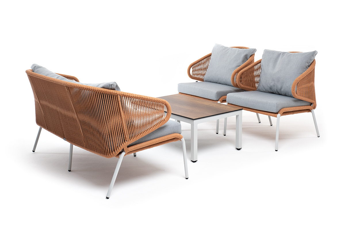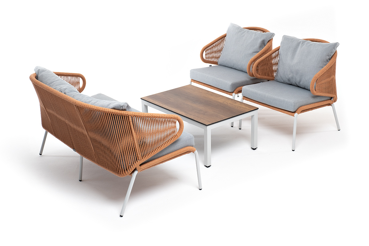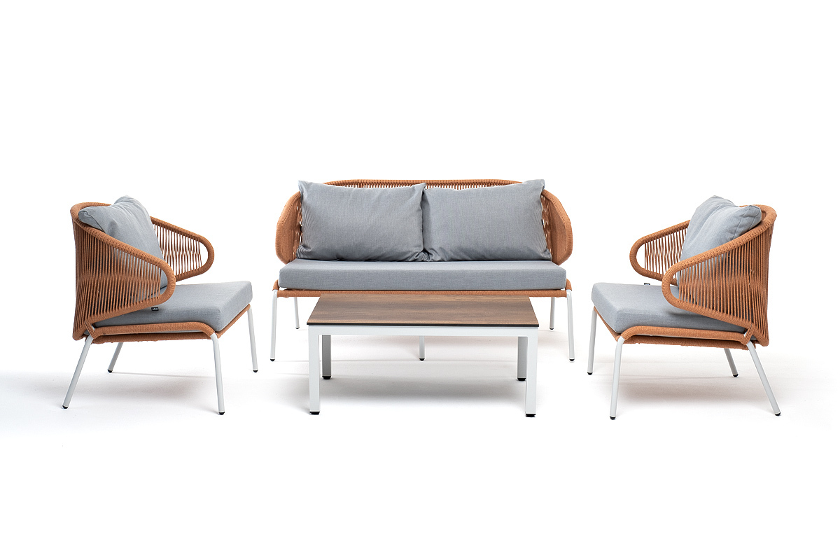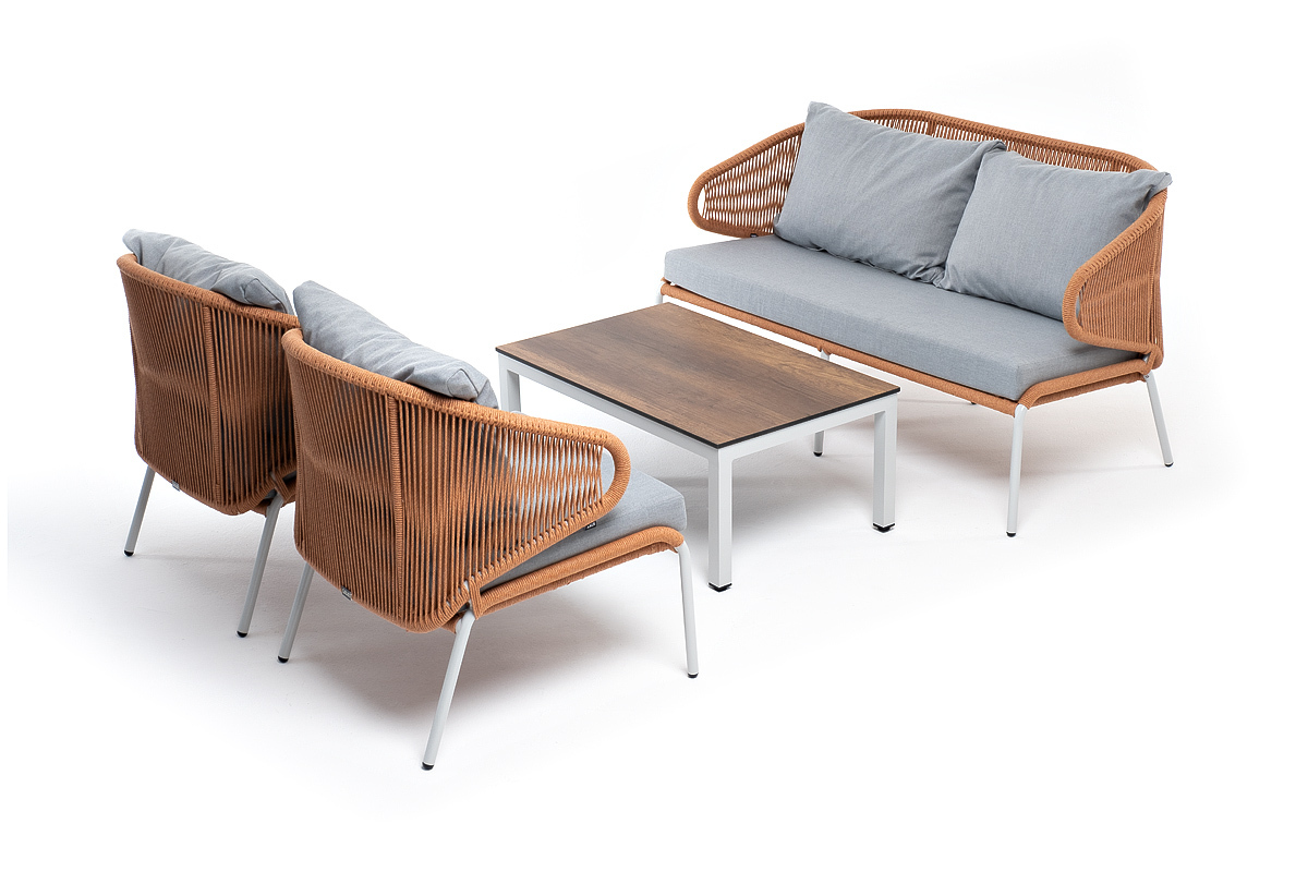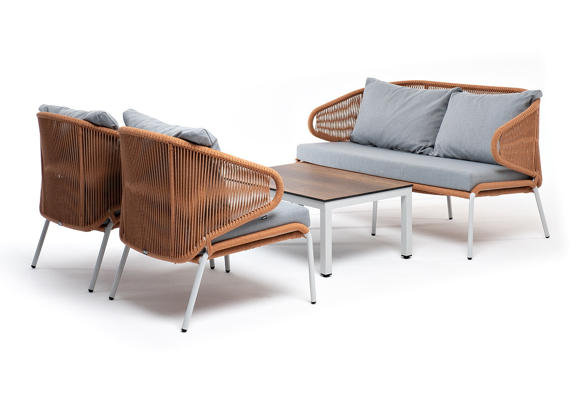 Лаунж-зона «Милан» предназначена для размещения четырех персон. Она включает в себя: - журнальный столик (размер - 950×600×400 мм). - два плетеных кресла (размер - 700×650×830 мм). - двухместный диван (размер - 1450×650×830 мм). Каркас уличной мебели выполнен из износостойкого алюминия. Его дополняет оплетка цвета оранжевый меланж, изготовленная на основе эластичных синтетических лент из полиэфирных волокон высокой прочности. Кресла и диван идут в комплекте с мягкими подушками в чехлах светло-серого цвета. “Милан” диван 2-местный плетеный из роупа, каркас алюминий светло-серый (RAL7035) шагрень, роуп оранжевый меланж круглый, ткань светло-серая 1шт. 1 450Х650Х830, “Милан” кресло плетеное из роупа, каркас алюминий светло-серый (RAL7035) шагрень, роуп оранжевый меланж круглый, ткань светло-серая 2шт. 700Х650Х830, “Канны” журнальный столик из HPL 95х60, H40, каркас белый, цвет столешницы “дуб” 1шт. 950Х600Х400,