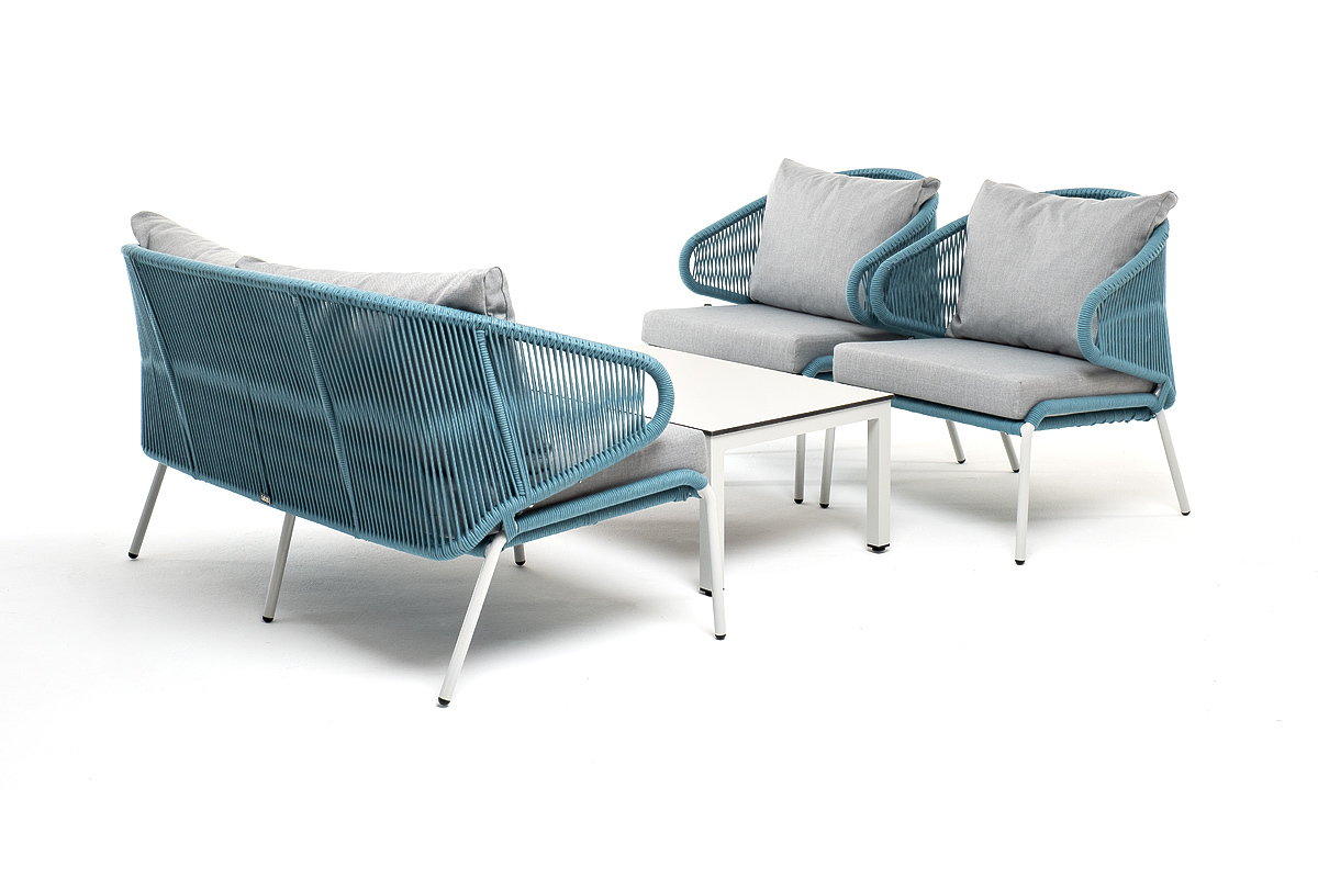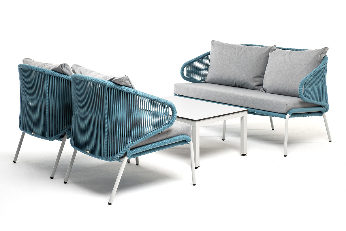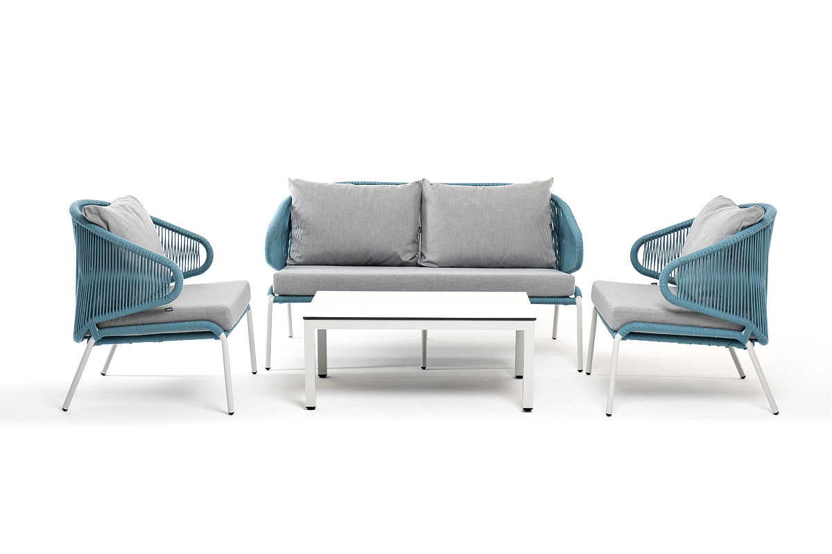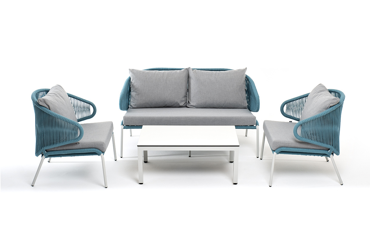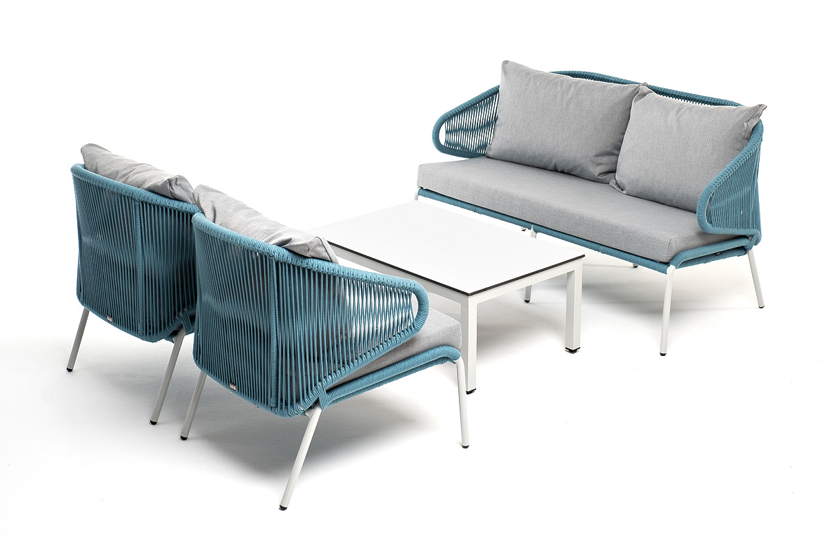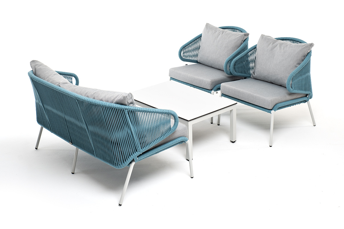 Лаунж-зона «Милан» предназначена для размещения четырех персон. Она включает в себя: - журнальный столик (размер - 950×600×400 мм). - два плетеных кресла (размер - 700×650×830 мм). - двухместный диван (размер - 1450×650×830 мм). Каркас уличной мебели выполнен из износостойкого алюминия. Его дополняет бирюзовая ручная оплетка, изготовленная на основе эластичных синтетических лент из полиэфирных волокон высокой прочности (роупа). Кресла и диван идут в комплекте с мягкими подушками в чехлах светло-серого цвета. “Милан” диван 2-местный плетеный из роупа, каркас алюминий светло-серый (RAL7035) шагрень, роуп бирюзовый круглый, ткань светло-серая 1шт. 1 450Х650Х830, “Милан” кресло плетеное из роупа, каркас алюминий светло-серый (RAL7035) шагрень, роуп бирюзовый круглый, ткань светло-серая 2шт. 700Х650Х830, “Канны” журнальный столик из HPL 95х60, H40, каркас белый, цвет столешницы “молочный” 1шт. 950Х600Х400,