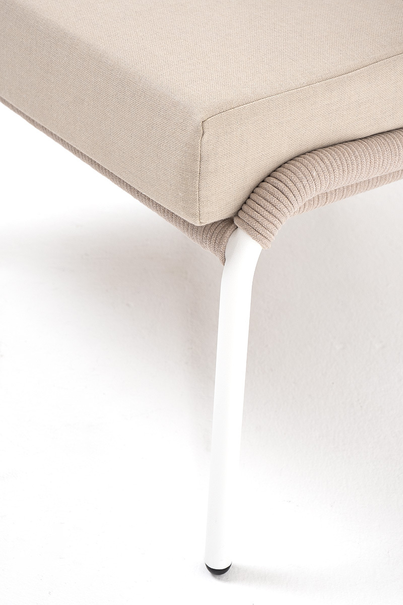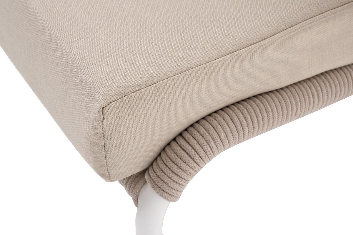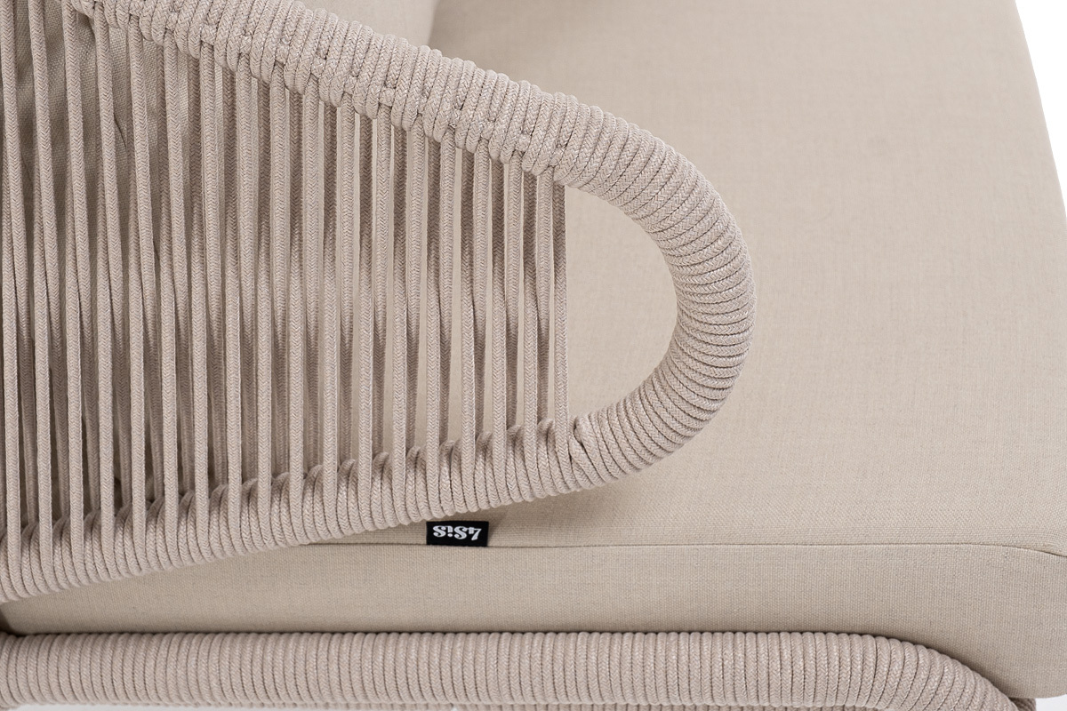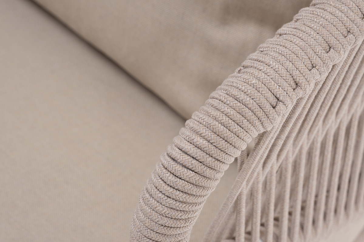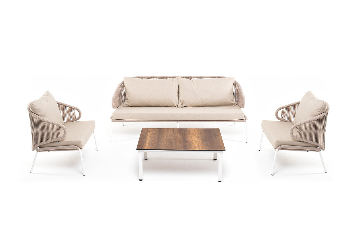 Лаунж-зона «Милан» предназначена для размещения пяти персон. Она включает в себя: - два плетеных кресла (размер - 700×650×830 мм). - трехместный диван (размер - 2000×650×830 мм). - журнальный столик (размер - 950×600×400 мм). Каркас уличной мебели выполнен из износостойкого алюминия. Его дополняет бежевая ручная оплетка, изготовленная на основе эластичных синтетических лент из полиэфирных волокон высокой прочности (роупа). Кресла и диван идут в комплекте с мягкими подушками в чехлах бежевого цвета. “Канны” журнальный столик из HPL 95х60, H40, каркас белый, цвет столешницы “дуб” 1шт. 950Х600Х400, “Милан” диван 3-местный плетеный из роупа, каркас алюминий белый муар, роуп бежевый круглый, ткань бежевая 035 1шт. 2 000Х650Х830, “Милан” кресло плетеное из роупа, каркас алюминий белый муар, роуп бежевый круглый, ткань бежевая 035 2шт. 700Х650Х830,
