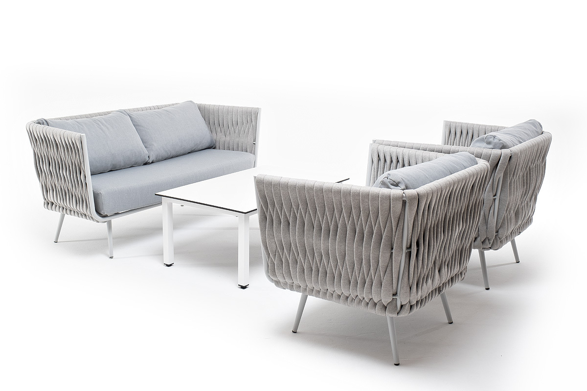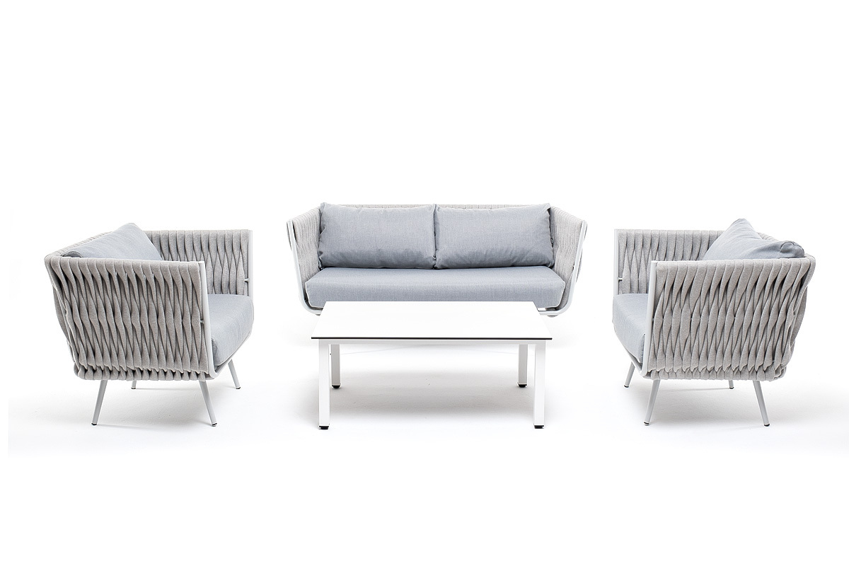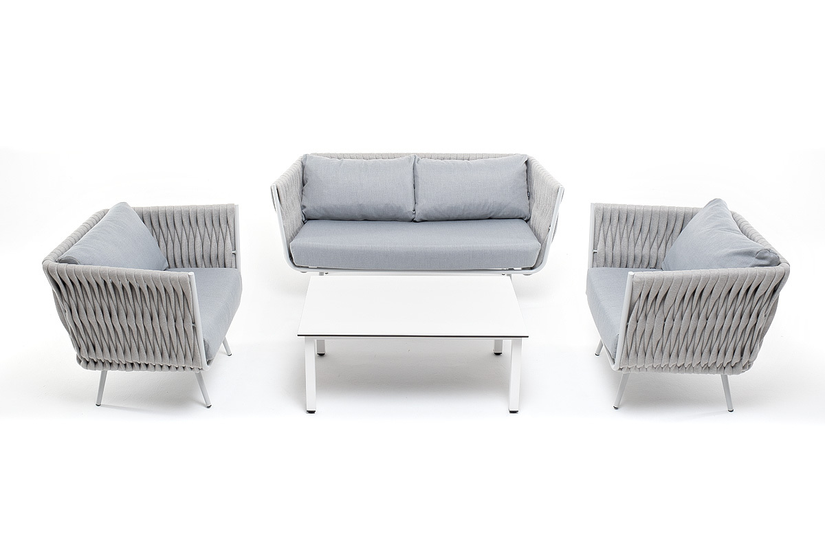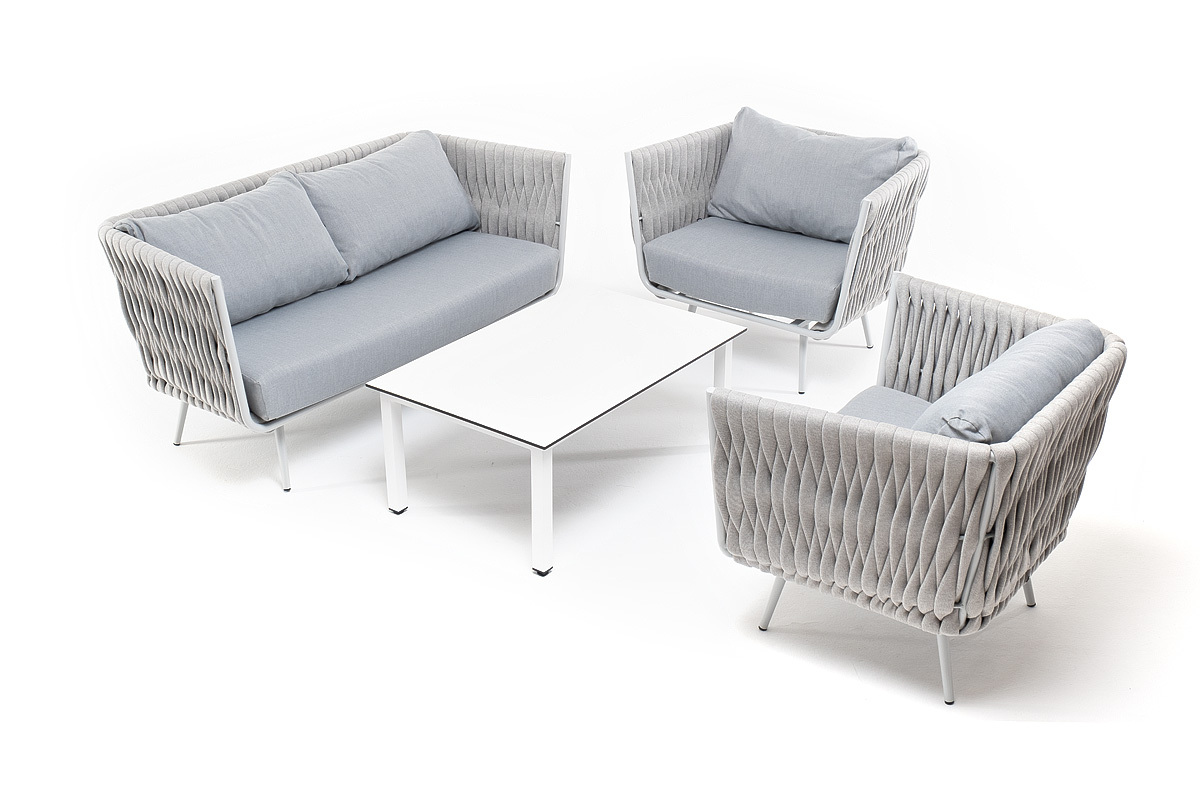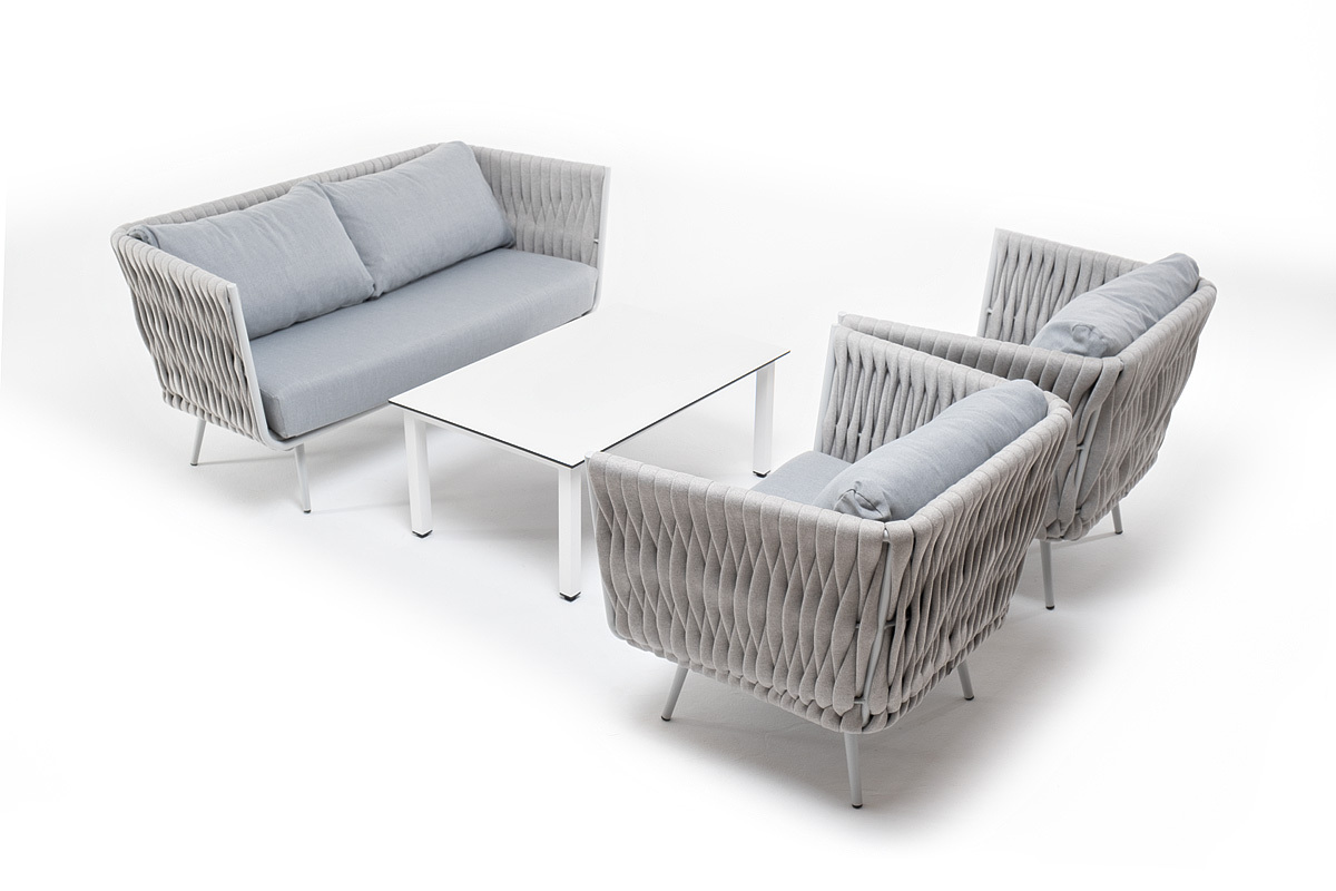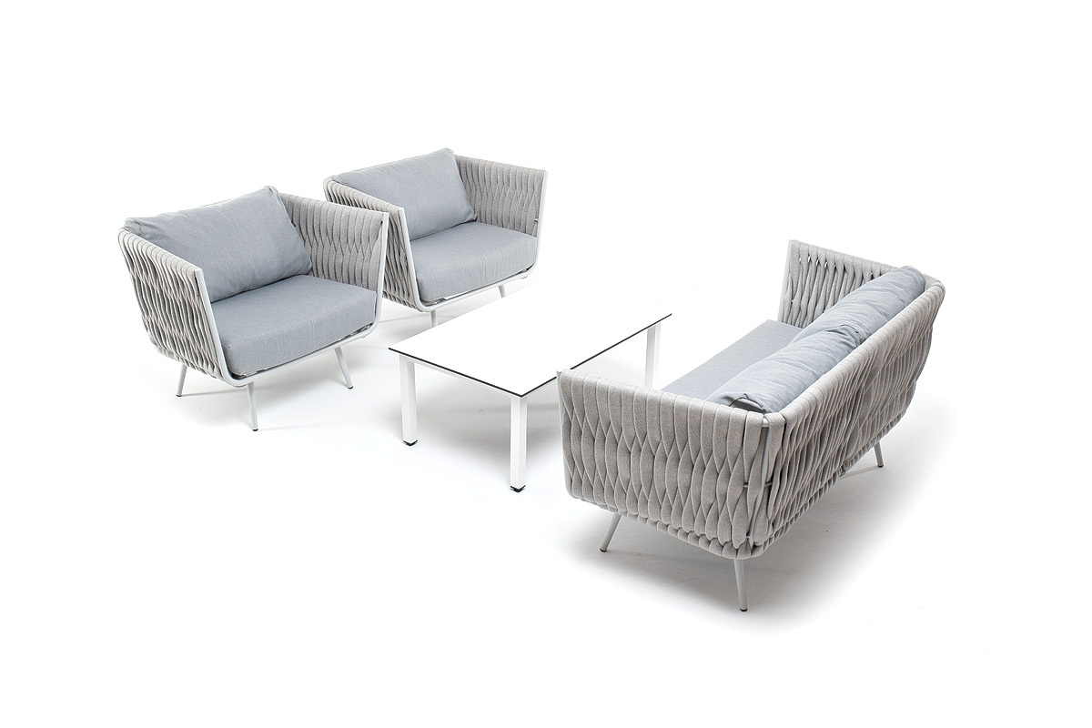 Лаунж-зона «Монако» предназначена для размещения четырех персон. Она включает в себя: - журнальный столик (размер – 950×400×600 мм). - два плетеных кресла (размер – 980х750х700 мм). - двухместный диван (размер – 1600×750×700 мм). Каркас уличной мебели выполнен из алюминия. Его дополняет светло-серая оплетка, изготовленная на основе эластичных синтетических лент из полиэфирных волокон высокой прочности. Кресла и диван идут в комплекте с мягкими подушками в чехлах светло-серого цвета. “Монако” диван 2-местный плетеный из роупа, каркас алюминий светло-серый (RAL7035) муар, роуп светло-серый 40 мм, ткань светло-серая 1шт. 1 600Х700Х750, “Монако” кресло плетеное из роупа, каркас алюминий светло-серый (RAL7035) муар, роуп светло-серый 40 мм, ткань светло-серая 2шт. 980Х700Х750, “Канны” журнальный столик из HPL 95х60, H40, каркас белый, цвет столешницы “молочный” 1шт. 950Х600Х400,