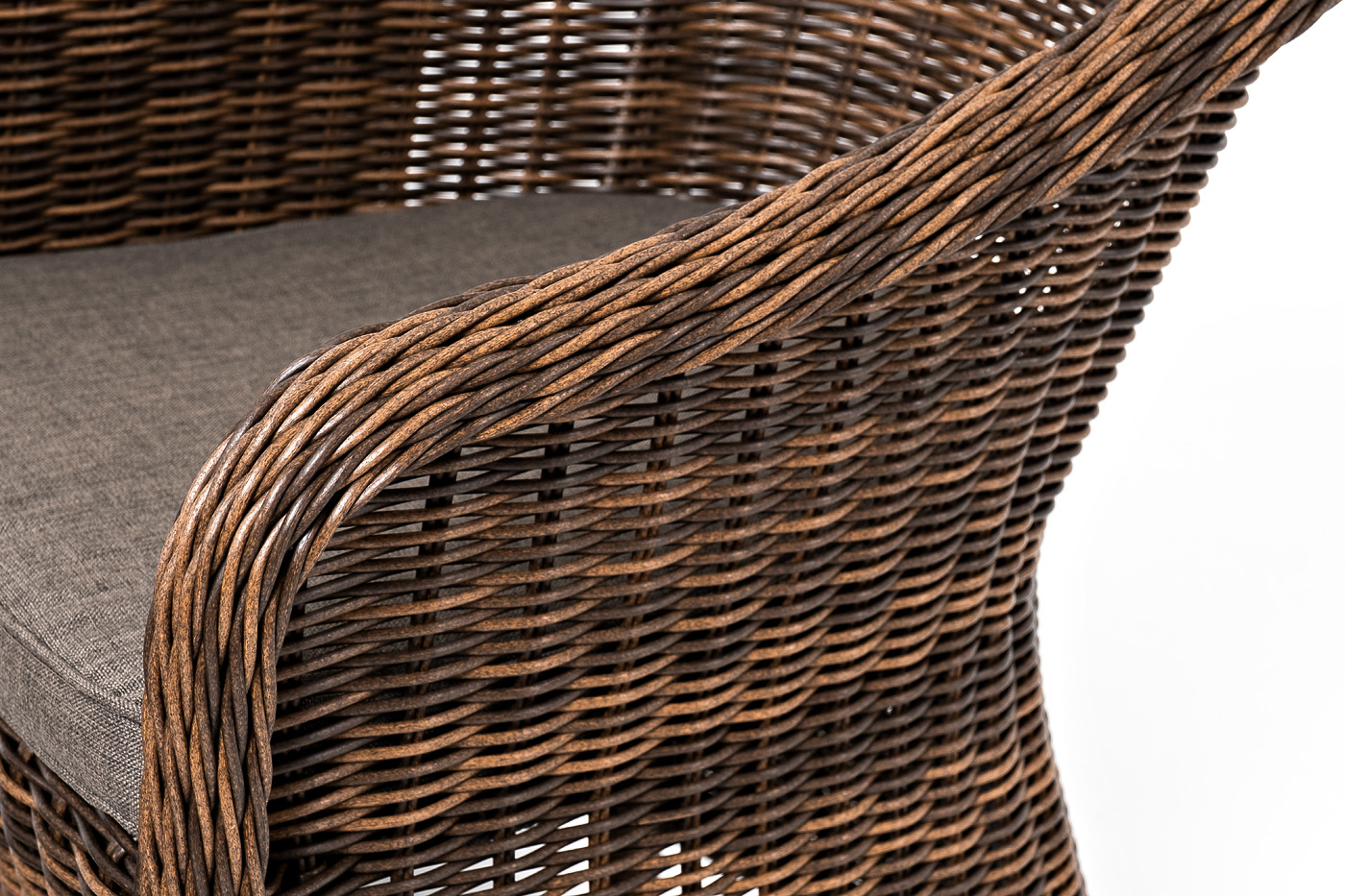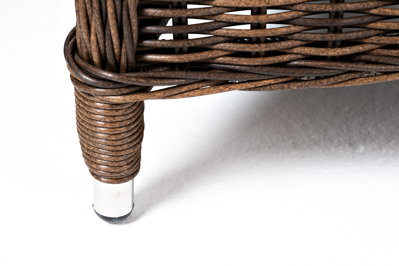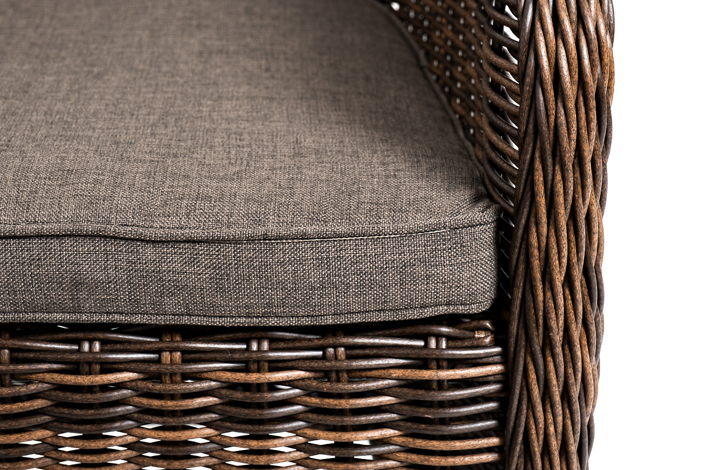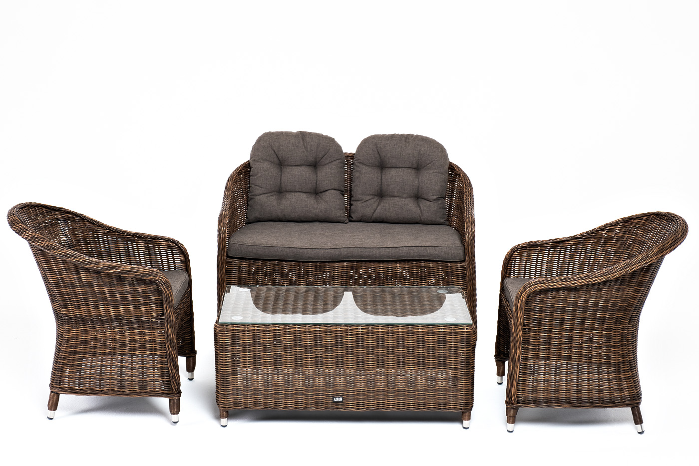 Комплект для лаунж-зоны «Равенна» рассчитан на 4 персоны. В состав водят: - двухместный диван - 1180×680×810 мм. - 2 кресла - 570×680×810 мм. - журнальный столик - 1000×500×420 мм. Комплект выполнен из круглого искусственного ротанга коричневого цвета. Каркас - из легкого и прочного алюминия. Подушки со съемными чехлами - из 100% полиэстера, плотностью 230гр/м2 с влагоотталкивающей пропиткой. “Равенна” диван двухместный плетенный из ротанга, цвет коричневый 1шт. 1 180Х680Х810, “Равенна” плетеное кресло из искусственного ротанга, цвет коричневый с серо-коричневой подушкой 2шт. 570Х680Х810, “Кон Панна” столик журнальный из искусственного ротанга, цвет коричневый 1шт. 1 000Х500Х420,