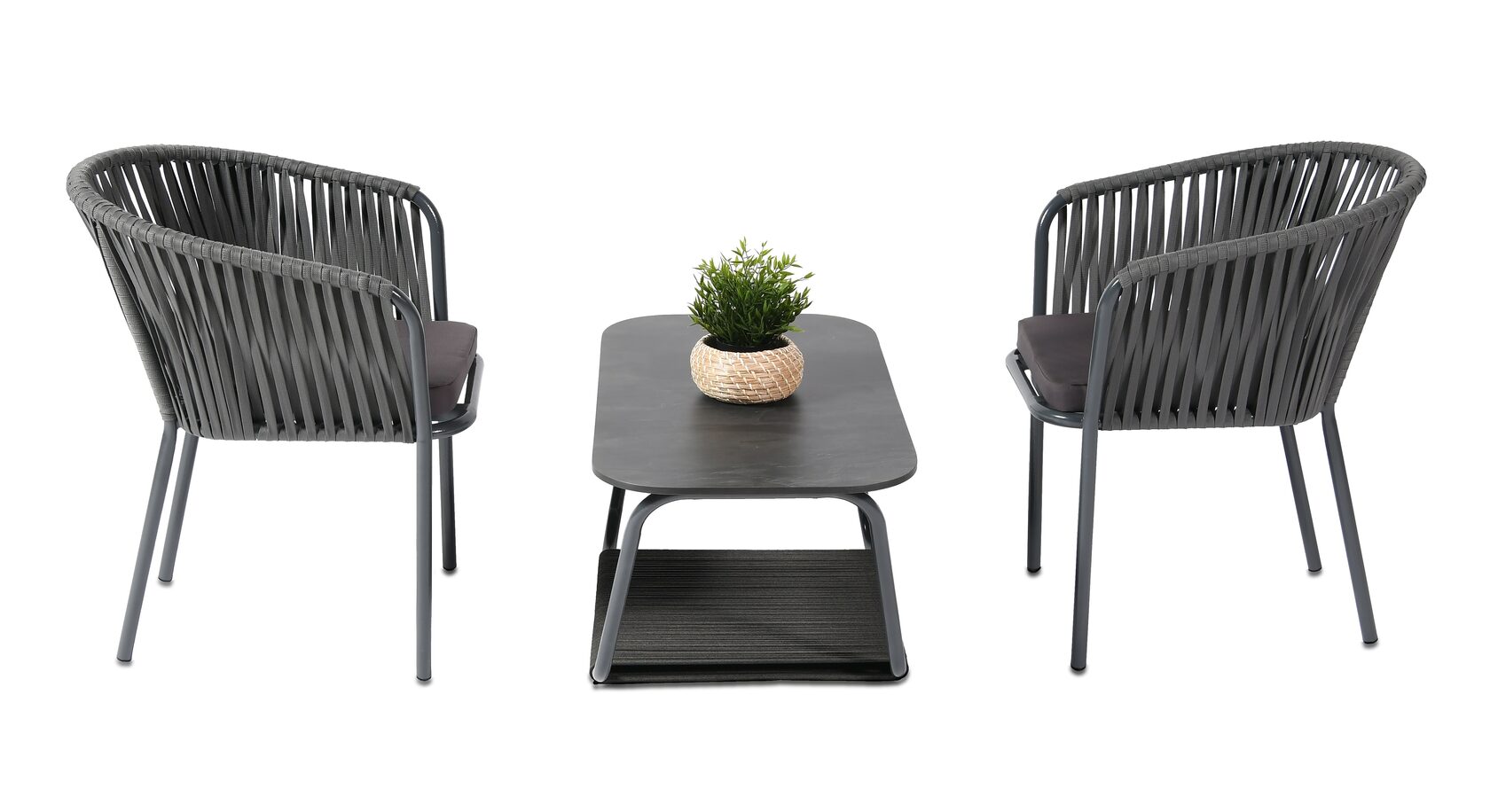 Кофейный набор «Тулон» состоит из: - журнального столика «Гранада» - 1000×650×400 мм. - двух стульев «Бордо» - 570×520×775 мм. Каркас мебели изготовлен из прочного алюминия и окрашен в темно-серый цвет специальной износостойкой краской. Столешница журнального столика выполнена из высококачественного монолитного компакт-пластика HPL, толщиной 12 мм. Цвет поверхности имитирует черный мрамор. Нижняя часть столика задекорирована роупом - эластичными лентами из полиэфирных волокон. Каркас стульев вручную оплетен также роупом, аналогичного темно-серого цвета. В комплект входят подушки со съемными чехлами с влагоотталкивающей пропиткой. Материал - 100% полиэстер плотностью 300гр/м2. “Гранада” журнальный стол 100х65см из HPL, цвет “серый гранит” 1шт. 1 000Х650Х420, “Бордо” стул плетеный из роупа, каркас алюминий темно-серый (RAL7024) муар, роуп серый 15мм, ткань серая 017 2шт. 570Х620Х775,