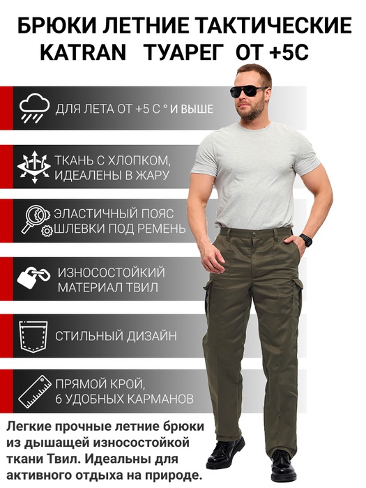 Брюки летние тактические KATRAN ТУАРЕГ- это идеальный выбор для активного отдыха и тактических игр в теплое время года (рекомендуемая температура от +5°C и выше). Брюки изготовлены из легкой, но прочной ткани с использованием технологии рип-стоп, они обеспечивают отличную защиту и комфорт. Сочетание 65% хлопока и 35% вискозы делает ткань одновременно легкой, но прочной. Такое сочетание материалов позволяет ткани прекрасно дышать и отводить влагу.