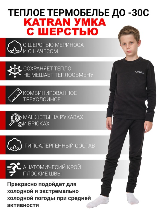 Детское шерстяное термобельё KATRAN УМКА создано для использования в холодную и экстремально холодную погоду. В качестве основного материала используется инновационное трехслойное полотно с высоким содержанием шерсти мериносов. Шерсть мериноса обладает великолепными теплоизоляционными свойствами, при этом не колется, не вызывает аллергии и обладает антибактериальными свойствами. Для своего термобелья мы используем лучшую шерсть от концерна Schoeller (Австрия). Плюс к этому в составе термобелья присутствует полиэстер и полиамид, которые помогают правильно отводить влагу от тела, оставляя кожу сухой и теплой. И не стоит забывать, что полиэстер повышает прочность и долговечность самого полотна.