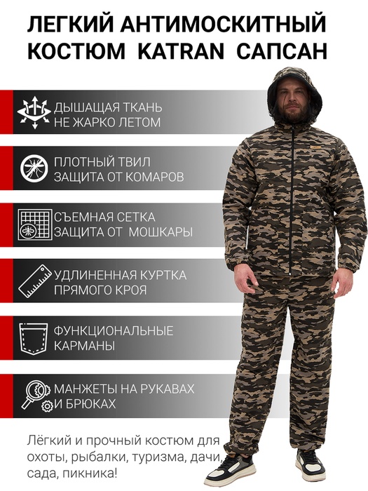 Костюм антимоскитный KATRAN Сапсан — прекрасно подойдет для всех любителей охоты, рыбалки и просто активного отдыха. Костюм состоит из куртки и брюк. Костюм сшит из ткани Твил (65% ПЭ, 35% хлопок). Дышащая ткань для самого жаркого лета. На куртке расположено 3 функциональных кармана, два прорезных кармана в зоне талии и 1 на груди. Также на костюме есть объёмный капюшон с атимоскитной сеткой, которую вы можете без проблем отстегнуть. Куртка удлиненная.