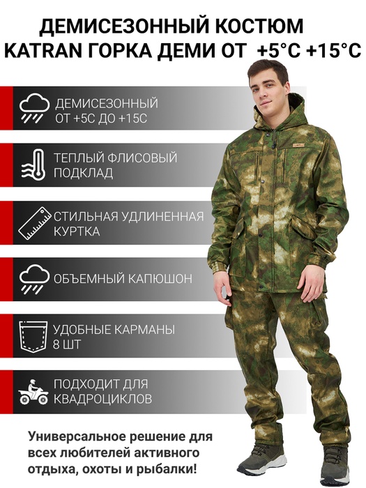 Костюм Katran Горка ДЕМИ полофлис — это универсальный костюм для всех любителей охоты, рыбалки и туризма. В качестве основного материала в нем используется современная ткань полофлис которая прекрасно противостоит всем погодным сюрпиризам. Главный секрет костюма — анатомический крой и современные материалы. Основной упор сделан на удобство и практичность. Костюм состоит из удлиненной куртки и брюк.