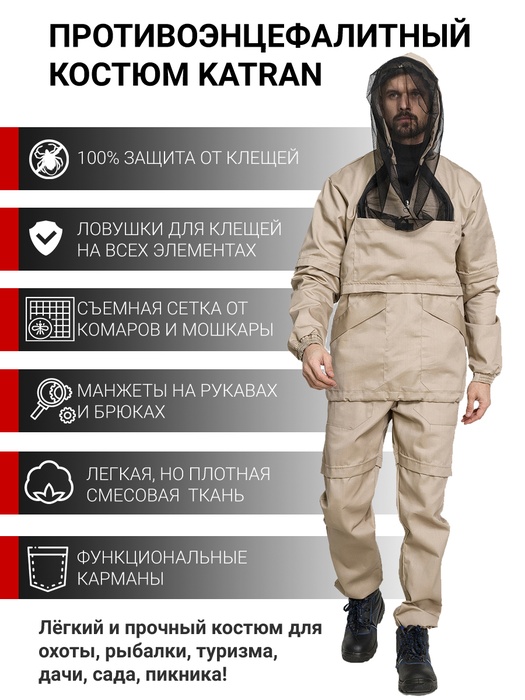 Противоэнцефалитный костюм KATRAN АМУР — это универсальный костюм для охотников, рыбаков и любителей активного отдыха на природе. Костюм прекрасно защитит вас от любых кровососущих насекомых, в особенности от клещей. Конструкция костюма просто не позволит клещу проникнуть под одежду. В модели предусмотрены круговые ловушки на штанах, талии и рукавах. Ловушки разработаны таким образом, чтобы, попав в них, клещ не смог выбраться обратно.