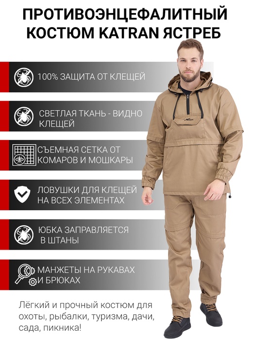 KATRAN ЯСТРЕБ — это современный противоэнцефалитный костюм. Костюм изготовлен из прочной и легкой ткани твил, обеспечивая вам комфорт и надежную защиту во время охоты, рыбалки и туризма. Продукт предназначен для защиты от кровососущих насекомых, таких как комары и клещи.