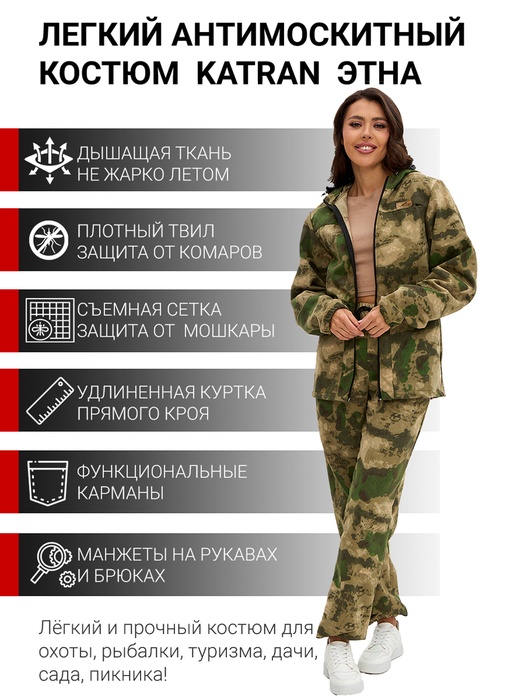Костюм антимоскитный KATRAN Этна — прекрасно подойдет для всех любителей охоты, рыбалки и просто активного отдыха. Костюм состоит из куртки и брюк. Костюм сшит из ткани Твил (65% ПЭ, 35% хлопок). Дышащая ткань для самого жаркого лета. На куртке расположено 3 функциональных кармана, два прорезных кармана в зоне талии и 1 на груди. Также на костюме есть объёмный капюшон с атимоскитной сеткой, которую вы можете без проблем отстегнуть. Куртка удлиненная.