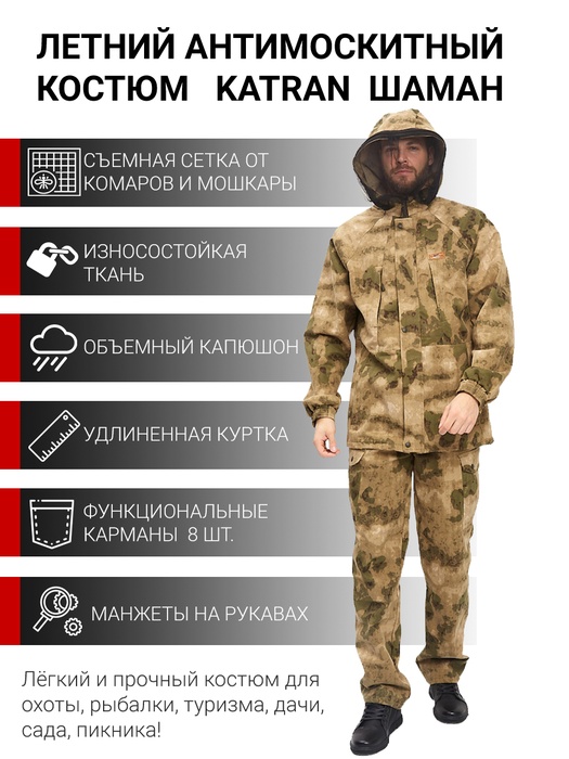 Чтобы купить Летний антимоскитный костюм KATRAN Шаман 00374 оптом по цене 4600 руб., свяжитесь с поставщиком. Компания поставщик — Katran (ООО «ОНП») из города Москва. Минимальная сумма оптового заказа: 50000 руб. Минимальная партия 5 шт. Доставка возможна самовывоз, транспортной компанией, курьером. Способы оплаты: безналичная оплата, наличными.