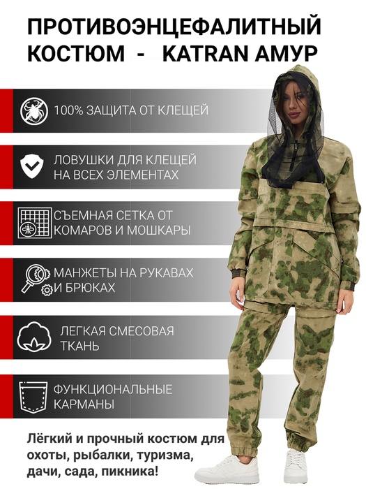 Противоэнцефалитный костюм KATRAN АМУР — это универсальный костюм для охотников, рыбаков и любителей активного отдыха на природе. Костюм прекрасно защитит вас от любых кровососущих насекомых, в особенности от клещей. Конструкция костюма просто не позволит клещу проникнуть под одежду. В модели предусмотрены круговые ловушки на штанах, талии и рукавах. Ловушки разработаны таким образом, чтобы, попав в них, клещ не смог выбраться обратно.