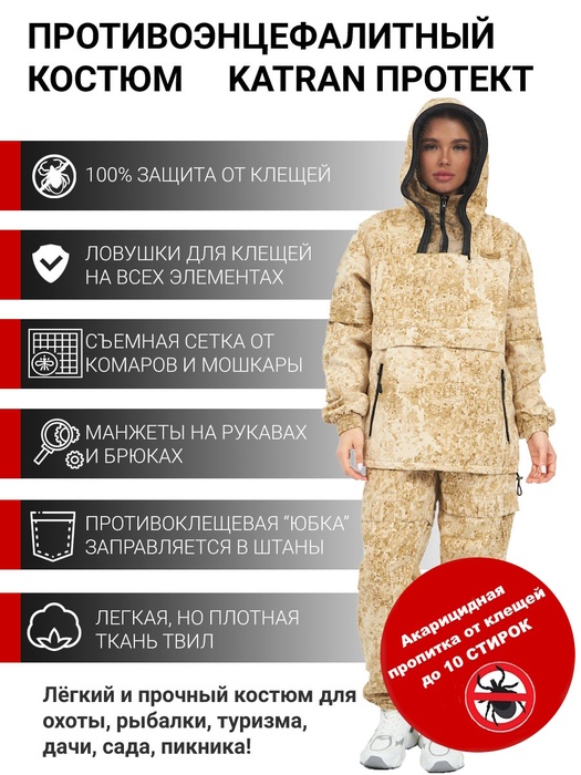 Противоэнцефалитный костюм KATRAN ПРОТЕКТ — это классический антиклещевой костюм, выполненный из натуральной ткани “Твил”. Костюм состоит из куртки типа анорак и брюк.