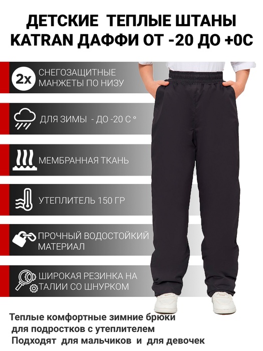 Зимние подростковые штаны KATRAN Даффи (КАТРАН Даффи) — это теплые и комфортные брюки для зимы. В качестве основной ткани используется прочная и практичная мембранная ткань Локкер, которая защитит вашего ребенка от дождя, ветра, холода и прекрасно “дышит”. В качестве утеплителя используется синтепон плотностью 150 мг, который отлично сохраняет температуру и обладает гипоаллергенными свойствами. Мы рекомендуем использовать данные брюки в прохладную погоду (температурный диапазон от -20 до +0 градусов). Благодаря прямому крою и комфортной резинке-поясу брюки не сковывают движения. На поясе брюк предусмотрена утяжка, а по бокам брюк расположено два кармана. Брюки идеально подойдут для школьников, так как благодаря свободному крою прекрасно одеваются поверх школьной формы. Отдельно хотим заметить, что лучше всего использовать мембранную одежду совместно со специальным термобельём. Такой вариант использования позволит вам максимально чётко почувствовать эффект от работы мембраны. Брюки подходят как для мальчиков, так и для девочек.