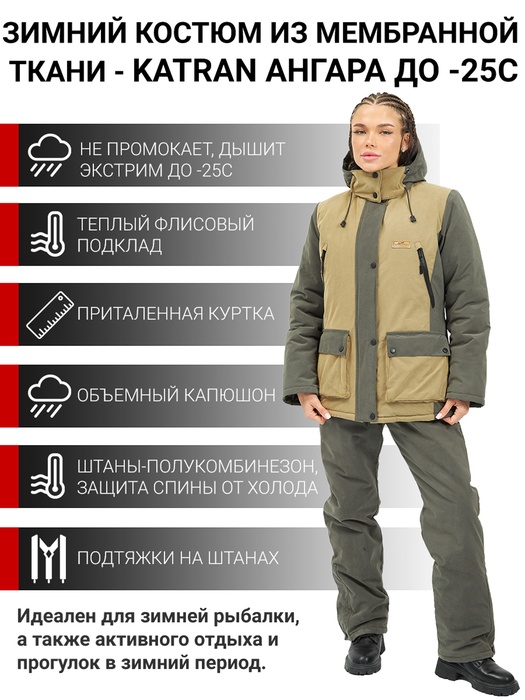 Зимний женский костюм KATRAN АНГАРА — это простой и функциональный костюм из “бесшумной” мембранной ткани Финляндия. Мембрана с высоким показателем 10000⁄10000 защищает от промокания и вентилируется. В качестве утеплителя в костюме используется AirFIBRE. Центральная молния на куртке закрывается на ветрозащитную планку на кнопках. На куртке есть три кармана, два наружных под влагозащитной молнией и один внутренний карман для документов. Подкладка куртки комбинированная и выполнена из флиса и таффеты. Капюшон на куртке имеет регулировку. Утеплитель — AirFIBRE. Стильная куртка средней длины — приталенная. Ветрозащитная планка на кнопках. Кулиски по поясу куртки для регулировки талии. Рукава с манжетами. На костюме расположено 7 карманов на молнии (куртка 5 карманов, штаны 2 карамана). Высокие штаны полукомбинезон с защитой спины. Подтяжки с возможностью регулировки. Штаны с расширением по низу для объемной обуви.