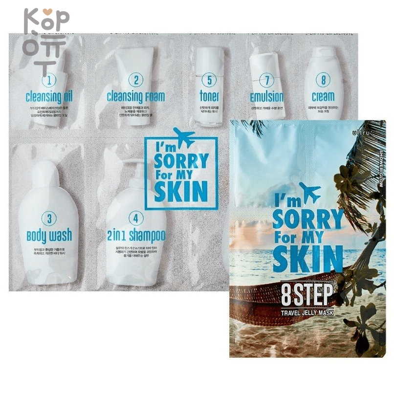 <p>В состав набора входят: очищающее масло, очищающая пенка, гель для душа, шампунь 2 в 1, тонер для лица, маска, эмульсия и крем.</p> <p>I`m Sorry For My Skin 8 Step Travel Jelly Mask оказывает комплексное воздействие:Масло – растворяет макияж любой стойкости.</p> Пенка – бережно очищает кожу.<br> Гель для душа – удаляет всю грязь.<br> Шампунь – освежает и очищает волосы.<br> Тонер – увлажняет и нормализует pH баланс.<br> Маска – интенсивно питает и восстанавливает кожу.<br> Эмульсия – разглаживает и повышает иммунные силы.<br> Крем – обеспечивает полноценное питание и увлажнение.<br> <p>Все средства, входящие в набор от I`m Sorry For My Skin, имеют компактный размер, не занимают много места в дорожной сумке.</p> <p>Применение:</p> 1. Наберите масло в ладони и очищайте лицо без воды. Затем смойте теплой водой.<br> 2. Возьмите небольшое количество пенки и вспеньте с помощью теплой воды. Нанесите на лицо и затем смойте большим количеством теплой воды.<br> 3. Возьмите небольшого количества геля для душа, вспеньте и нанесите на тело. Затем тщательно смойте.<br> 4. Нанесите шампунь на влажные волосы и вспеньте. Затем, тщательно промойте волосы.<br> 5. Нанесите тоник на кожу лица, шеи и зону декольте.<br> 6. До вскрытия упаковки, равномерно распределите средство по всей маске. Вскройте упаковку, достаньте маску и наложите на лицо, избегая область вокруг глаз и губ. Снимите маске через 10-20 минут и вмассируйте остатки сыворотки в кожу похлопывающими движениями.<br> 7. Возьмите необходимое количество эмульсии и нанесите на кожу лица.<br> 8. Возьмите необходимое количество крема и нанесите на кожу лица.<br> <p></p>