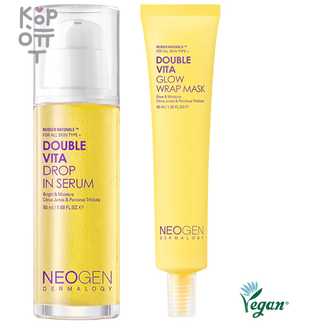 Витамин С Осветляет тусклую кожу<br> Помогает сохранять кожу увлажненной в течение всего дня.<br> Помогает восстановить силы<br> 8 Гиалуроновых кислот Обеспечивает ощущение сильного увлажнения <br> Ощущение питания и сияния<br> Маска-обертывание NEOGEN DERMALOGY Double Vita Glow Витамин С Осветляет тусклую кожу<br> Помогает сохранять кожу увлажненной в течение всего дня.<br> Помогает восстановить силы<br> 8 растительных масел: масло семян моринги масличной, масло семян макадамии, масло семян манго (мангиферы индийской), льняное масло, оливковое масло, масло виноградных косточек, масло грецкого ореха, масло семян жожоба (симмондсии китайской) Успокаивает омертвевшие клетки кожи вокруг щек и носа.<br> Придает сияющий и здоровый вид.<br> <p>Как использовать:</p> <p> NEOGEN DERMALOGY Double Vita Drop In Сыворотка После использования тонера возьмите необходимое количество средства и аккуратно распределите по коже для лучшего впитывания. <br></p> <p><br></p> <p> Маска-обертывание NEOGEN DERMALOGY Double Vita Glow <br></p> <p><br></p> <p> 1. Нанесите легкими движениями на зону «бабочки», где сосредоточены проблемные участки кожи (щеки, нос и т. д.).<br><br>2. Оставьте на 15–30 минут, давая эссенции впитаться, затем снимите прозрачную маску, начиная с краев.</p> <p></p>