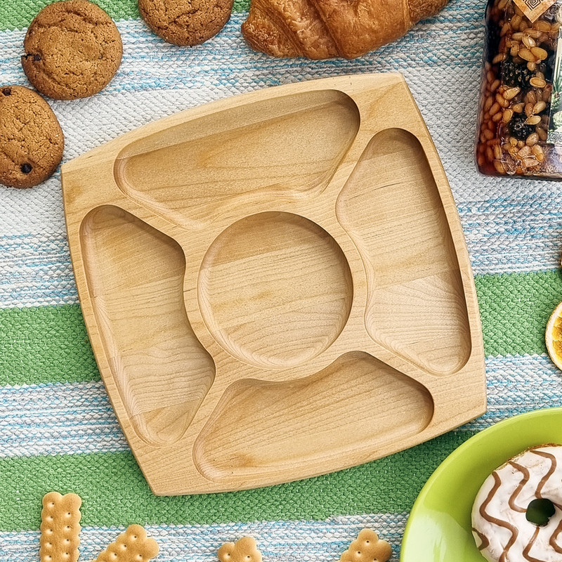 Менажница “Квадрат”, в стандартном исполнении размер 250х250мм, высота 18 мм, материал береза, на заказ из любой породы дерева и размера.